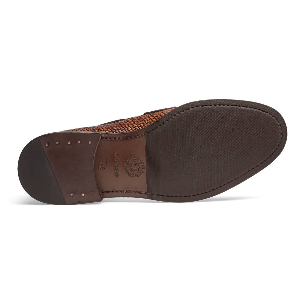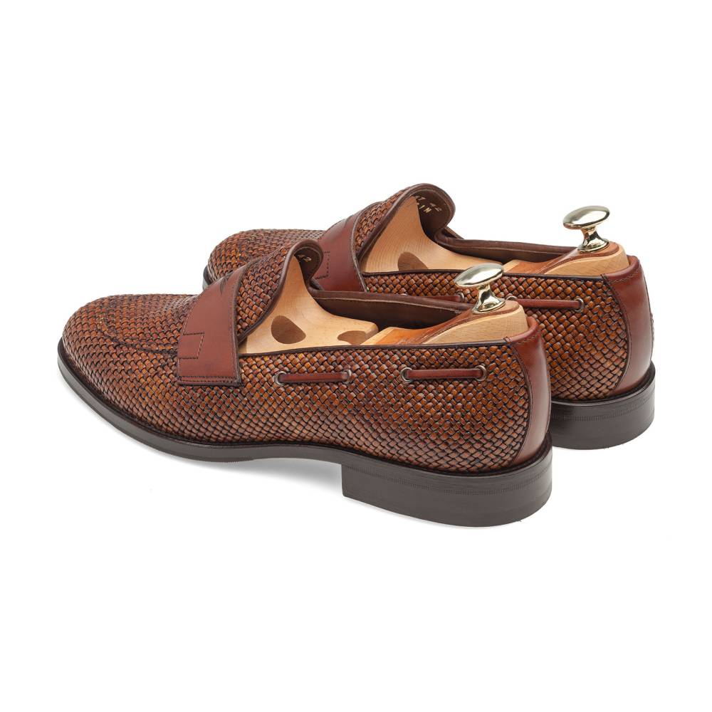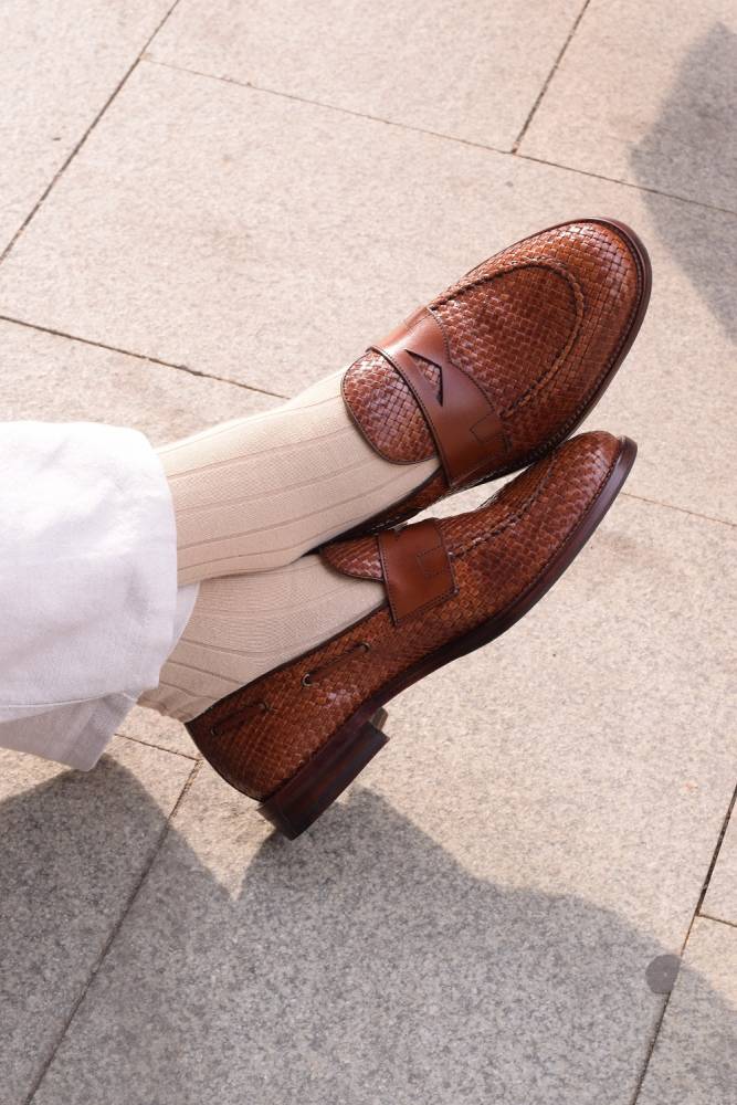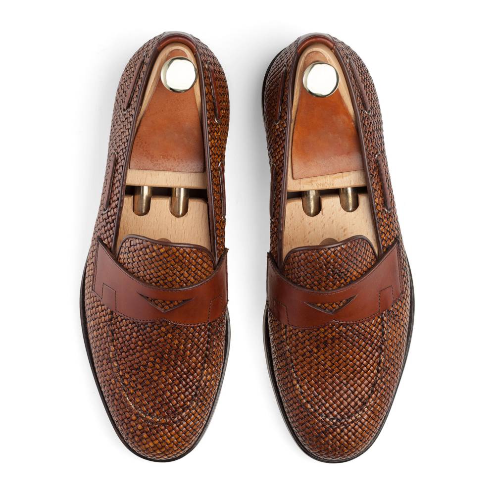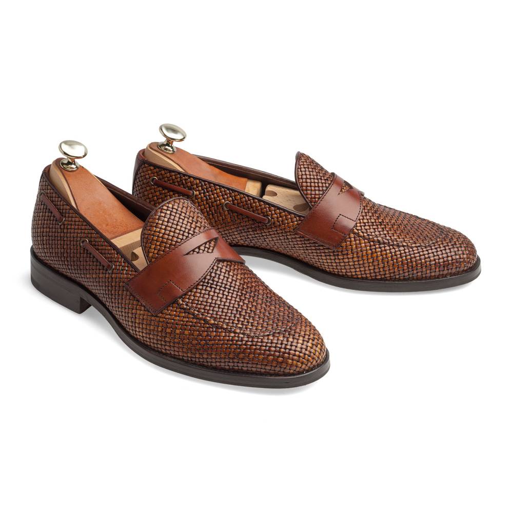 Лёгкие летние пенни-лоферы коричневого цвета испанской марки Artisan. Верх сплетён из узких полосок кожи в шахматном порядке, что позволяет ноге «дышать». Внутренняя отделка из лёгкого текстиля. Модель прошита по технологии Blake. Подошва кожаная с заводской профилактикой из резины.