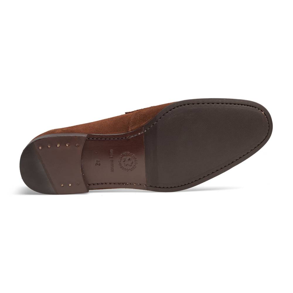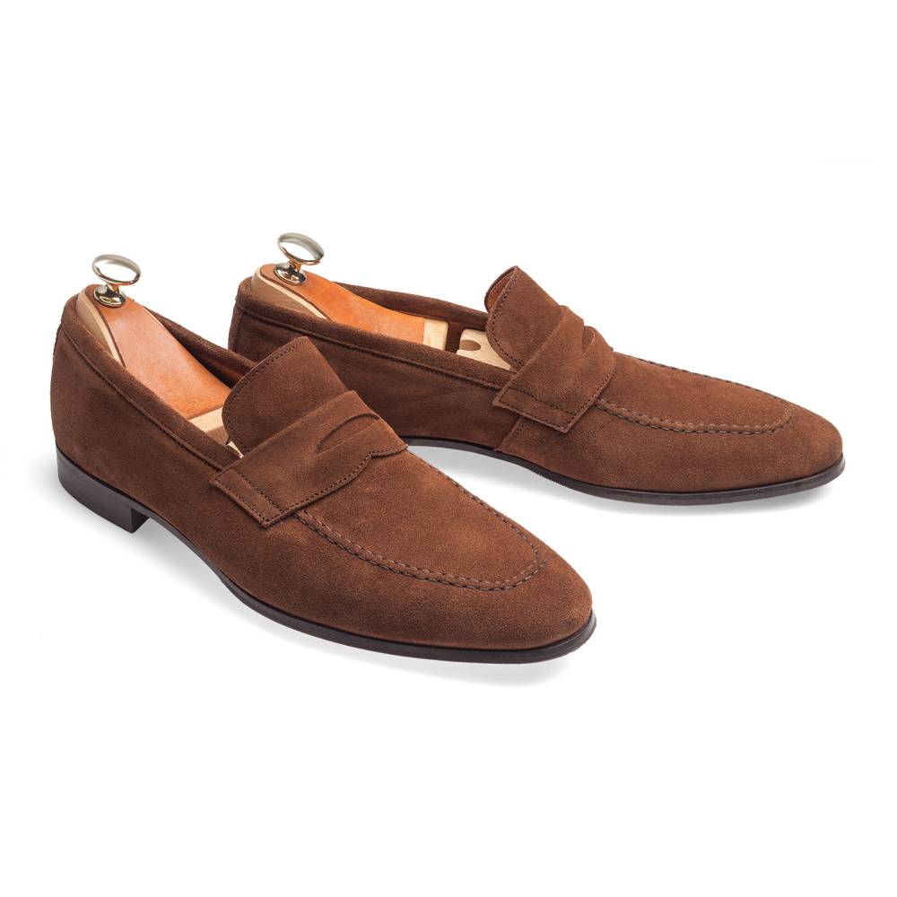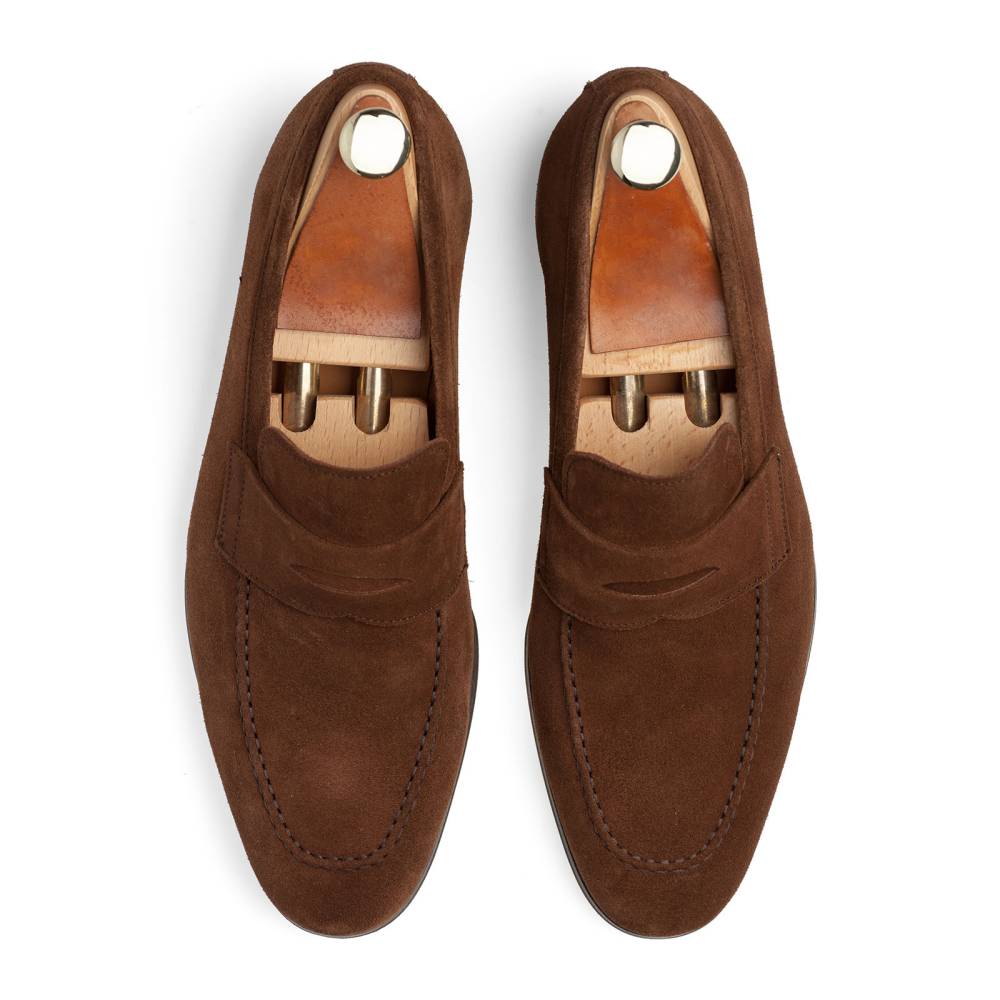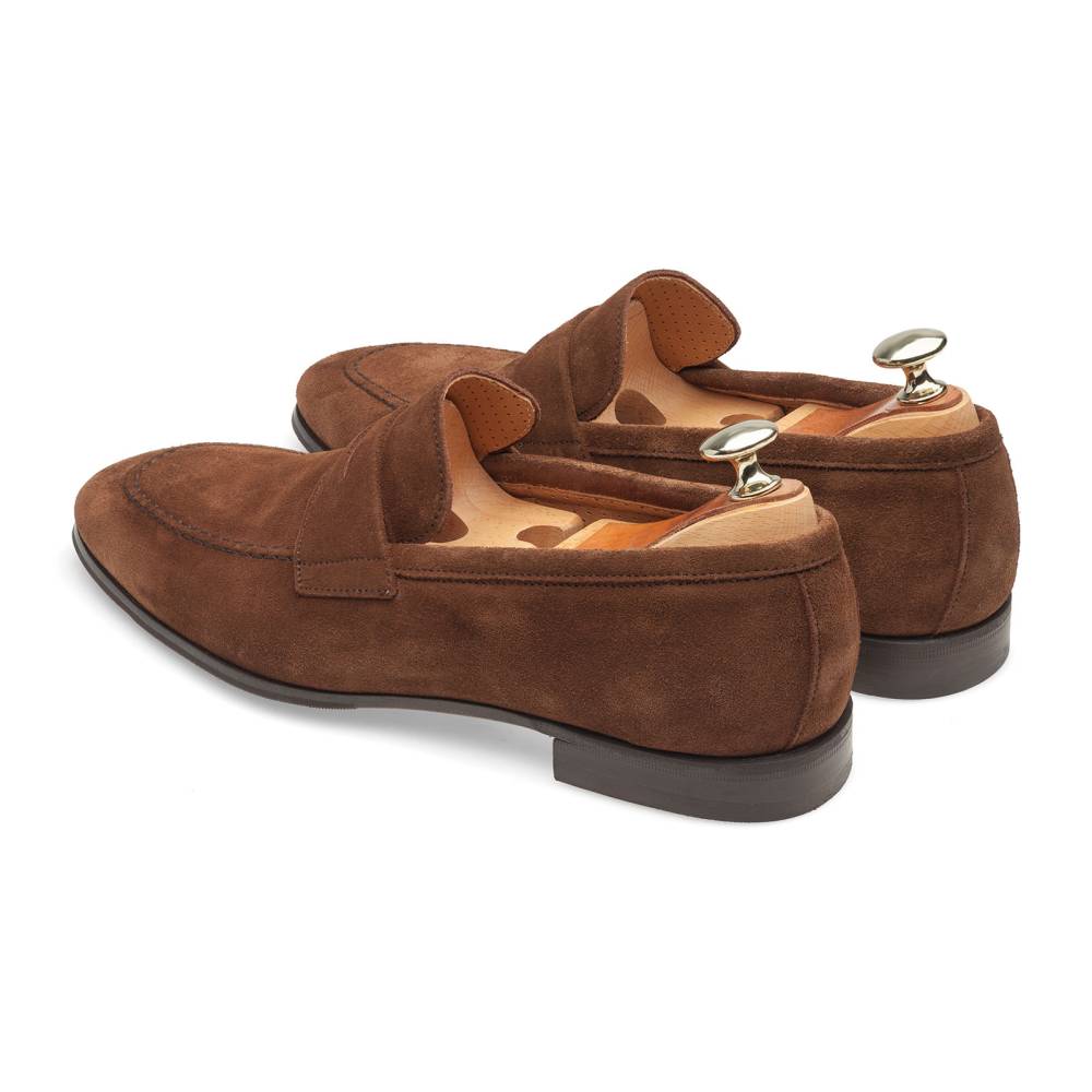 Лёгкие пенни-лоферы испанской марки Artisan на тонкой кожаной подошве с заводской профилактикой из резины. Верх выполнен из мягкой бархатистой замши тёмно-коричневого цвета. Внутренняя отделка из тонкой гладкой кожи. Конструкция Blake.