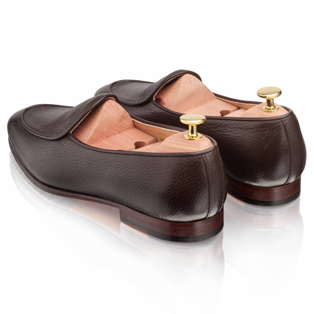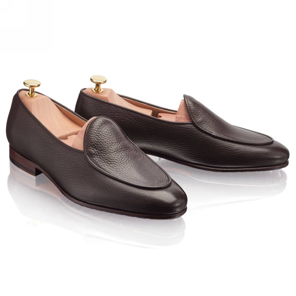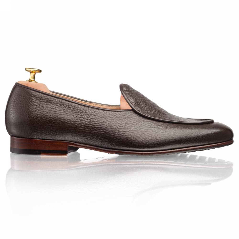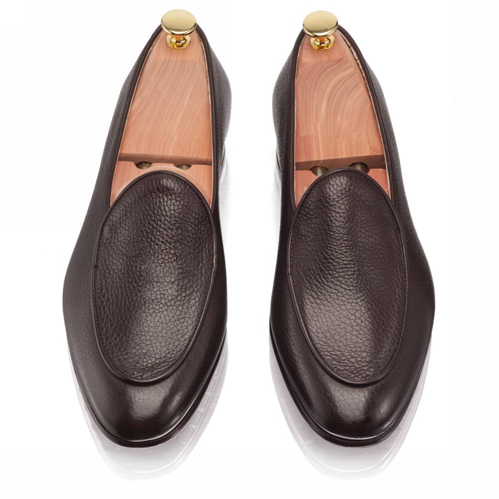 Элегантные бельгийские лоферы Artisan на тонкой кожаной подошве с резиновой профилактикой. Превосходный вариант для неформального, но сдержанного гардероба в тёплую погоду. Особенностью такого типа обуви являются плавные овальные линии мыса и аккуратная окантовка швов. Верх выполнен из мягкой телячьей кожи тёмно-коричневого цвета с зернистой фактурой. Тонкая кожаная подкладка. Конструкция Blake.