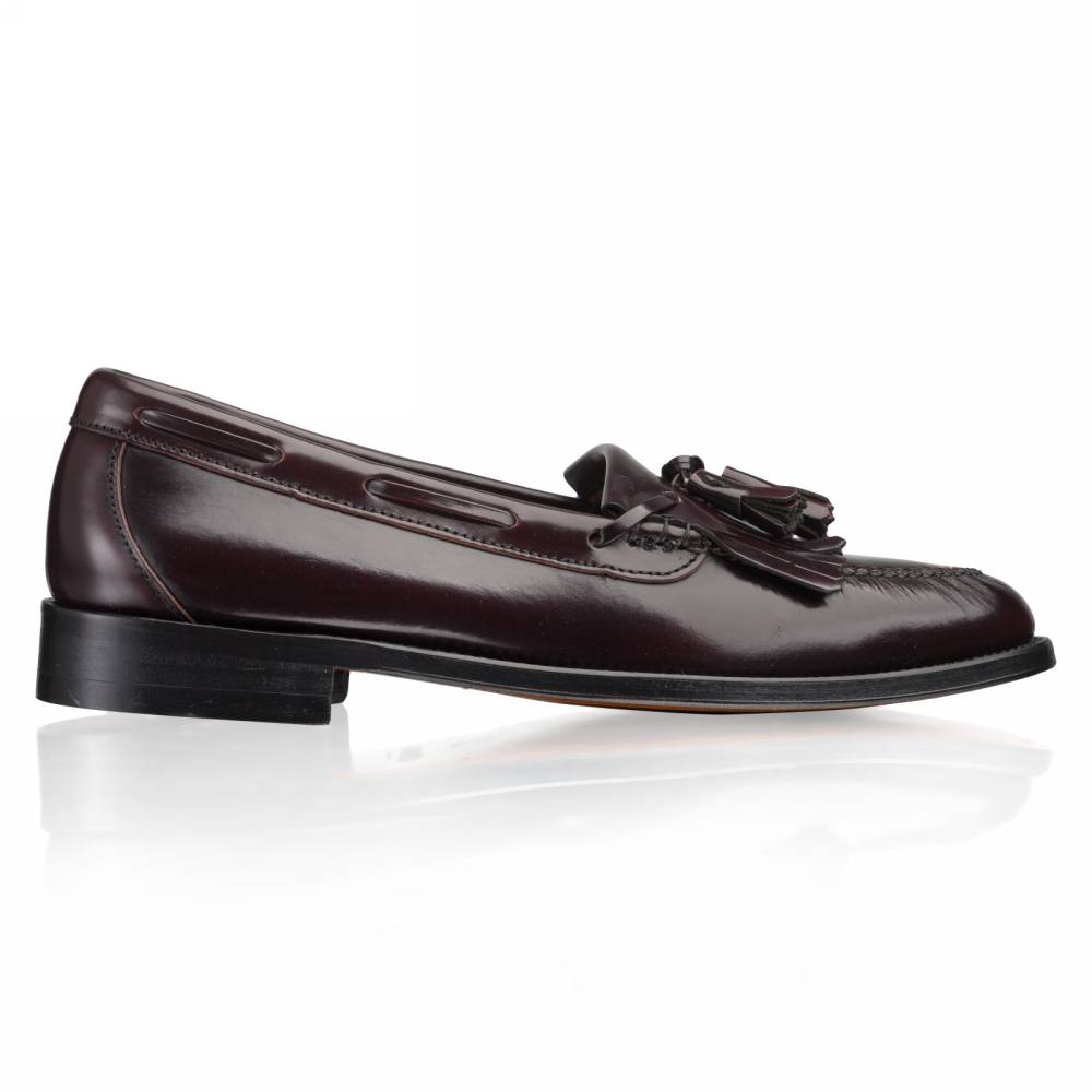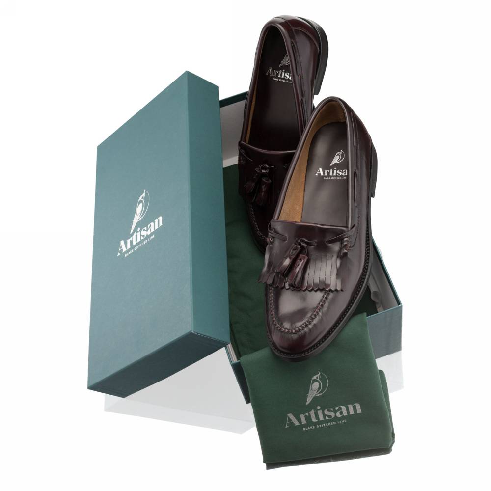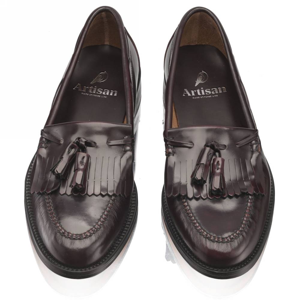 Лоферы Campus бренда Artisan из плотной полированной телячьей кожи благородного бордового оттенка. Пара снабжена тонкой кожаной подошвой. Верх украшен кисточками и бахромой (килти), которые отдаленно напоминают дизайн традиционной обуви коренных жителей Америки. В середине XX века такая модель вошла в неформальный гардероб студентов престижных университетов и мужчин более старшего возраста и с тех пор стала прочно ассоциироваться с американской классикой. Мокасинный шов выполнен вручную. Конструкция Blake.