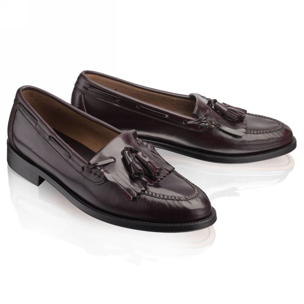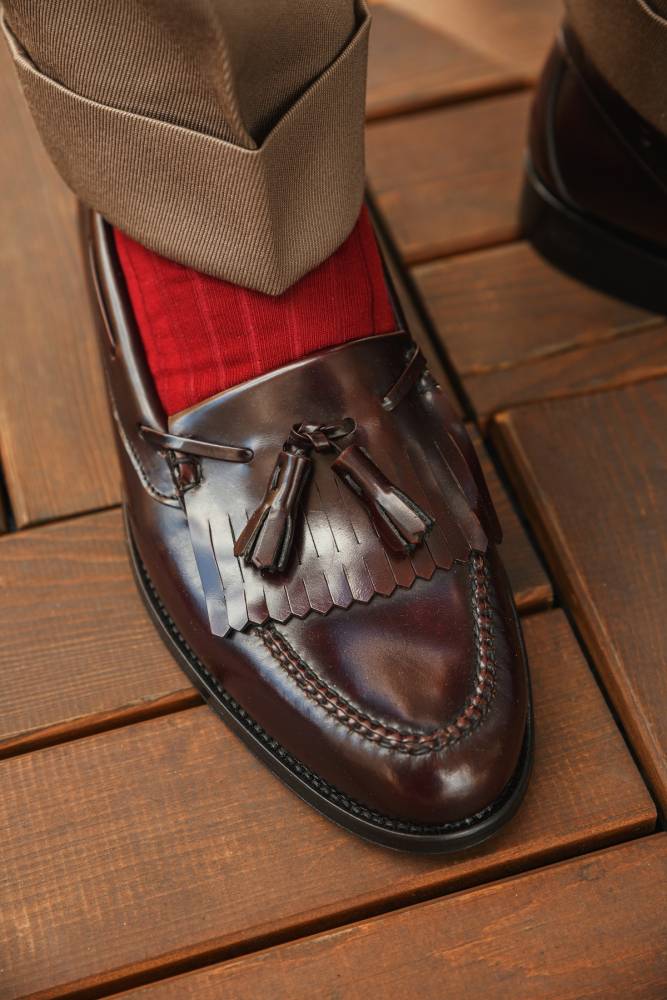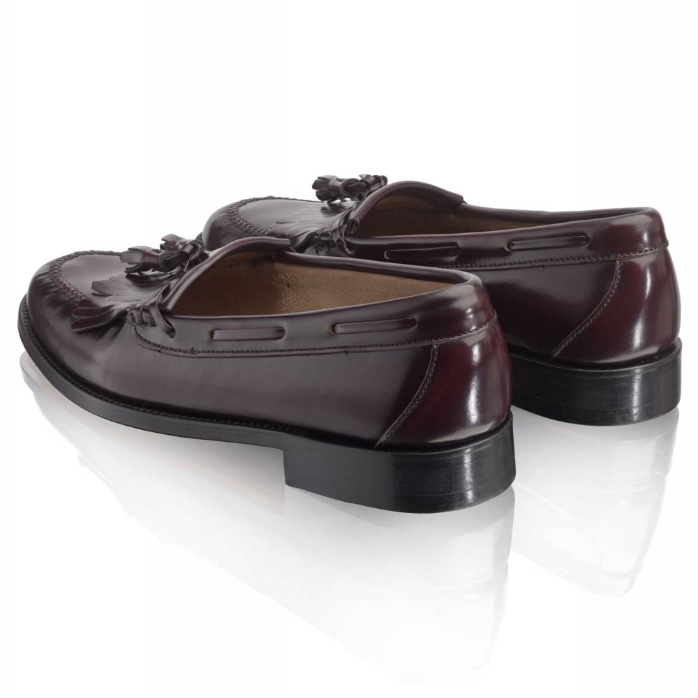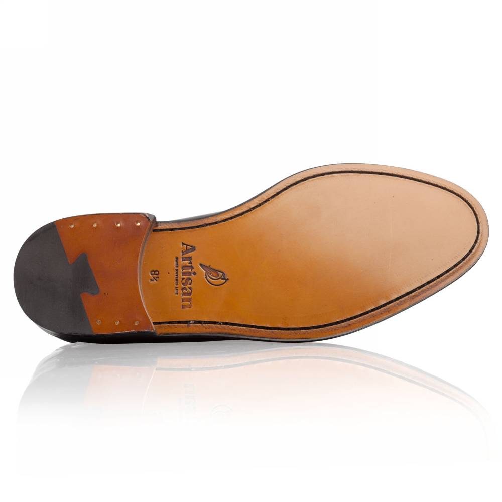 Лоферы Campus бренда Artisan из плотной полированной телячьей кожи благородного бордового оттенка. Пара снабжена тонкой кожаной подошвой. Верх украшен кисточками и бахромой (килти), которые отдаленно напоминают дизайн традиционной обуви коренных жителей Америки. В середине XX века такая модель вошла в неформальный гардероб студентов престижных университетов и мужчин более старшего возраста и с тех пор стала прочно ассоциироваться с американской классикой. Мокасинный шов выполнен вручную. Конструкция Blake.