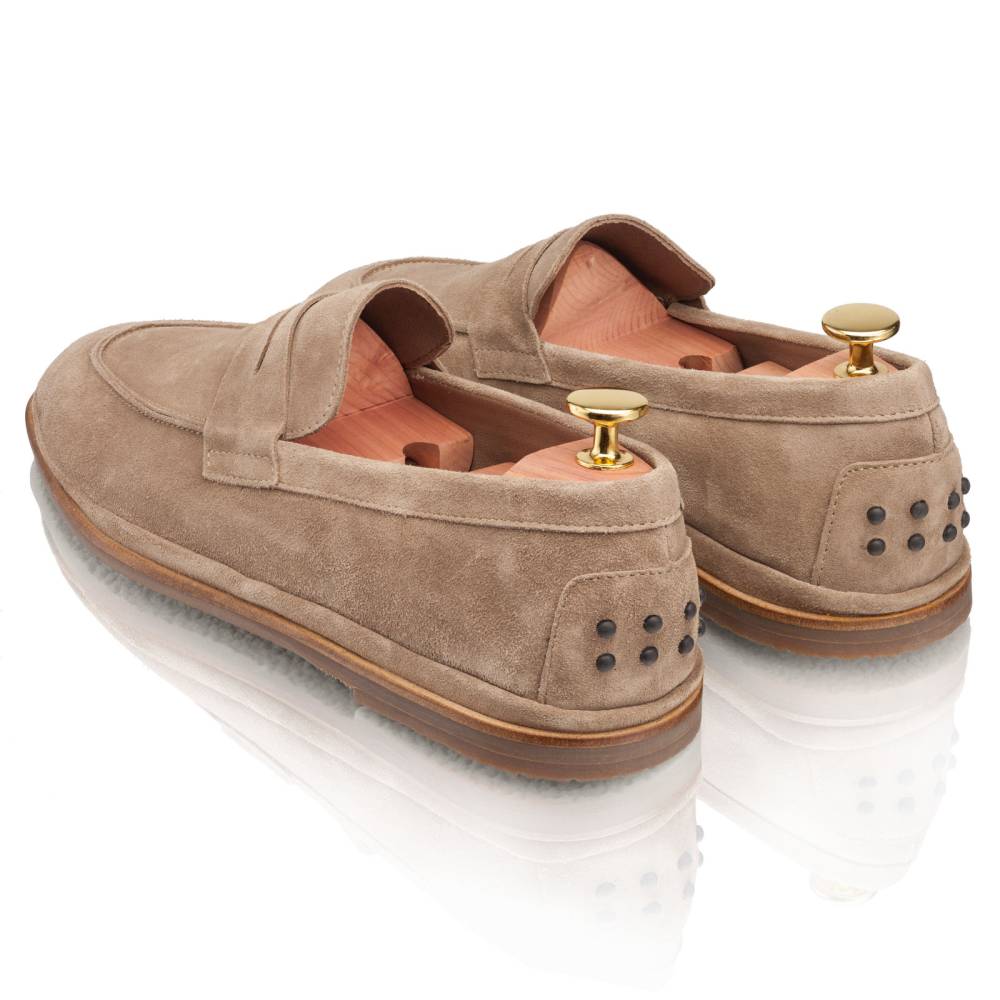 Мягкие мужские лоферы Artisan на тонкой резиновой подошве по стилю и удобству схожие с мокасинами. Верх выполнен из замши серого цвета. Подкладка из тонкой гладкой кожи. Задник лоферов дополнен резиновыми шишечками, которые обеспечивают хорошее сцепление с педалью автомобиля и защищают замшу от трения. Модель создана на широкой колодке, поэтому может подойти для объёмной стопы с высоким подъёмом. Сшита в мягкой и гибкой конструкции, когда части верха сшиваются между собой, а затем выворачиваются, образуя бесшовную композицию. Над подошвой виден край этого шва, который также является оригинальной частью дизайна.