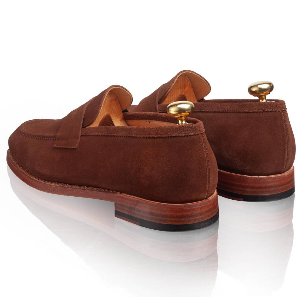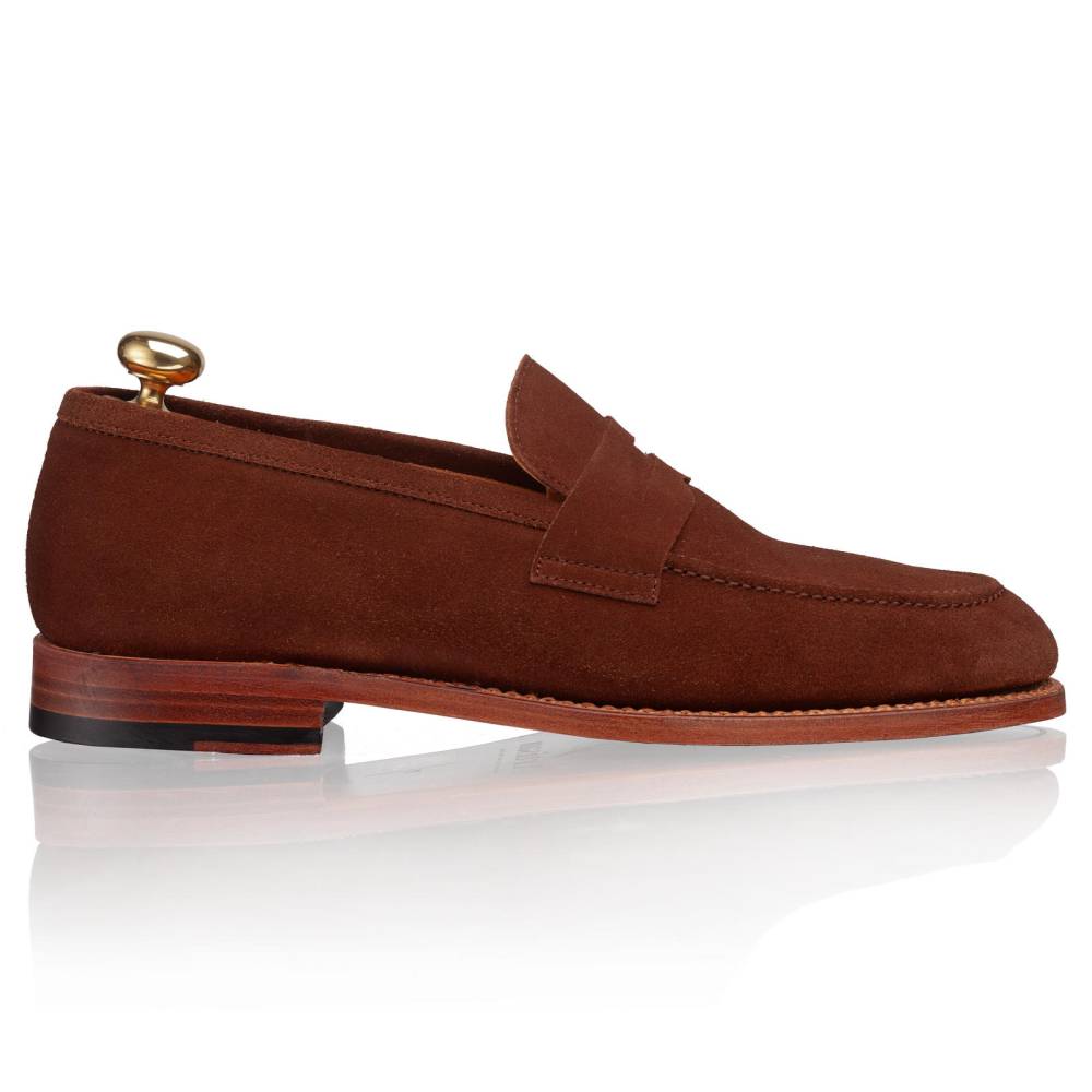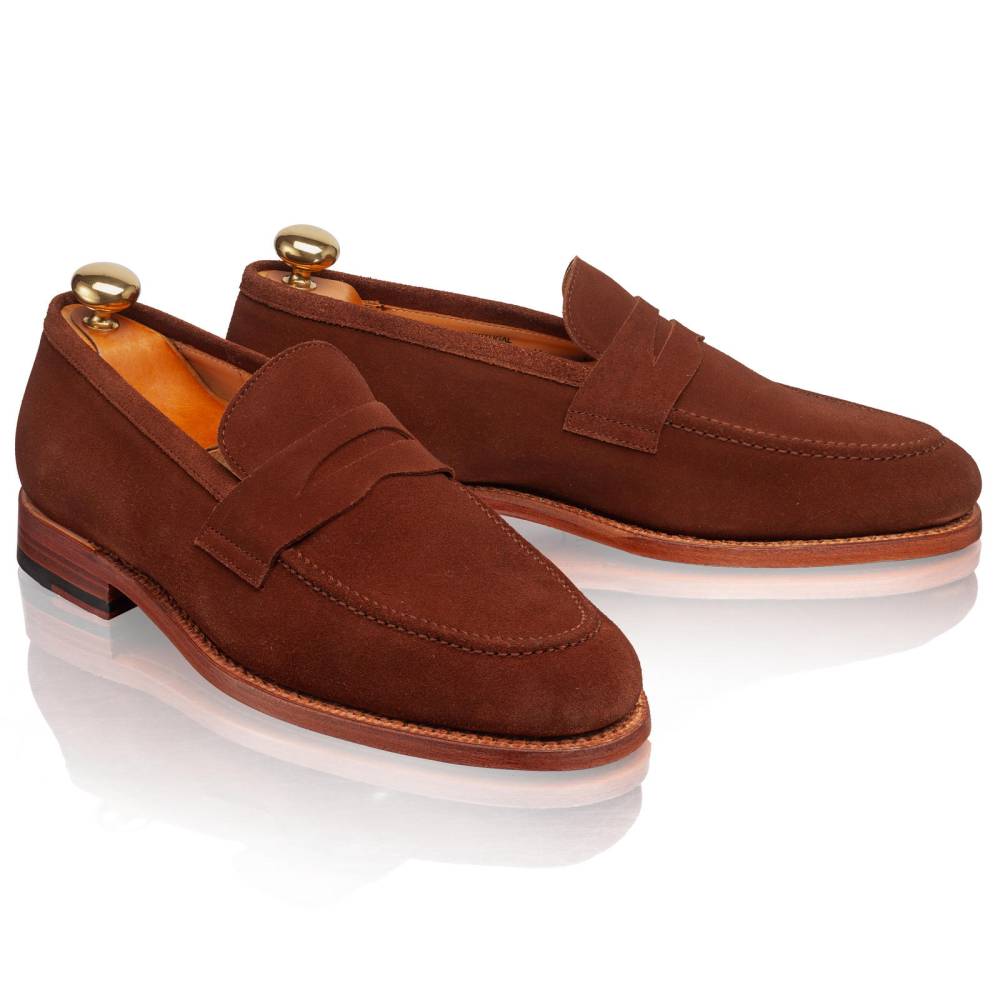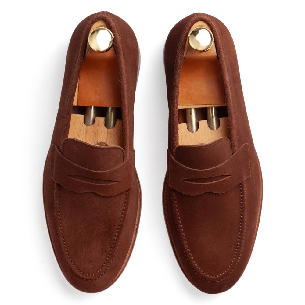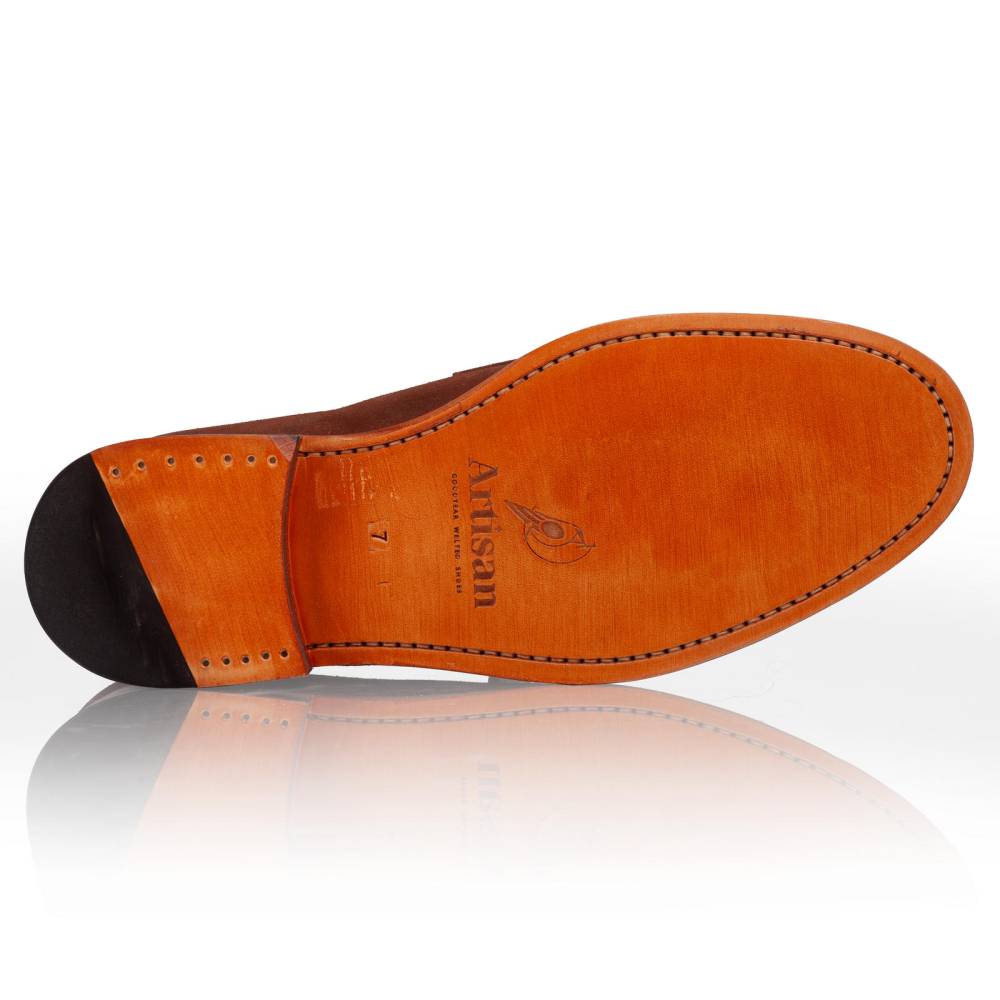 Элегантные пенни-лоферы Garda бренда Artisan выполнены из мягкой приятной на ощупь замши коричневого цвета с тонкой подкладкой из кожи растительного дубления. Область пятки с внутренней стороны с шероховатой поверхностью, чтобы стопа лучше фиксировалась при ходьбе. Особенностью модели является контрастная кожаная подошва натурального цвета. Лоферы сшиты на семейном обувном предприятии в Португалии в конструкции Goodyear Welted.