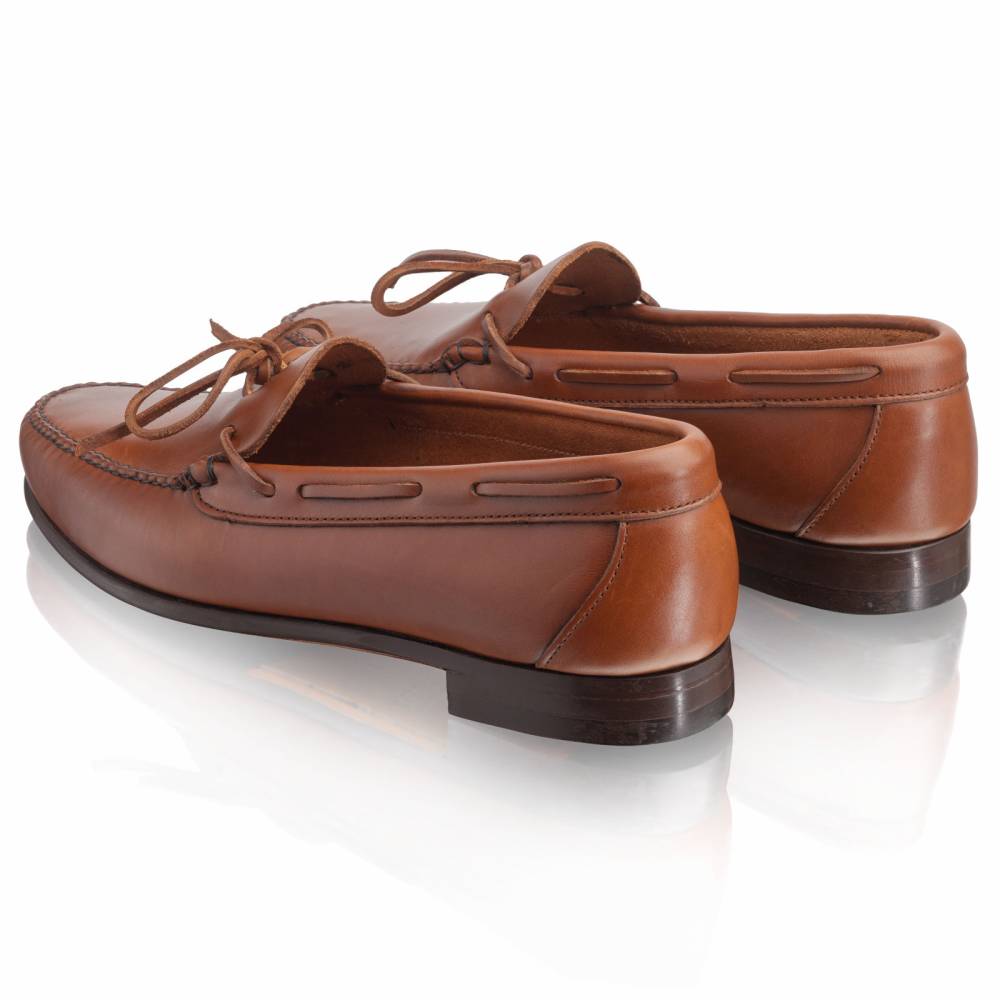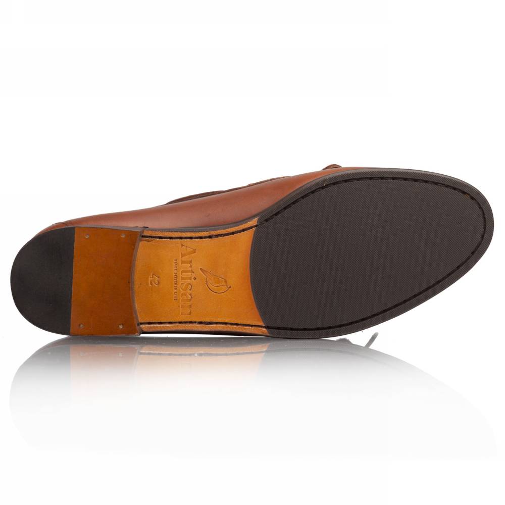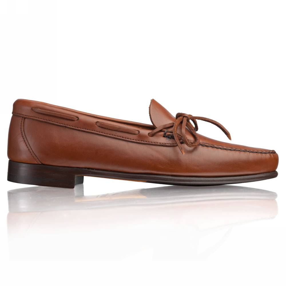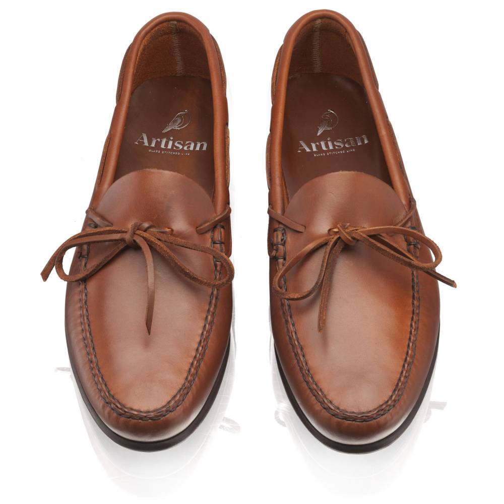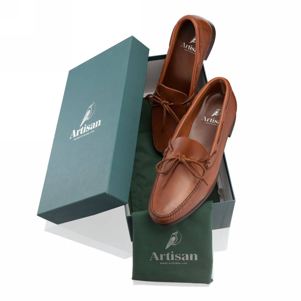 Оригинальные лоферы ручной работы Navajo бренда Artisan на тонкой кожаной подошве с резиновой профилактикой. Верх выполнен из плотной телячьей кожи светло-коричневого цвета. Внутри тонкая подкладка из кожи. Дизайн модели вдохновлён обувью коренных народов Америки, поэтому пара напоминает традиционные мокасины. Модель украшена кожаным шнурком, завязывающимся на подъёме. Затяжка на колодке и шов на мыске выполнены по традиционной технологии вручную. Конструкция Blake.