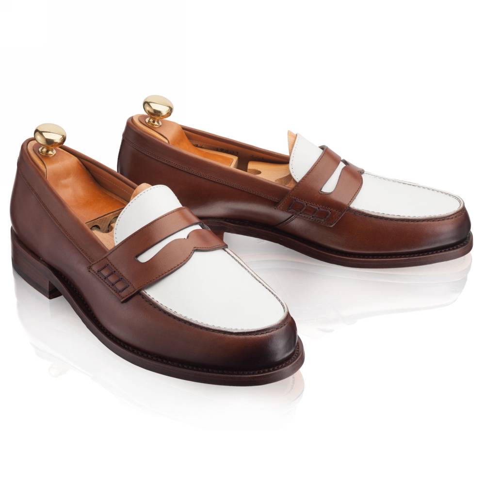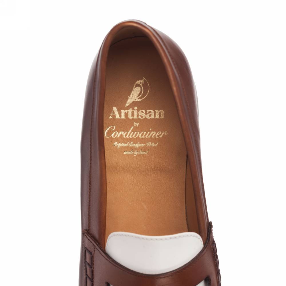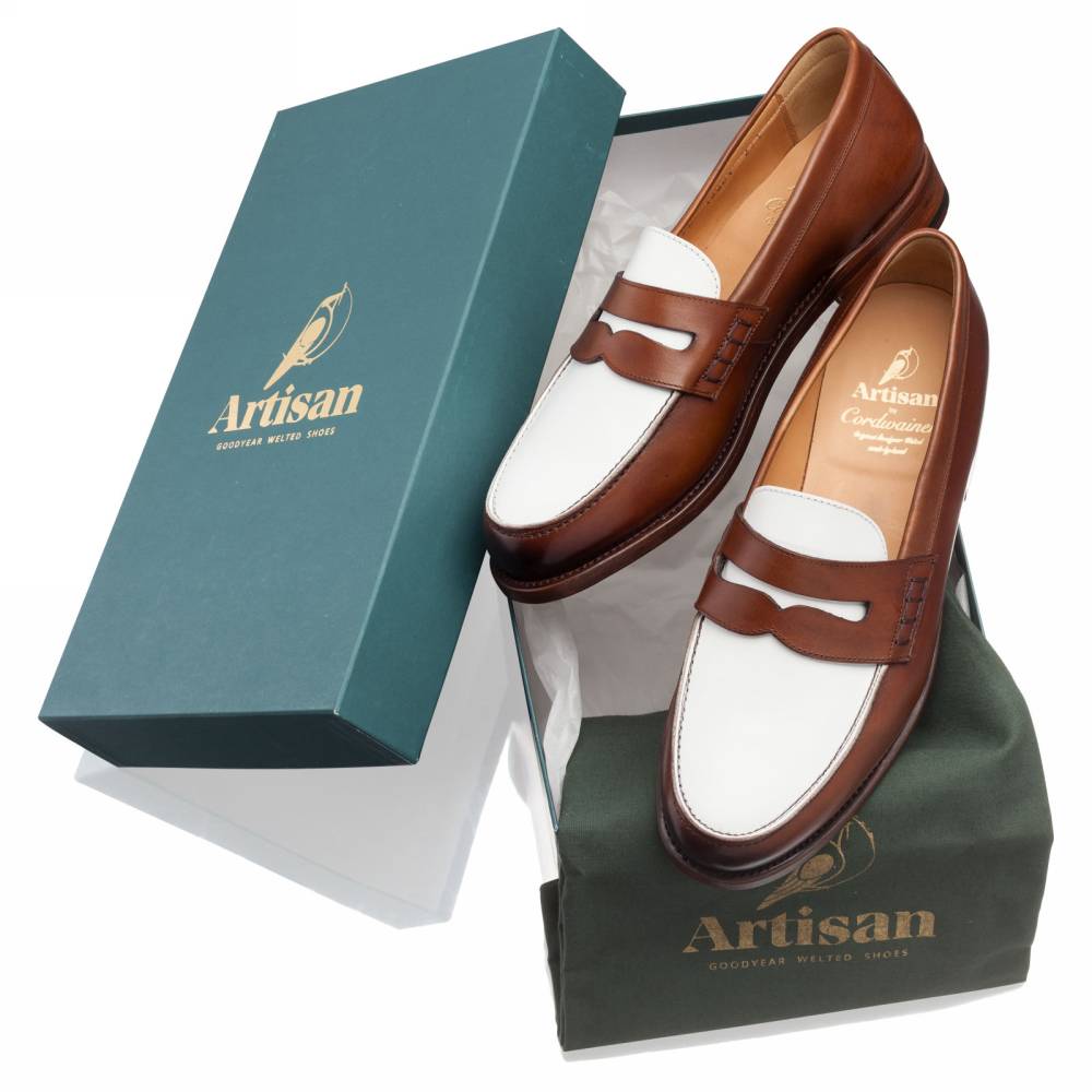 Классические двухцветные пенни-лоферы бренда Artisan из гладкой телячьей кожи белого и коричневого цвета. Модель изготовлена по специальному заказу на испанской фабрике Cordwainer в городе Альманса – центре обувной промышленности Испании. Внутренняя отделка из тонкой кожи. На данную пару установлена высококачественная кожаная подошва от знаменитой немецкой мануфактуры Joh. Rendenbach. Конструкция Goodyear Welted.