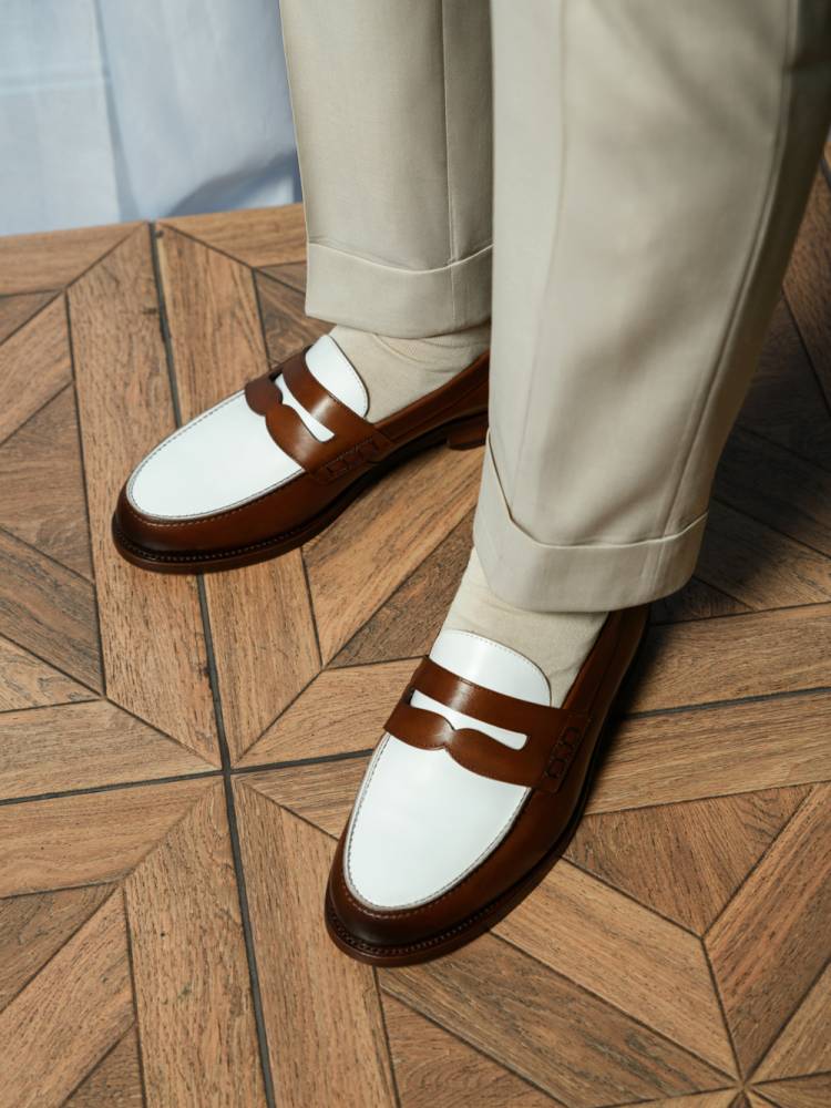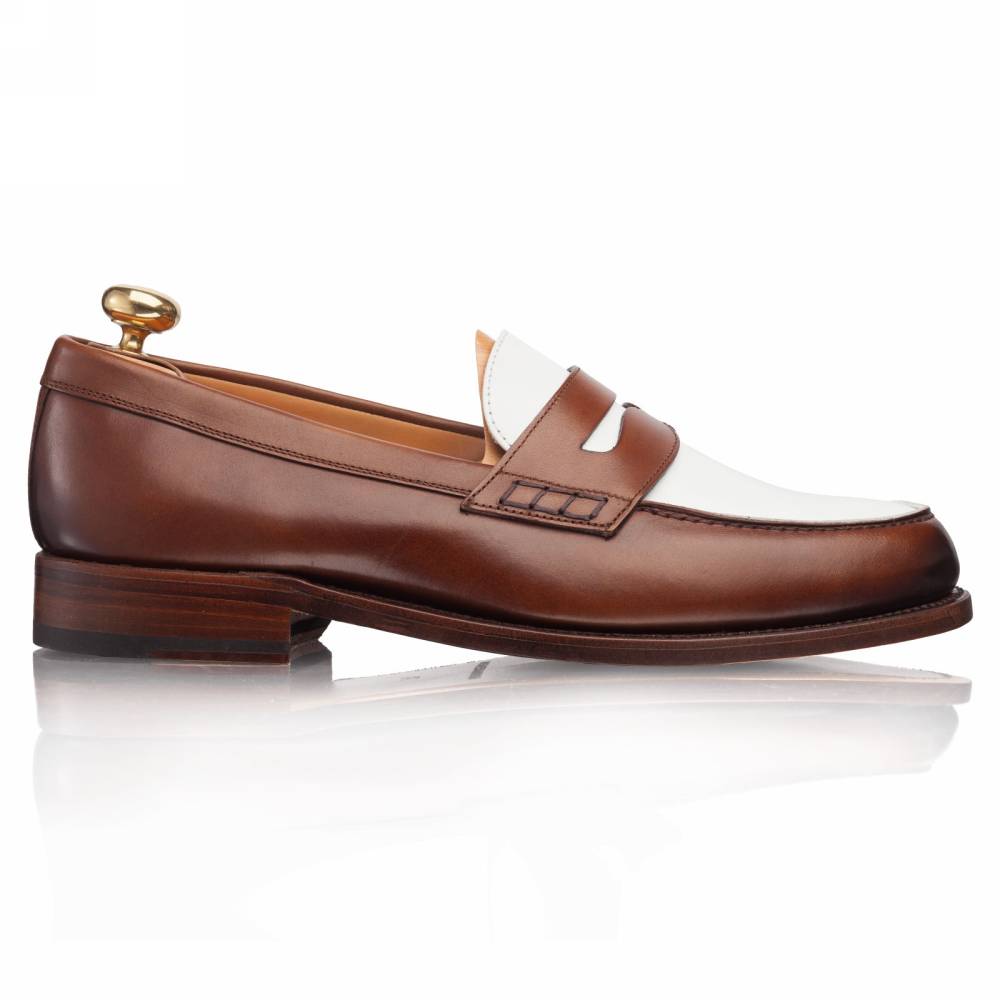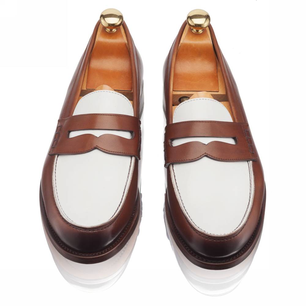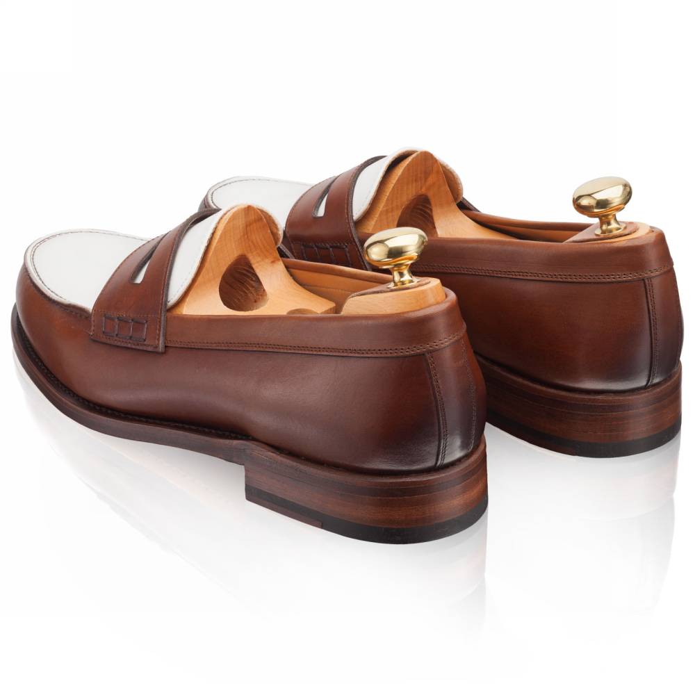 Классические двухцветные пенни-лоферы бренда Artisan из гладкой телячьей кожи белого и коричневого цвета. Модель изготовлена по специальному заказу на испанской фабрике Cordwainer в городе Альманса – центре обувной промышленности Испании. Внутренняя отделка из тонкой кожи. На данную пару установлена высококачественная кожаная подошва от знаменитой немецкой мануфактуры Joh. Rendenbach. Конструкция Goodyear Welted.