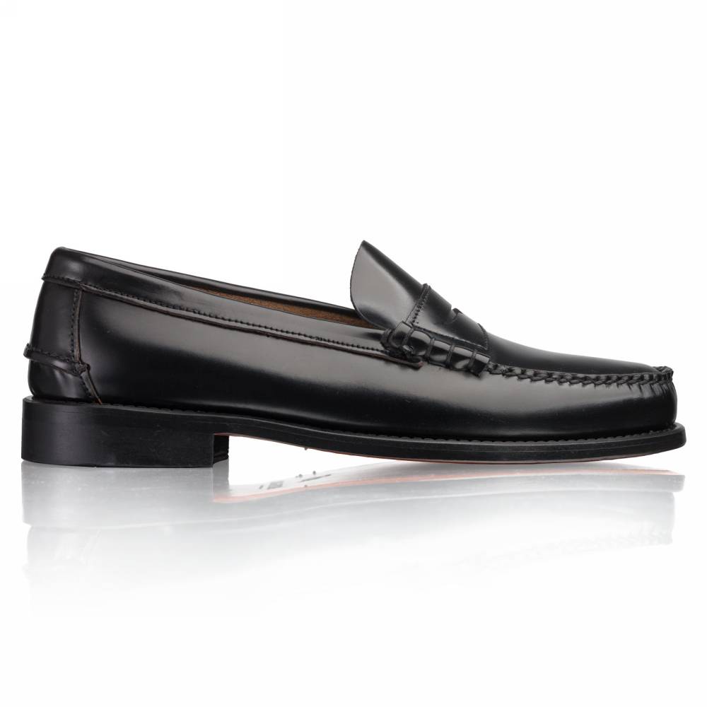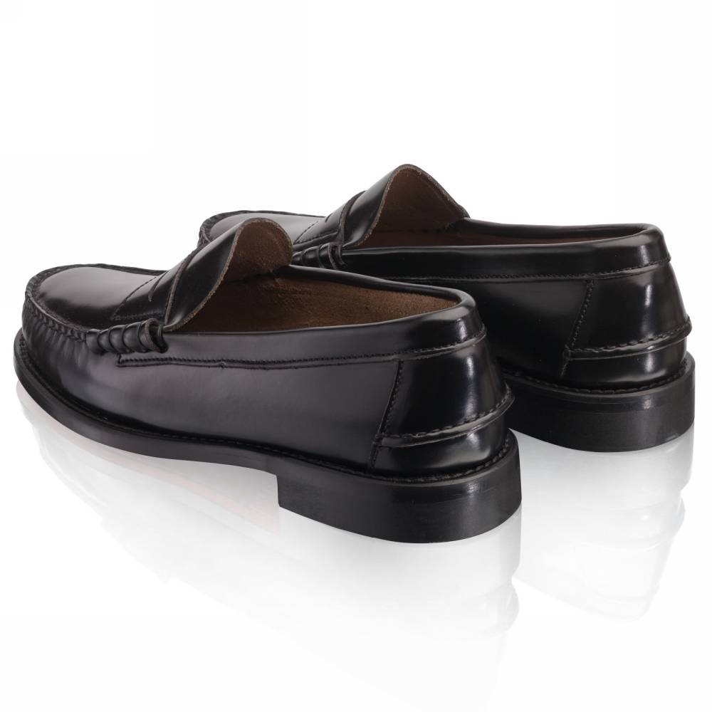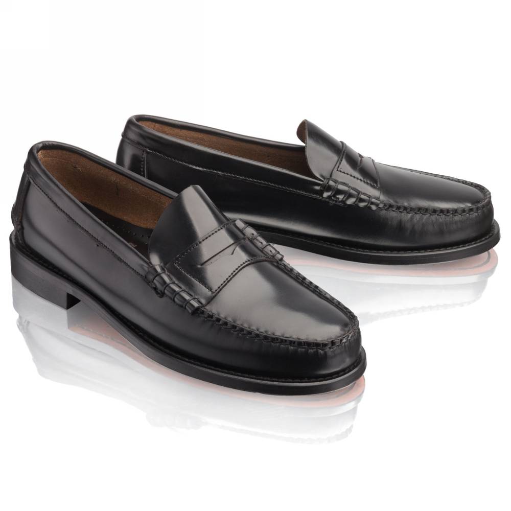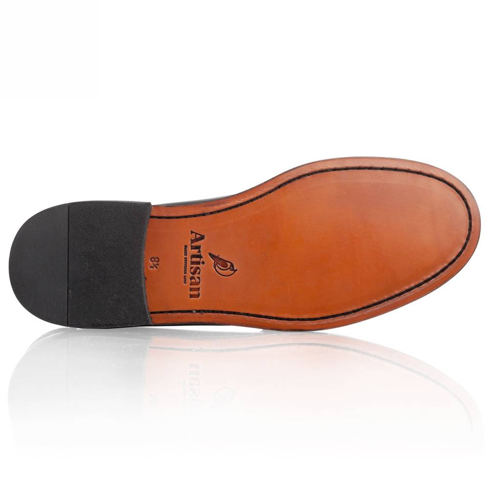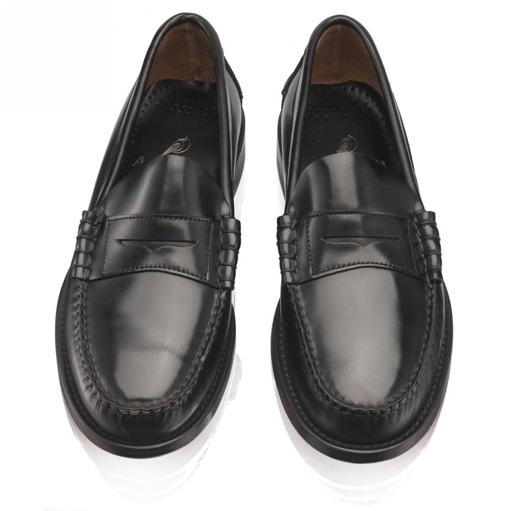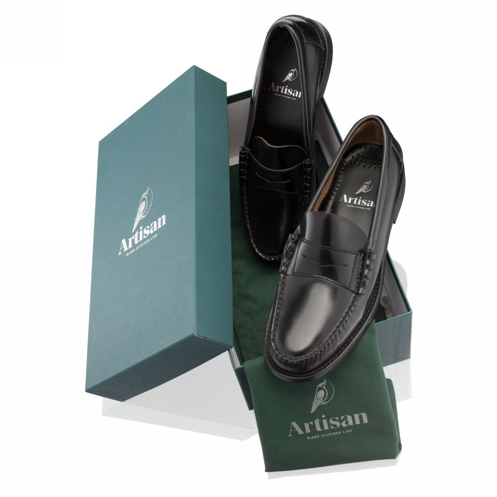Мужские пенни-лоферы Princeton бренда Artisan из плотной полированной телячьей кожи чёрного цвета. Лоферы такого фасона (weejun) появились в коллекции американского бренда G.H. Bass в 1934 году и скоро стали классическим элементом гардероба. В середине XX века такая модель вошла в неформальный гардероб студентов престижных университетов и мужчин более старшего возраста и с тех пор стала прочно ассоциироваться с американской классикой. Мокасинный шов выполнен вручную. Конструкция Blake.