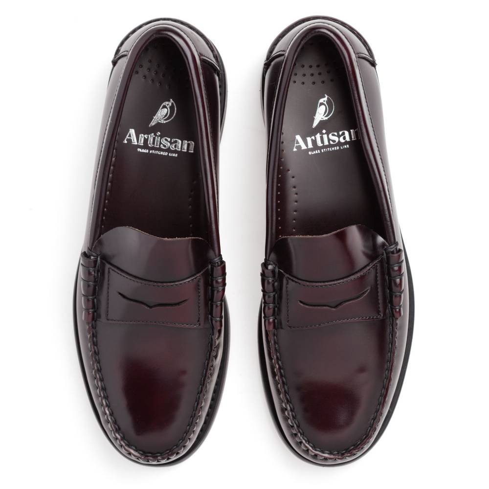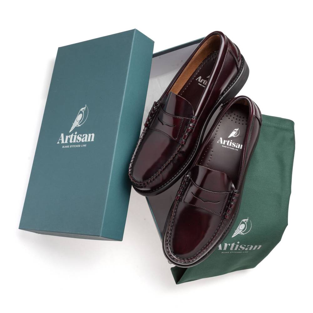 Мужские пенни-лоферы Princeton бренда Artisan из плотной полированной телячьей кожи бордового цвета. Лоферы такого фасона (weejun) появились в коллекции американского бренда G.H. Bass в 1934 году и скоро стали классическим элементом гардероба. В середине XX века такая модель вошла в неформальный гардероб студентов престижных университетов и мужчин более старшего возраста и с тех пор стала прочно ассоциироваться с американской классикой. Мокасинный шов выполнен вручную. Конструкция Blake.