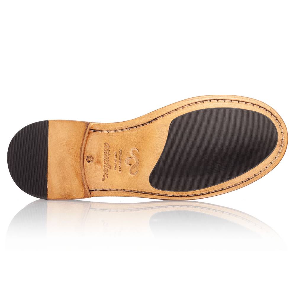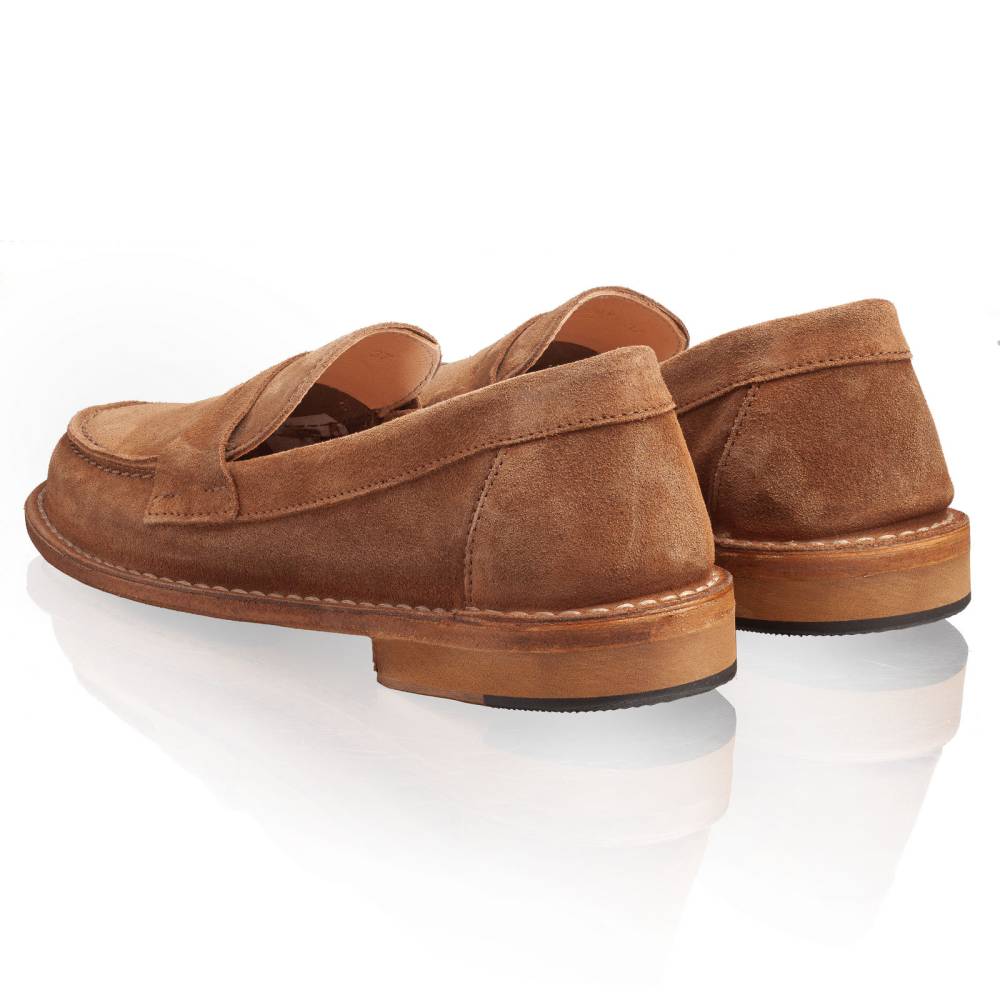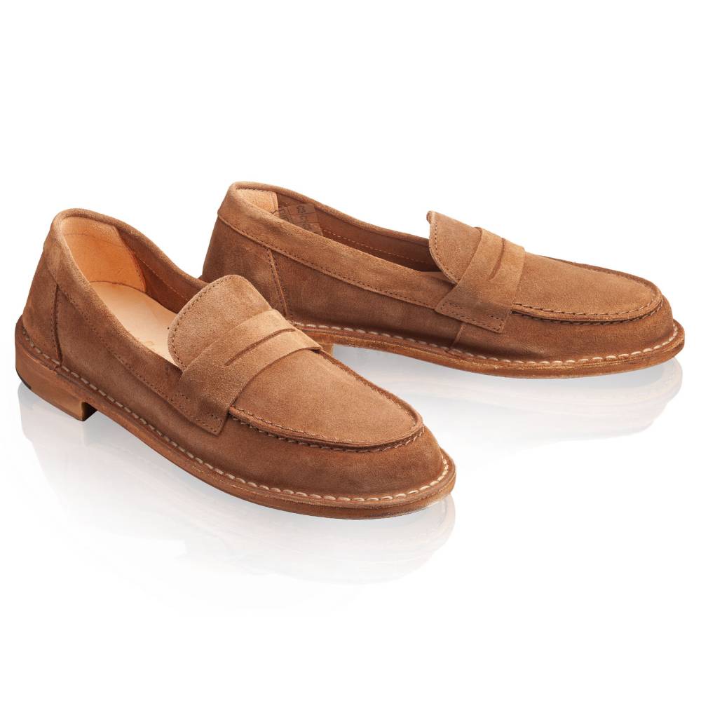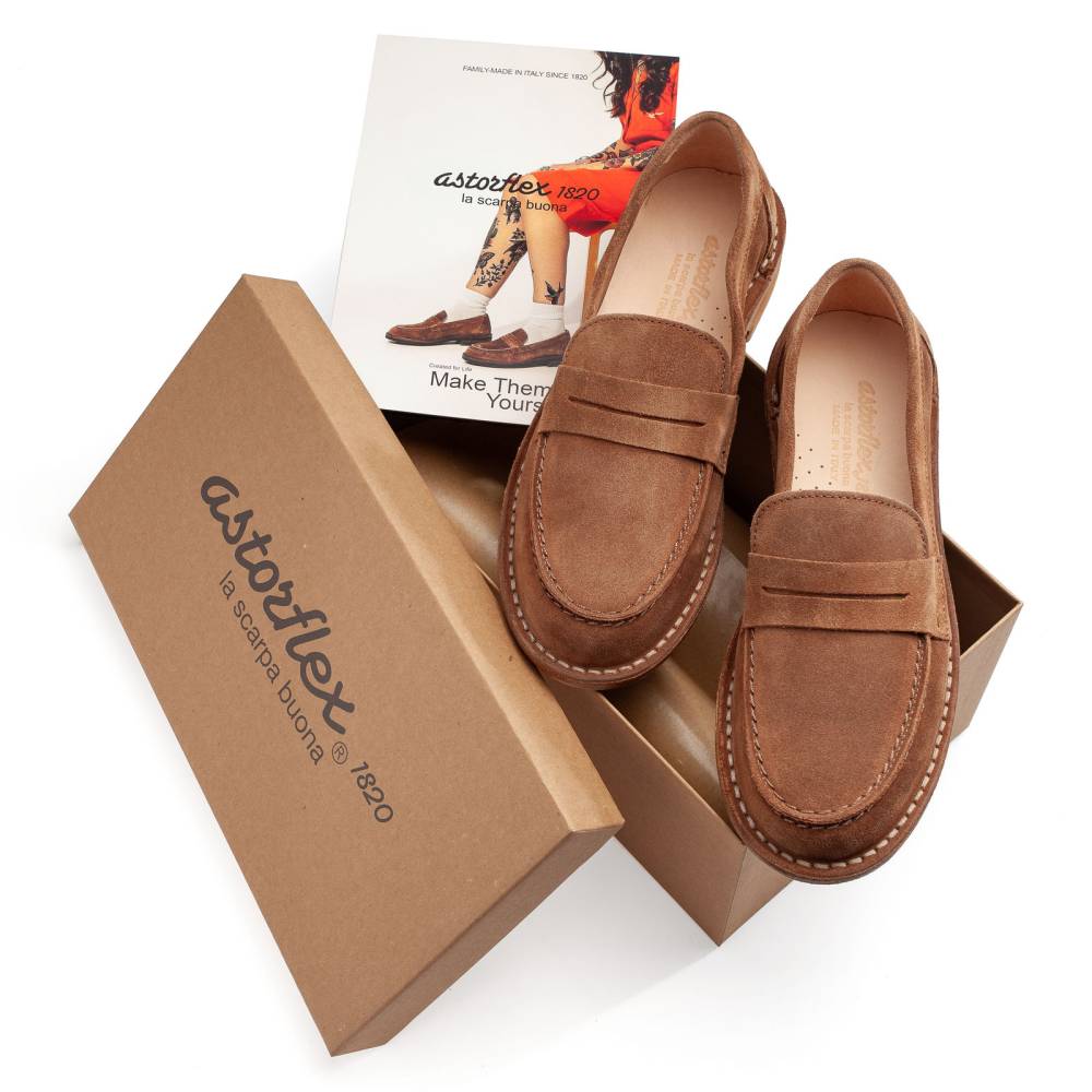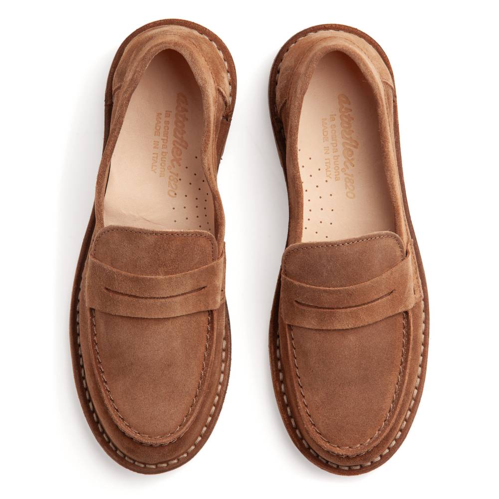 Комфортные женские пенни-лоферы Eleflex итальянской марки Astorflex. Верх выполнен из тонкой тосканской замши коричневого цвета с ворсистой фактурой и минимальной отделкой из кожи растительного дубления в качестве подкладки. Модель имеет съёмную стельку из кожи и пены с эффектом памяти (memory foam). Подошва выполнена из толстой, но гибкой буйволиной кожи натурального цвета со вставкой из резины. Обувь сшита в прочной влагостойкой конструкции stitch-down (доппельный метод крепления).