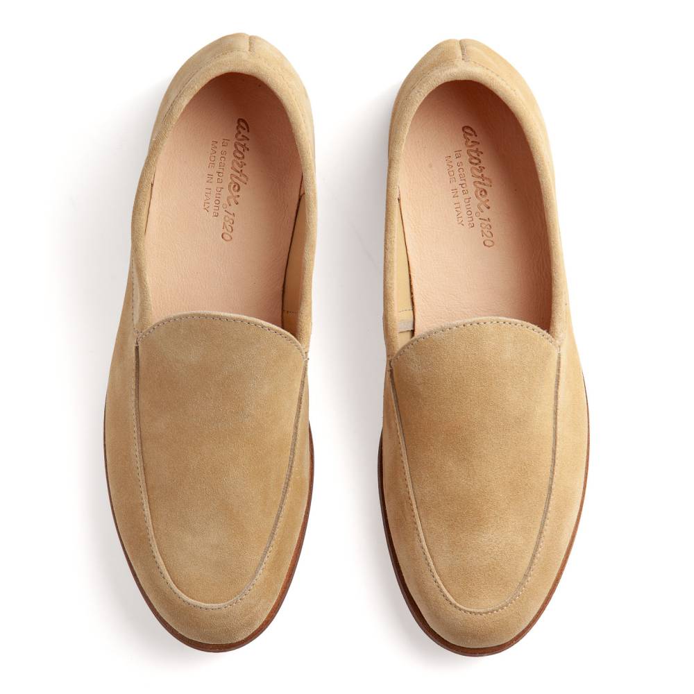Мягкие лаунжевые лоферы итальянского бренда Astorflex лаконичного дизайна. Верх выполнен из высококачественной полноценной выворотной кожи бежевого цвета. С внешней стороны — бархатистая ворсистая поверхность, а с внутренней — гладкий лицевой слой кожи. Модель имеет съёмную стельку из кожи и пены с эффектом памяти (memory foam). Лоферы оснащены гибкой подошвой из промасленной буйволиной кожи.