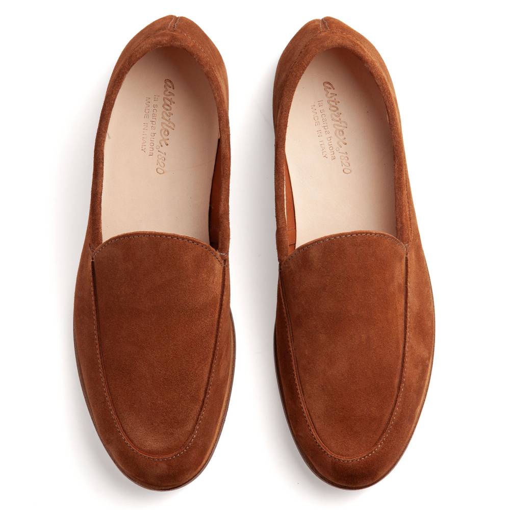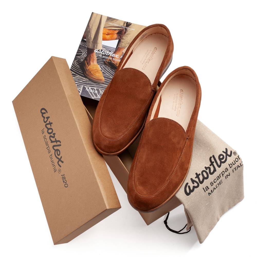 Мягкие лаунжевые лоферы итальянского бренда Astorflex лаконичного дизайна. Верх выполнен из высококачественной полноценной выворотной кожи коричневого цвета. С внешней стороны — бархатистая ворсистая поверхность, а с внутренней — гладкий лицевой слой кожи. Модель имеет съёмную стельку из кожи и пены с эффектом памяти (memory foam). Лоферы оснащены гибкой подошвой из промасленной буйволиной кожи.