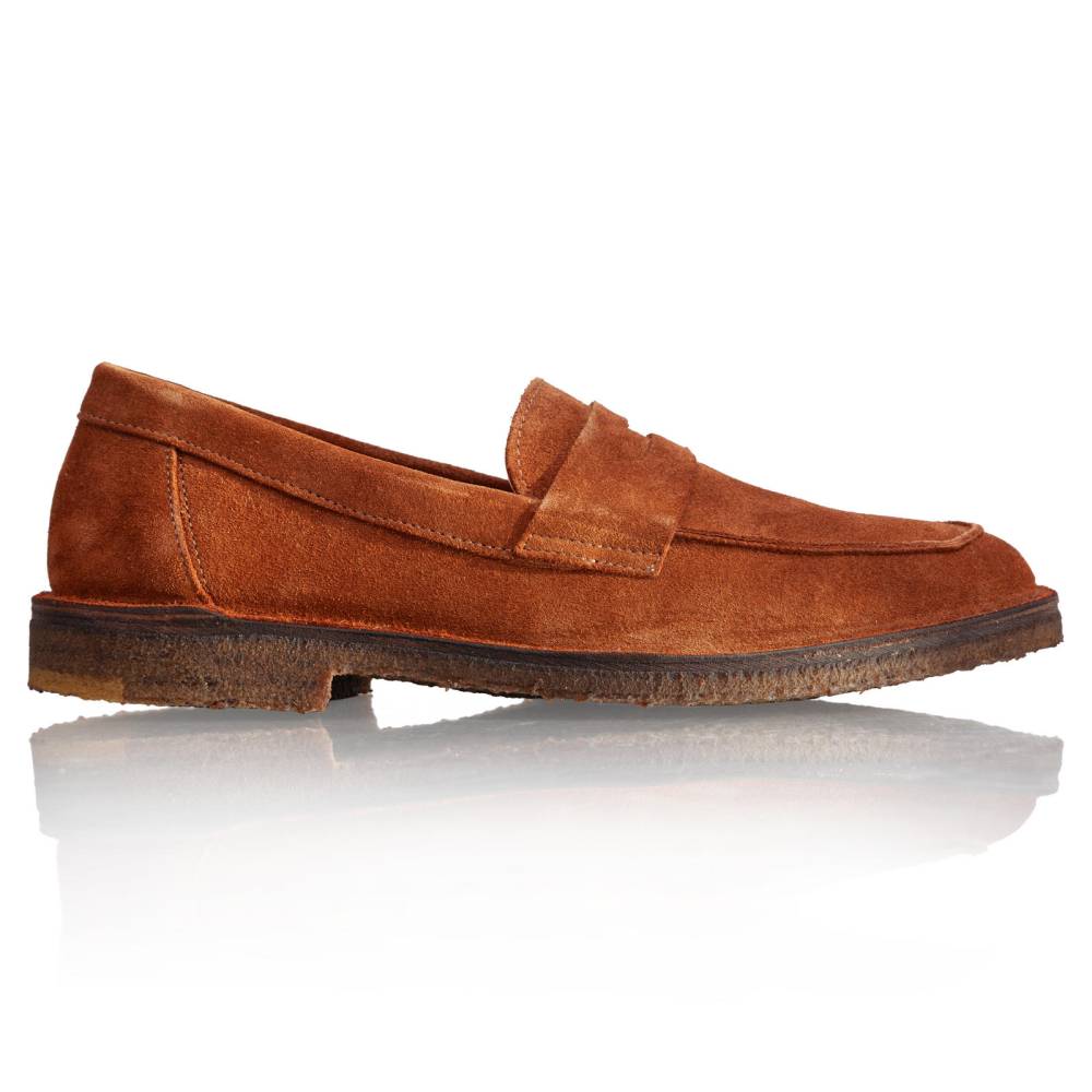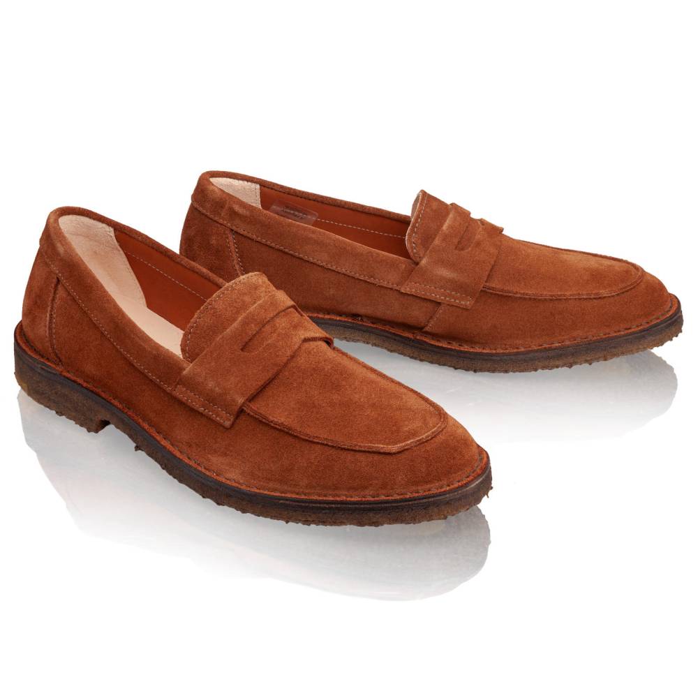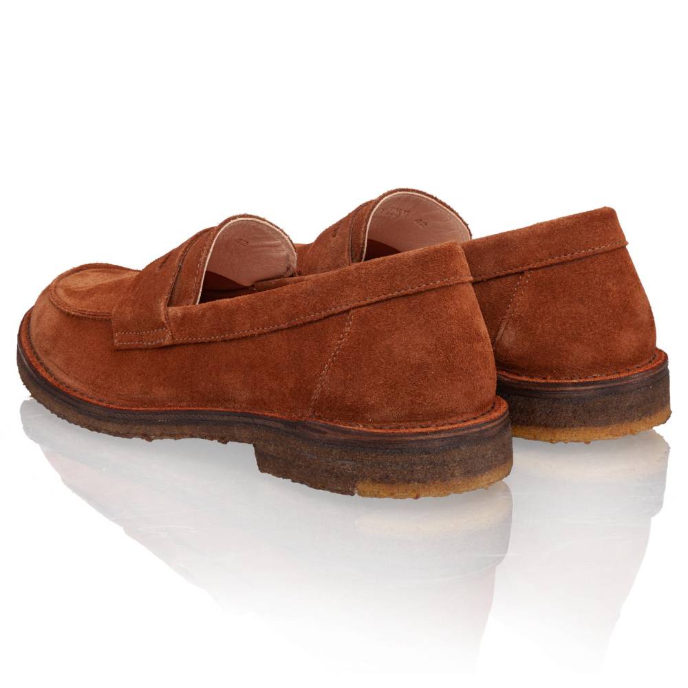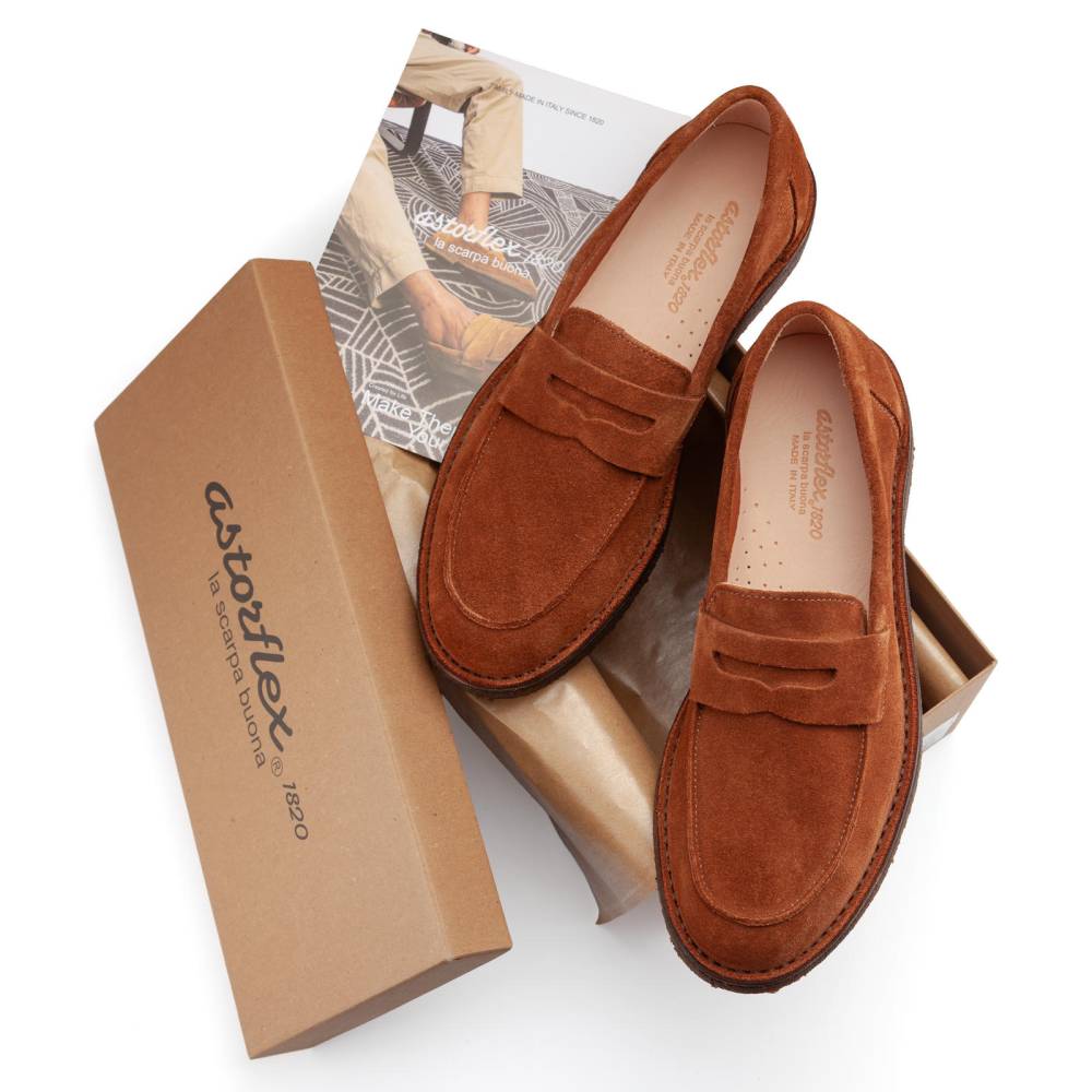 Лёгкие мужские пенни-лоферы насыщенного коричневого цвета Astorflex для жаркого лета. Верх выполнен из дорогостоящей полноценной выворотной кожи, а не срезанной замши. С внешней стороны — бархатистая ворсистая поверхность, а с внутренней — гладкая зернистая фактура. Модель имеет съёмную стельку из кожи и пены с эффектом памяти (memory foam). Узнаваемой особенностью лоферов является гибкая и упругая подошва из натурального каучука с контрастными вставками. Обувь сшита в прочной влагостойкой конструкции stitch-down (доппельный метод крепления).