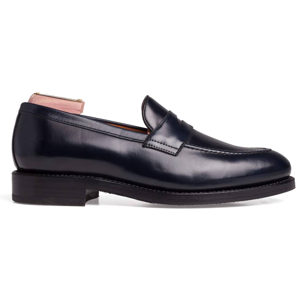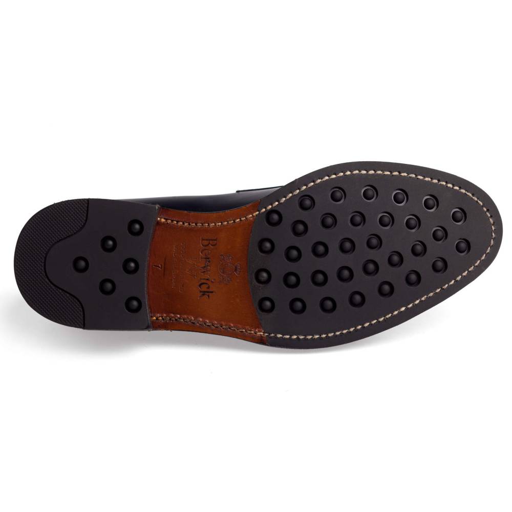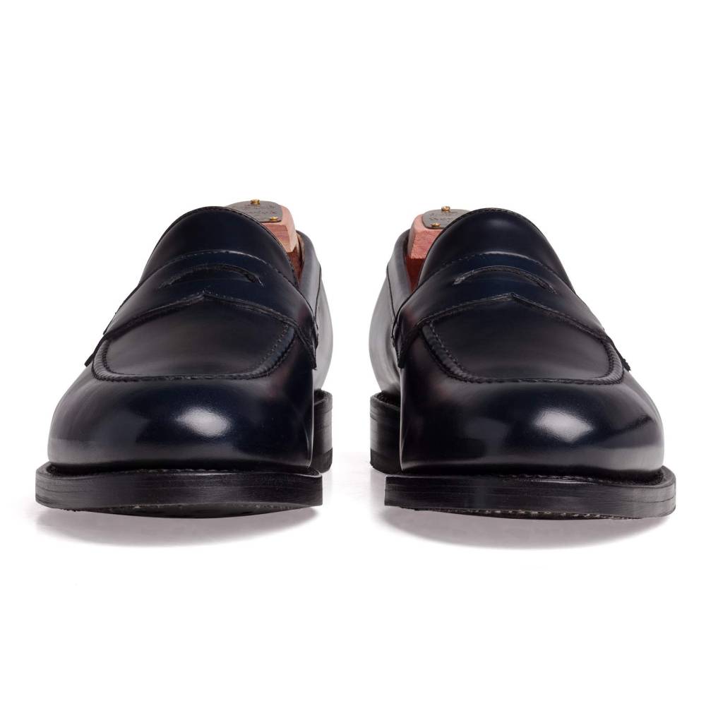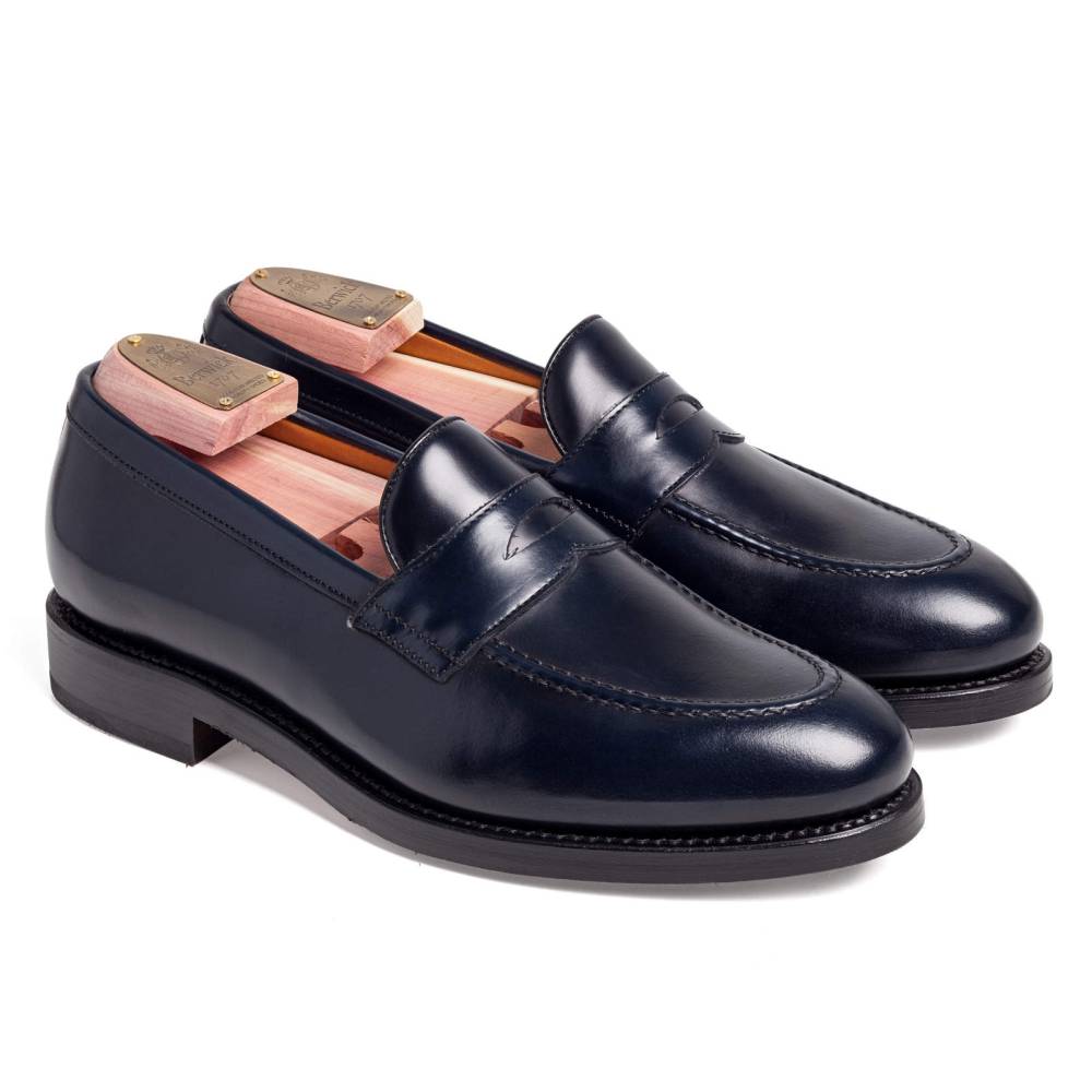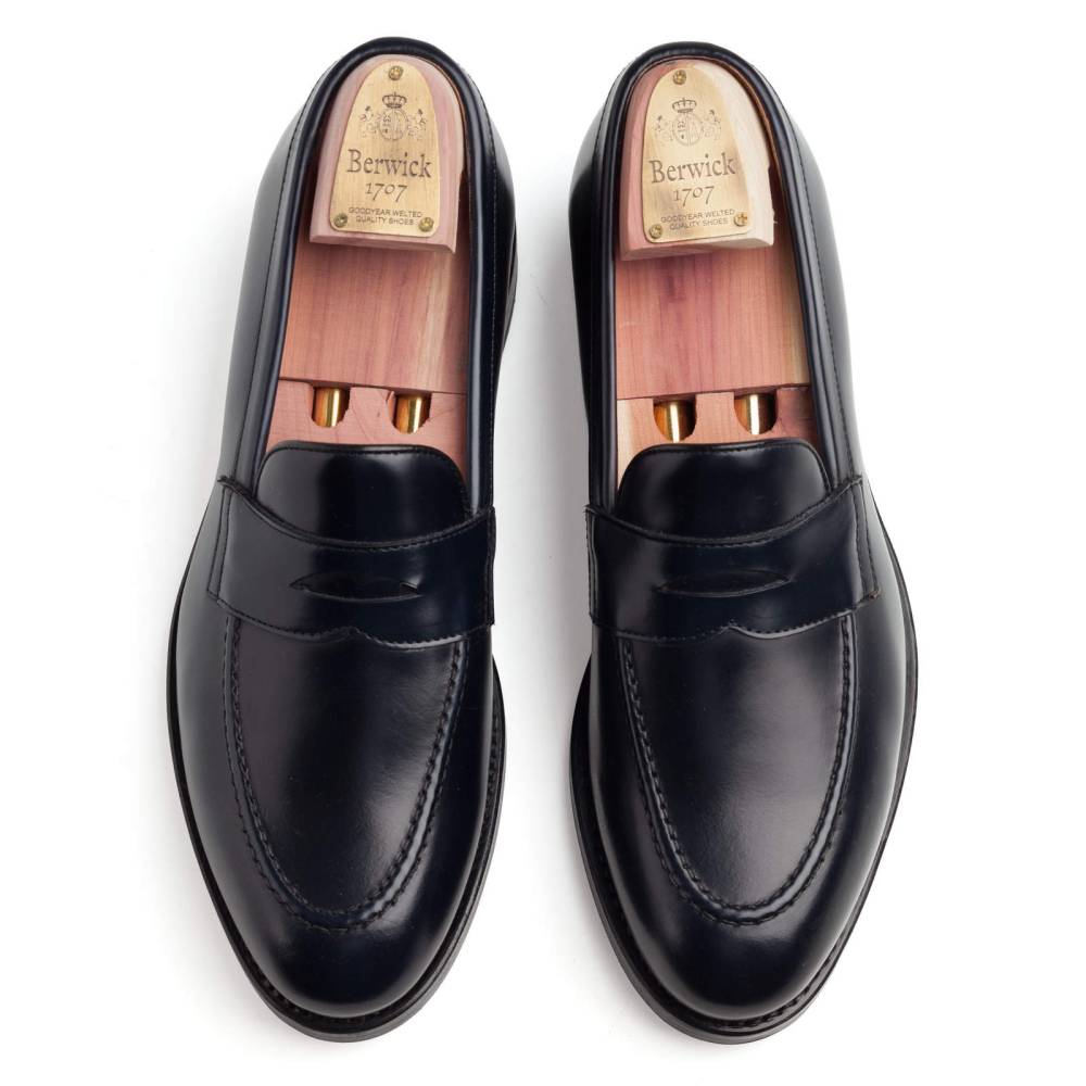 Традиционные пенни-лоферы тёмно-синего цвета Berwick на комбинированной подошве из кожи и резины. Верх выполнен из плотной полированной телячьей кожи Rois с изысканным блеском, благодаря которому она выглядит подобно конской коже (cordovan leather). Внутренняя отделка из тонкой бежевой кожи. Область пятки с внутренней стороны из замши. Конструкция Goodyear Welted.