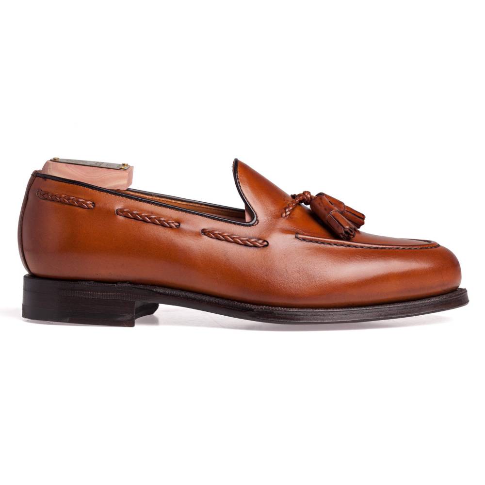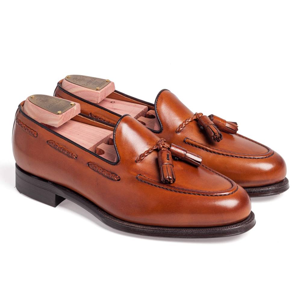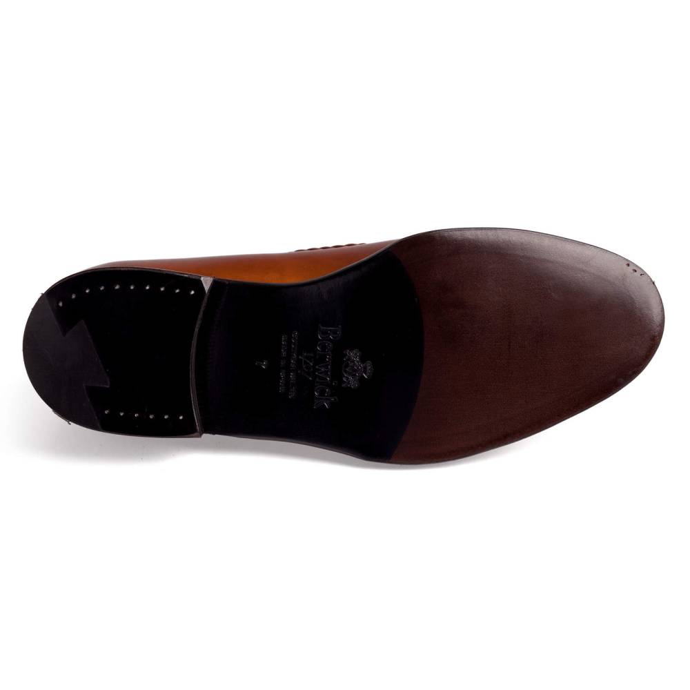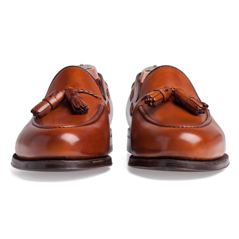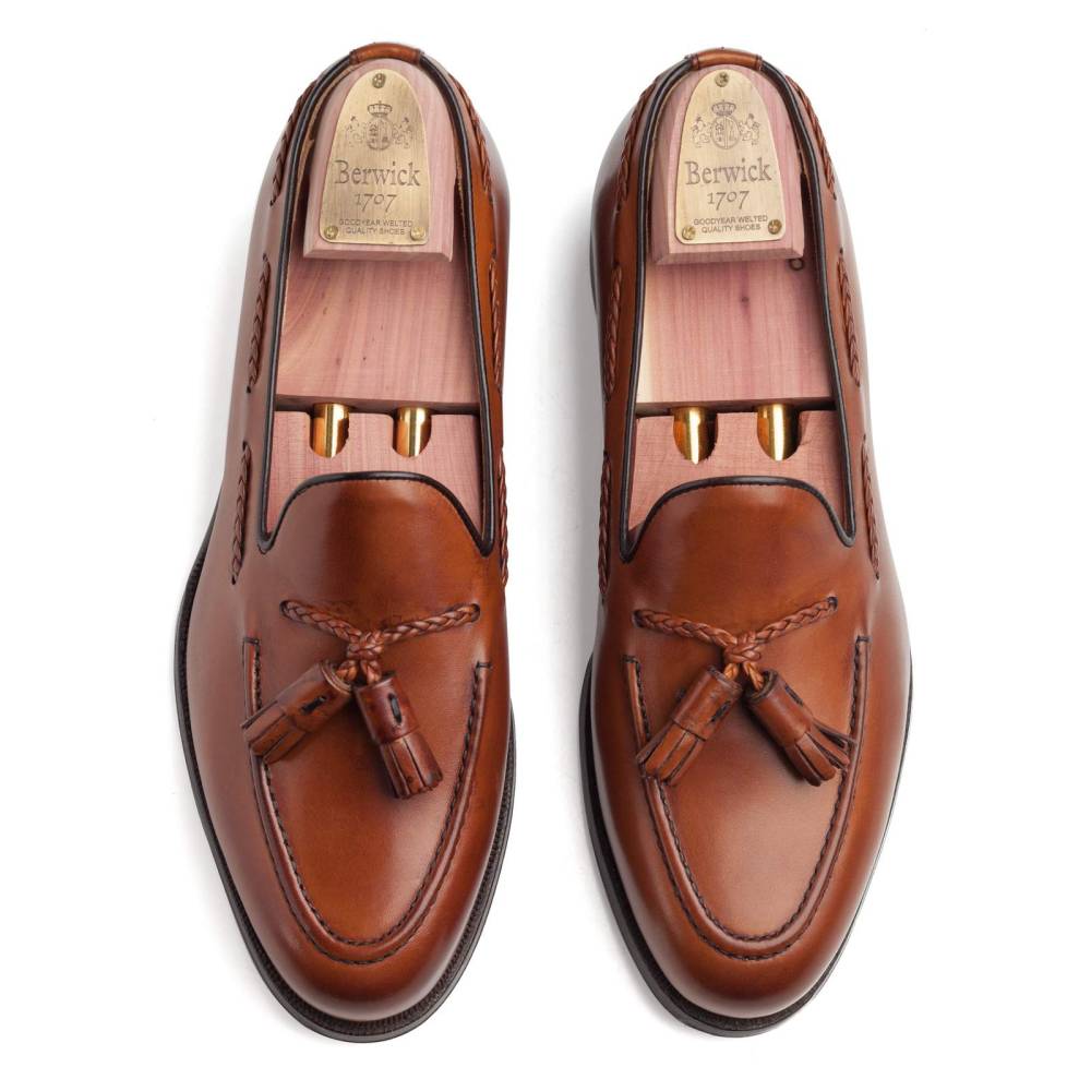 Тассел-лоферы на кожаной подошве из коллекции испанского бренда Berwick. Верх выполнен из плотной телячьей кожи светло-коричневого цвета. Лёгкие затемнения на коже и градиент указывают на то, что материал обрабатывался по технологии "burnished". Такой эффект получается благодаря нанесению воска более тёмного оттенка и его нагреву. Внутренняя отделка из тонкой гладкой кожи. Особенностью данной модели является шнурок оригинального плетения с кисточками, пропущенный по бокам и завязанный на подъёме. Модель имеет высококачественную подошву из кожи, окрашенную и отполированную вручную. Конструкция Goodyear Welted.