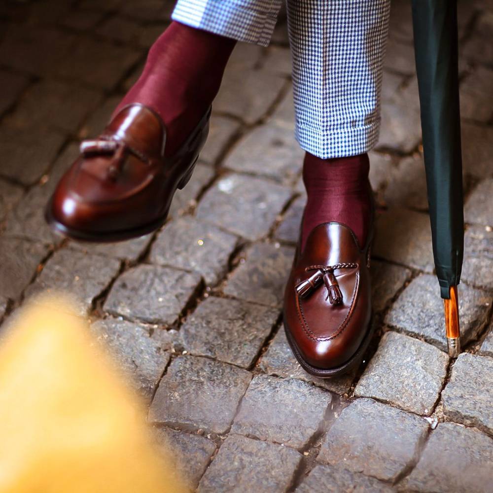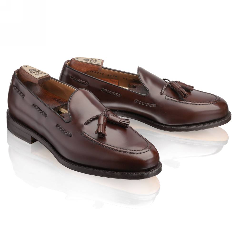 Тассел-лоферы на кожаной подошве из коллекции испанского бренда Berwick. Верх выполнен из плотной телячьей кожи тёмно-коричневого цвета. Внутренняя отделка из тонкой гладкой кожи. Особенностью данной модели является шнурок оригинального плетения, пропущенный по бокам и завязанный на подъеме с кисточками. Модель имеет высококачественную подошву из кожи с закрытым швом. Конструкция Goodyear Welted.