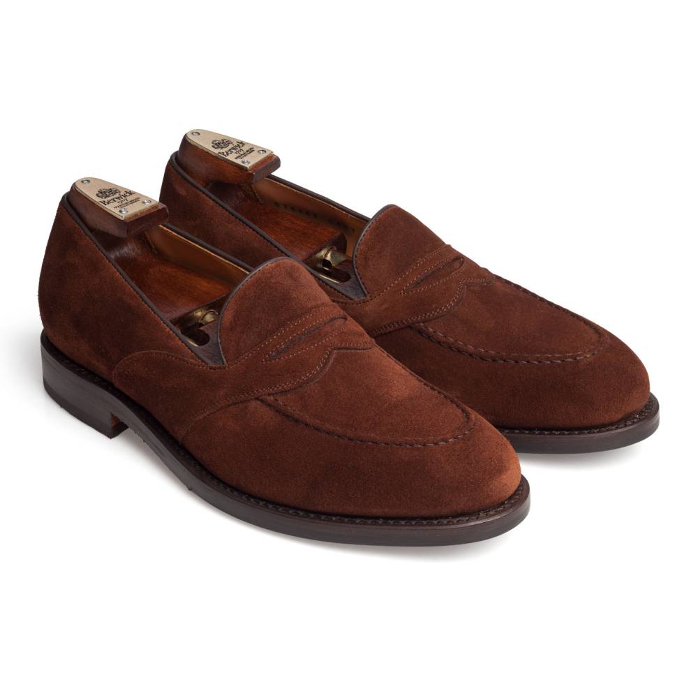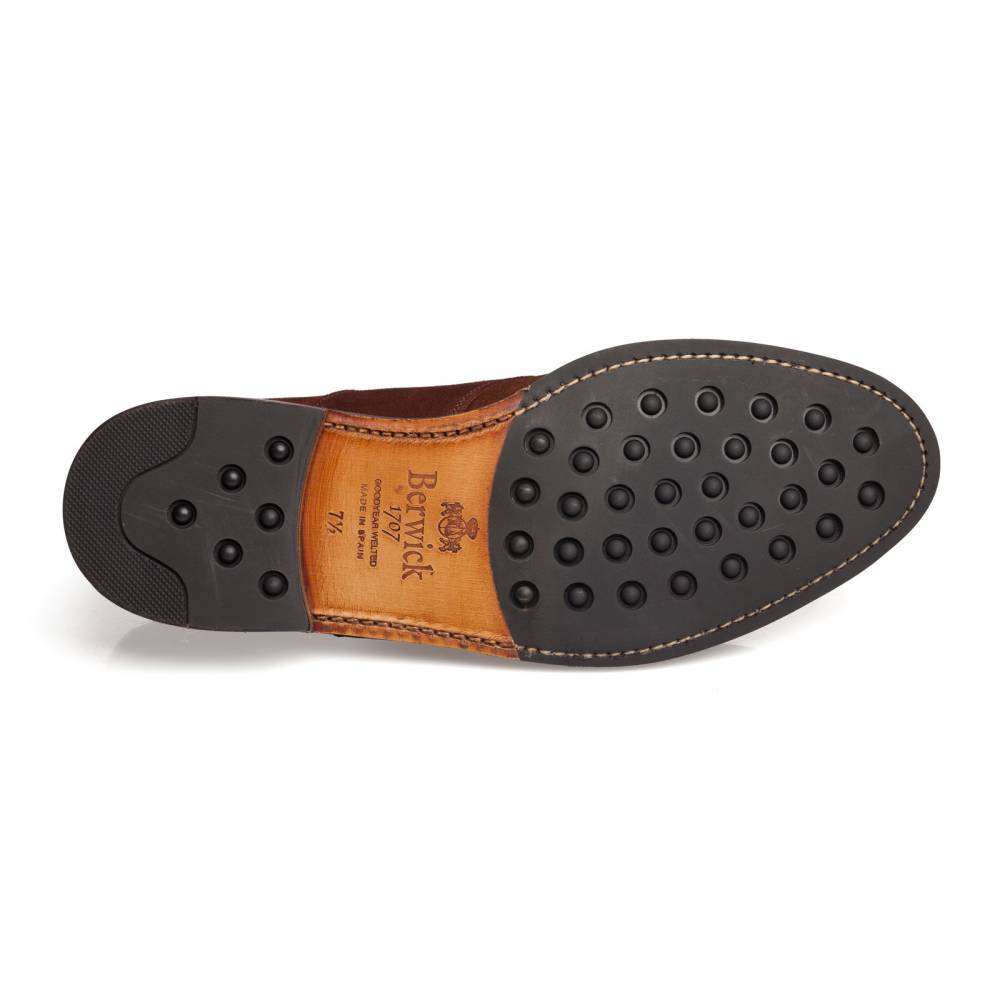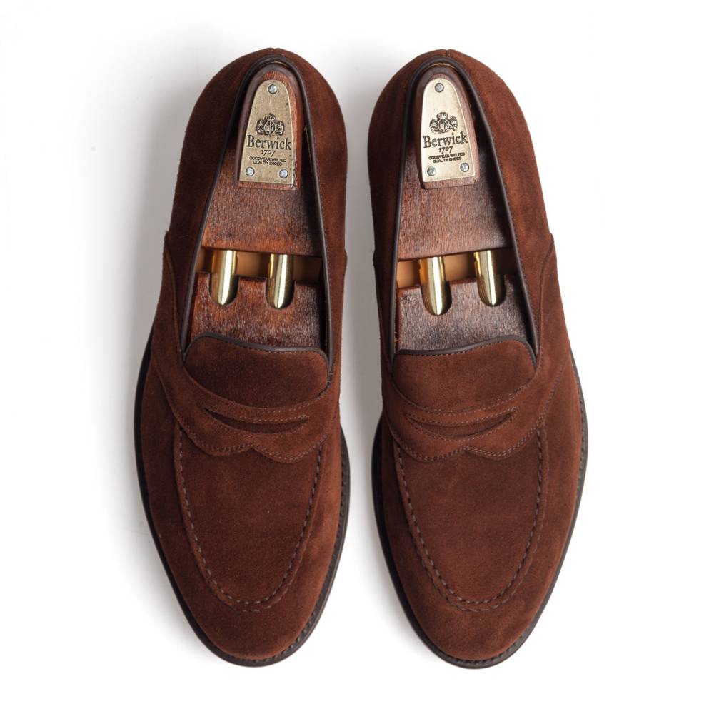 Оригинальные пенни-лоферы Berwick насыщенного коричневого цвета на практичной комбинированной подошве из кожи и резины. Отличительной особенностью данной модели является полный «поясок», который огибает центральную часть обуви. Верх выполнен из промасленной замши, устойчивой к осадкам. Внутренняя отделка из тонкой бежевой кожи. Область пятки с внутренней стороны из замши. Конструкция Goodyear Welted.