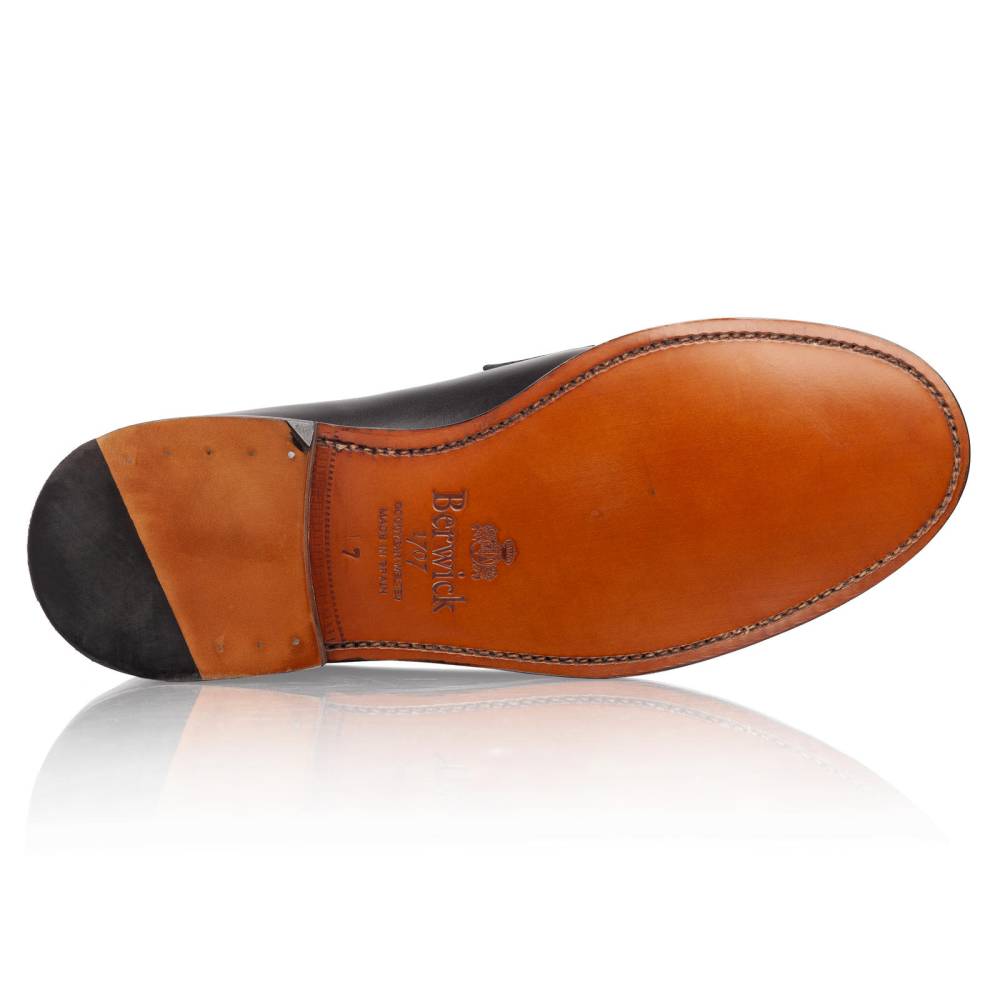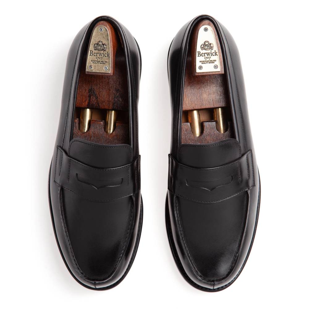 Сдержанные чёрные пенни-лоферы с норвежским мысом от испанского бренда Berwick. Верх выполнен из гладкой телячьей кожи. Внутренняя отделка из тонкой бежевой кожи. Область пятки с внутренней стороны из замши. Пара оснащена кожаной подошвой. Это поддреживает комфортное состояние стопы внутри обуви в тёплую погоду. Конструкция Goodyear Welted.