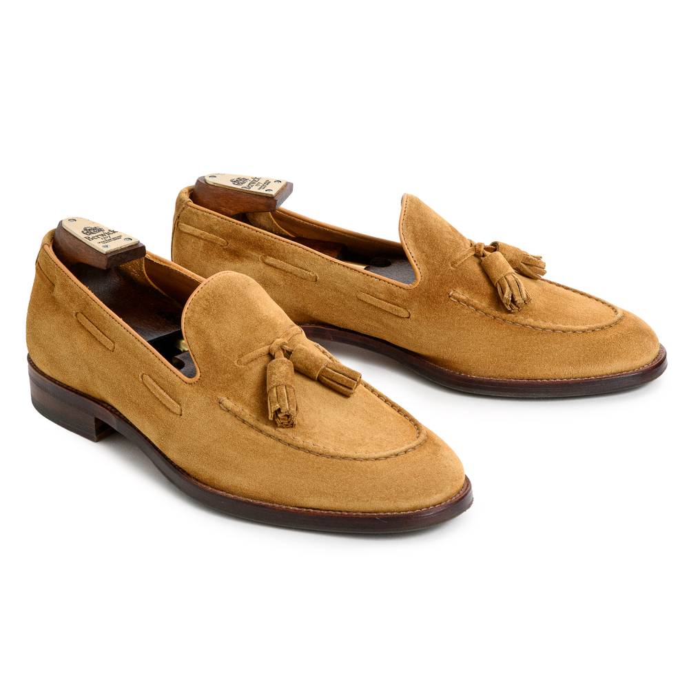Тассел-лоферы из коллекции испанского бренда Berwick. Верх выполнен из высококачественной выворотной замши светло-коричневого цвета без подкладки. Модель отличается практичной комбинированной подошвой из кожи и резины Конструкция Blake.
