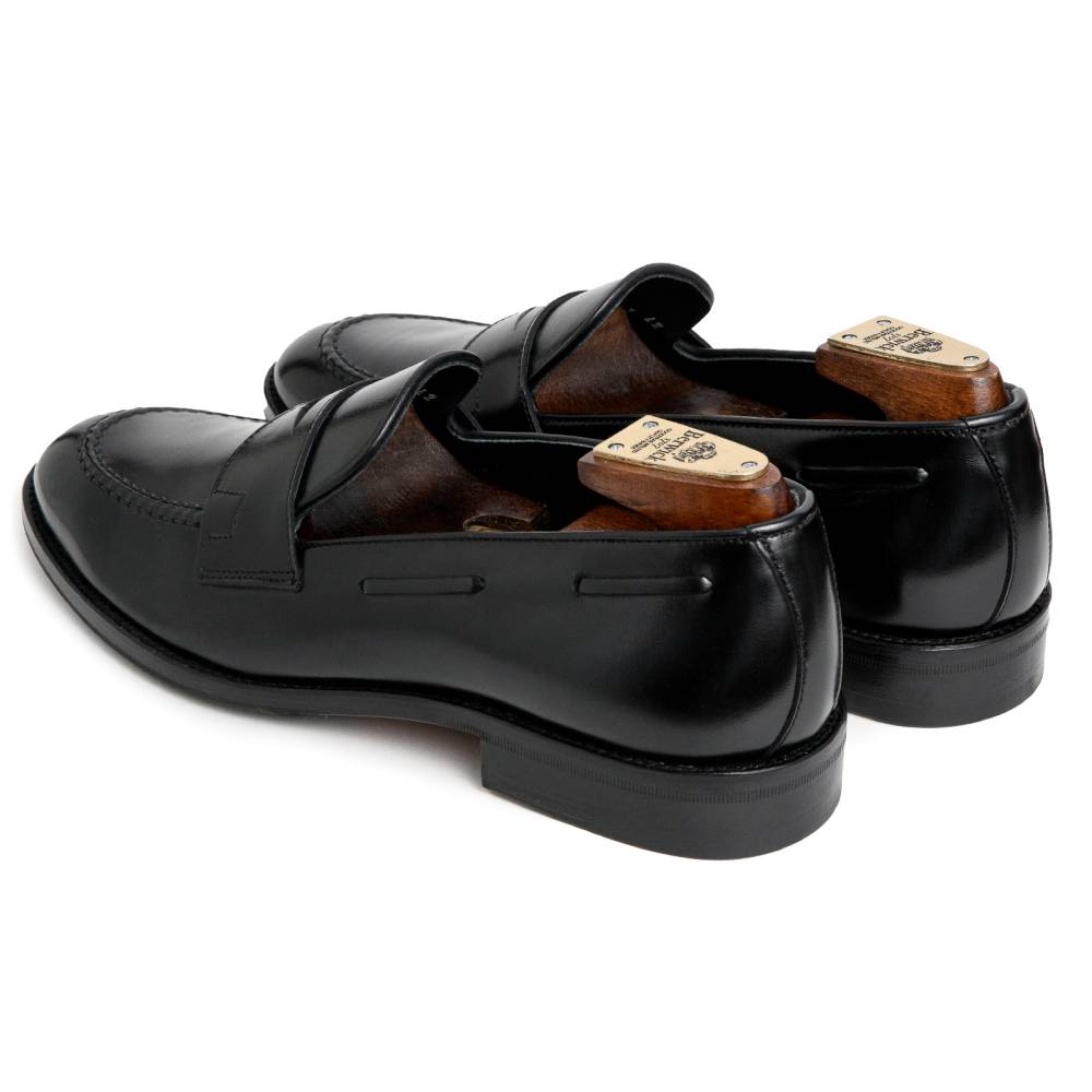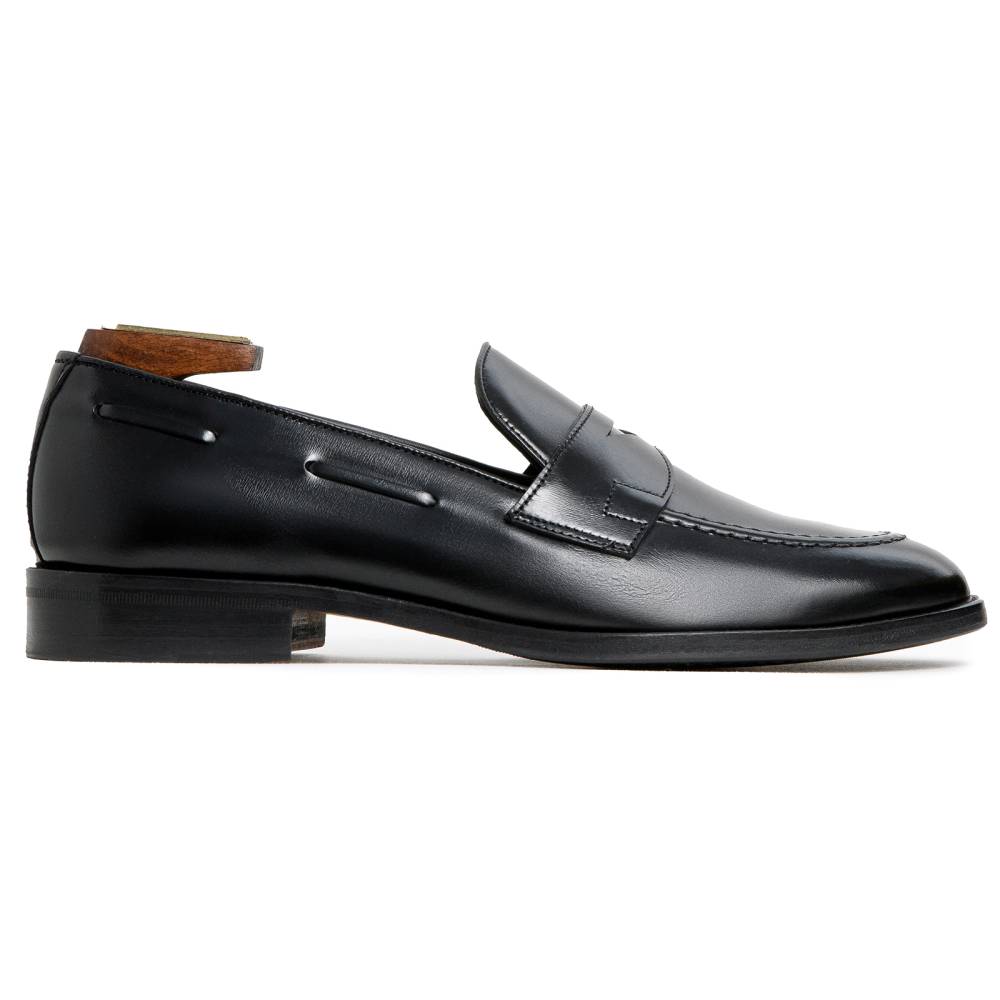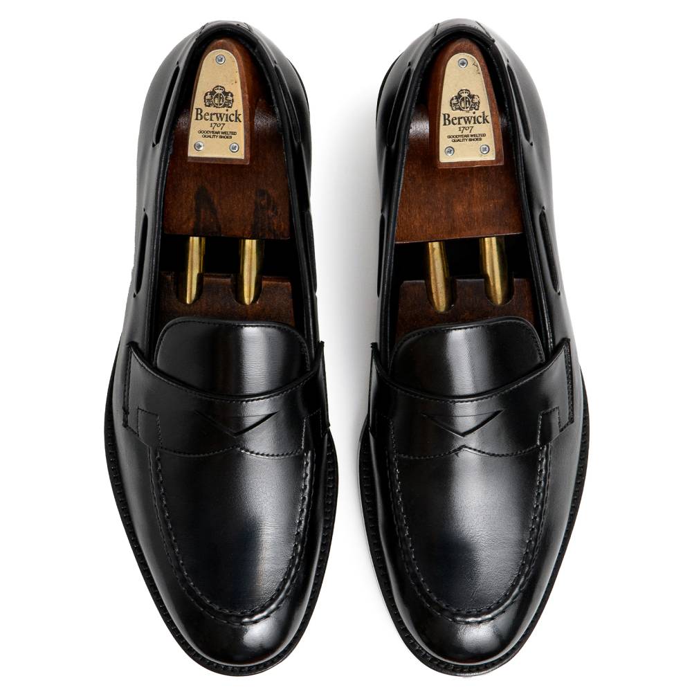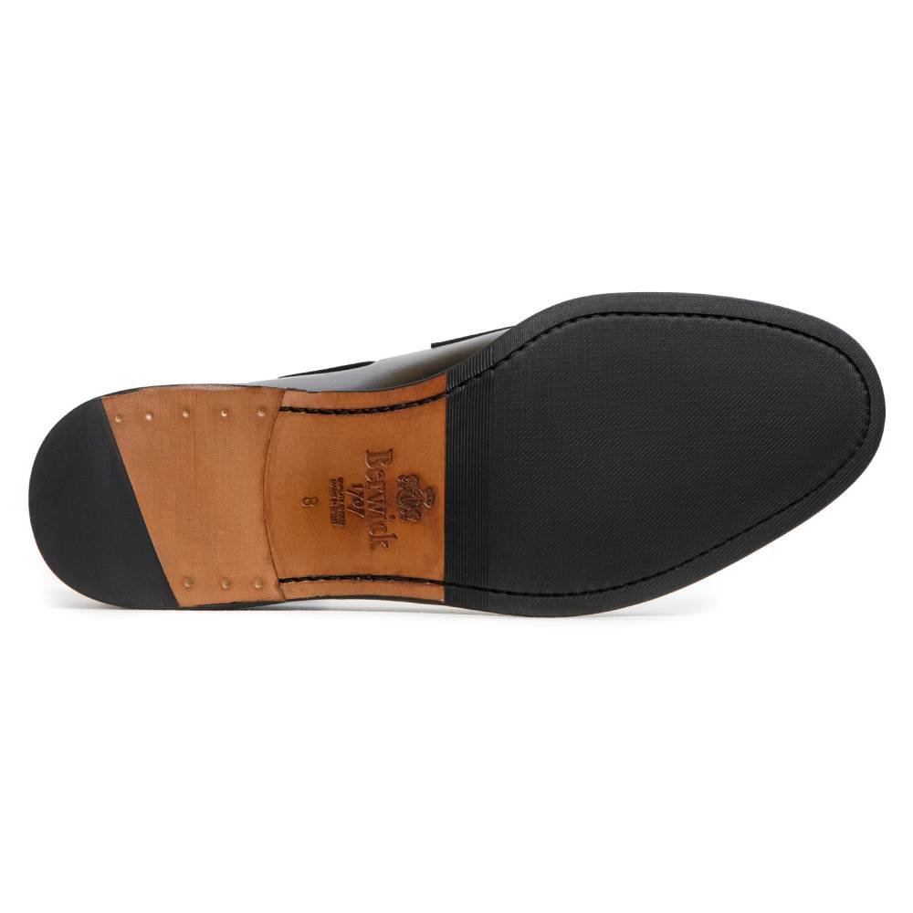 Классические чёрные пенни-лоферы испанского бренда Berwick на комбинированной подошве из кожи и резины. Верх выполнен из гладкой телячьей кожи и украшен кожаной тесьмой, огибающей стопу. Область пятки с внутренней стороны из замши. Модель прошита по технологии Blake.
