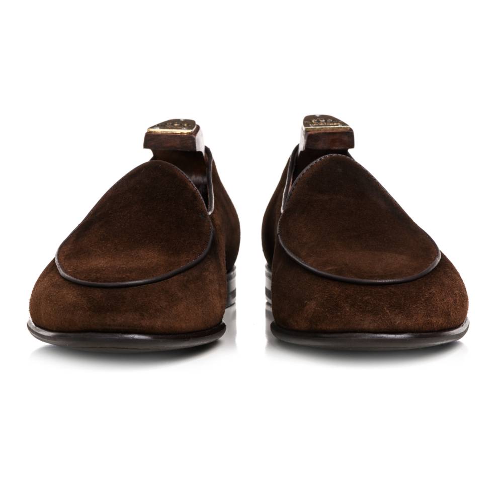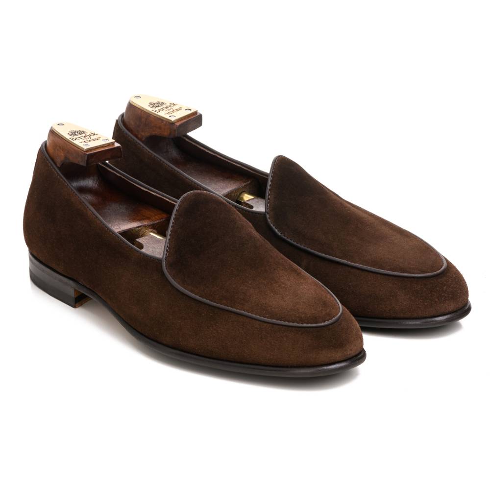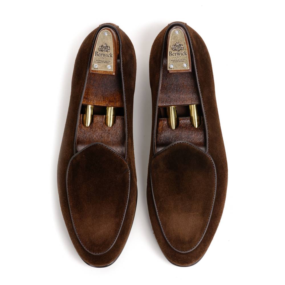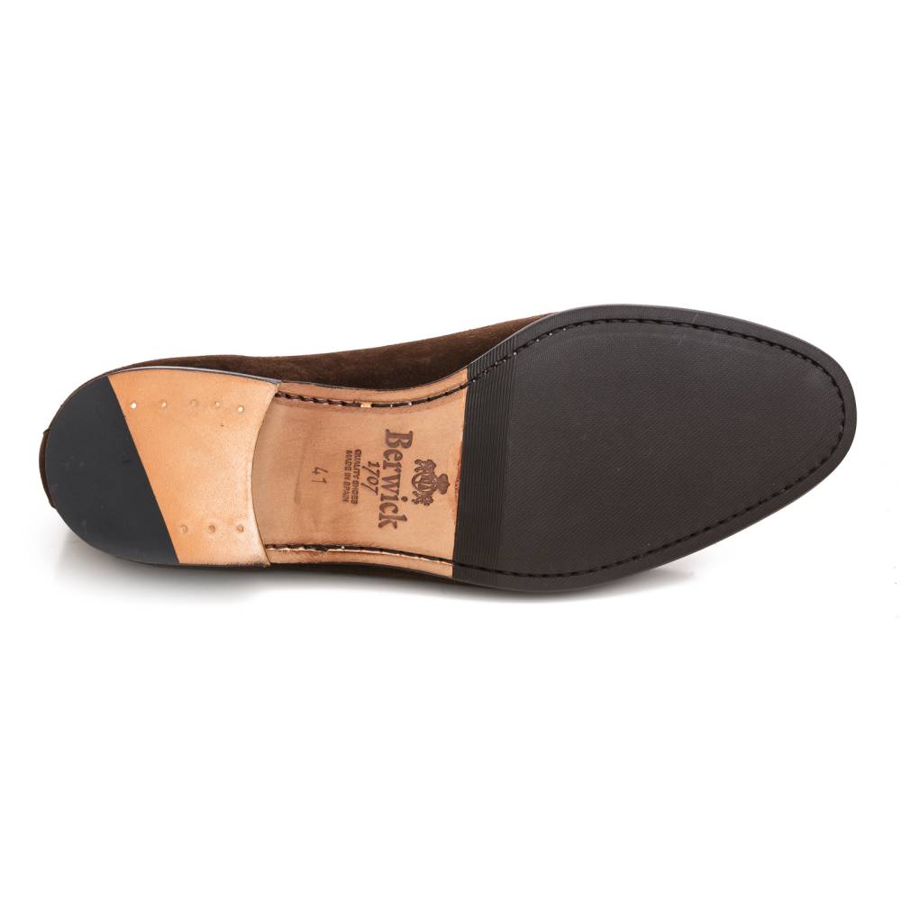 Лёгкие и мягкие бельгийские лоферы Berwick 1707 на кожаной подошве с фирменной профилактикой из резины. Отличительной особенностью такого типа лоферов является отсутствие ранта, тонкая подошва и U-образный шов союзки. Верх выполнен из приятной на ощупь промасленной замши тёмно-коричневого цвета. Такая обработка материала обеспечивает хорошую защиту от грязи и воды. Конструкция Blake.