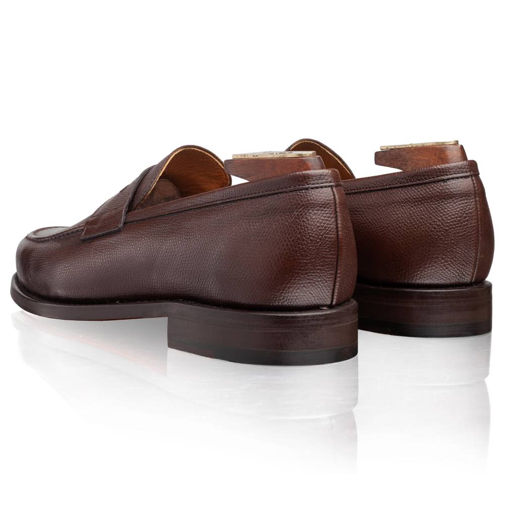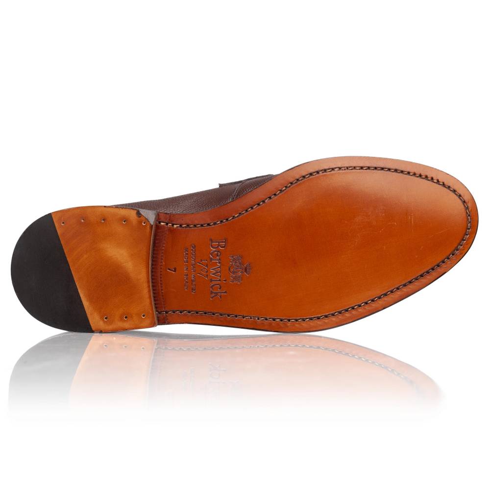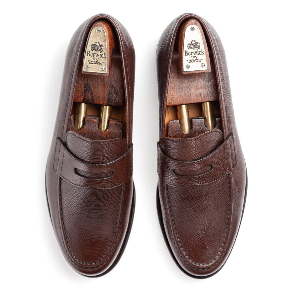 Лаконичные тёмно-коричневые пенни-лоферы испанского бренда Berwick. Верх выполнен и телячьей кожи с ненавязчивой зернистой фактурой. Внутренняя отделка из тонкой бежевой кожи. Область пятки с внутренней стороны из замши. Пара оснащена кожаной подошвой. Конструкция Goodyear Welted.