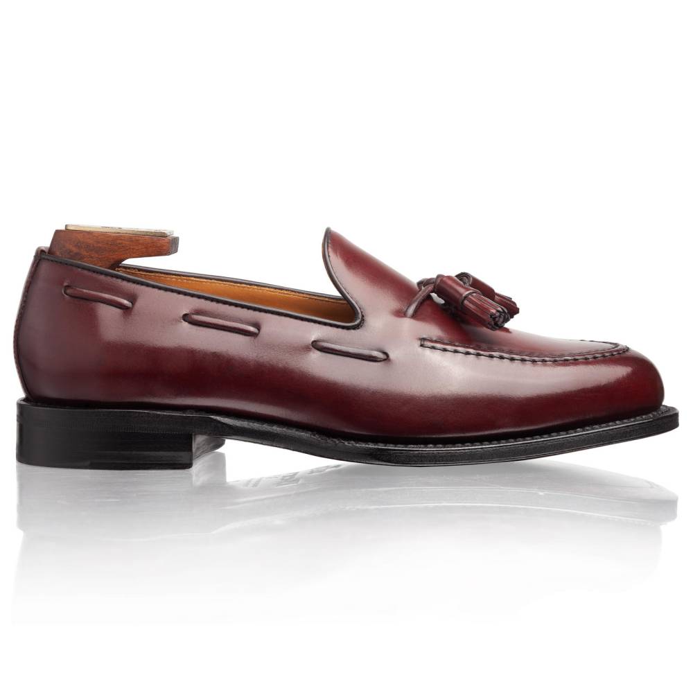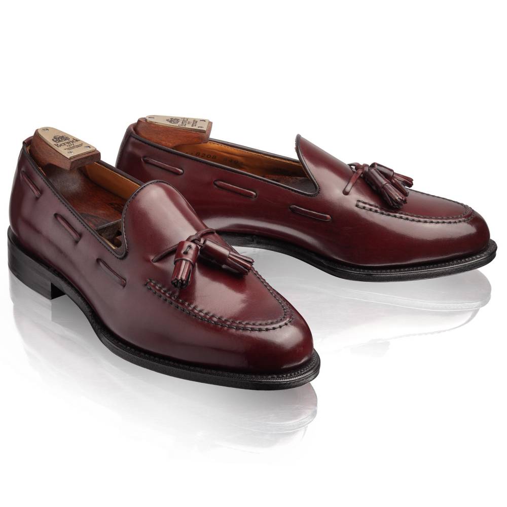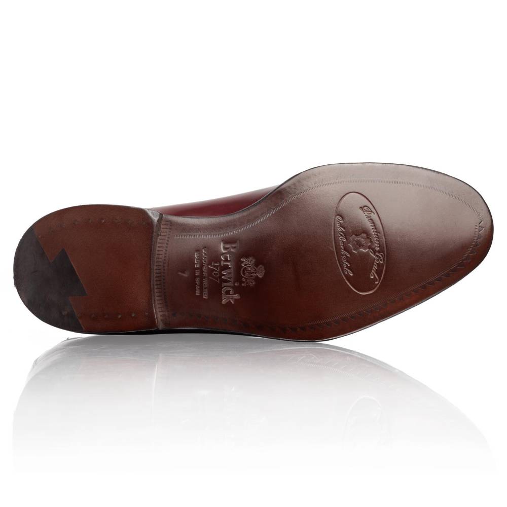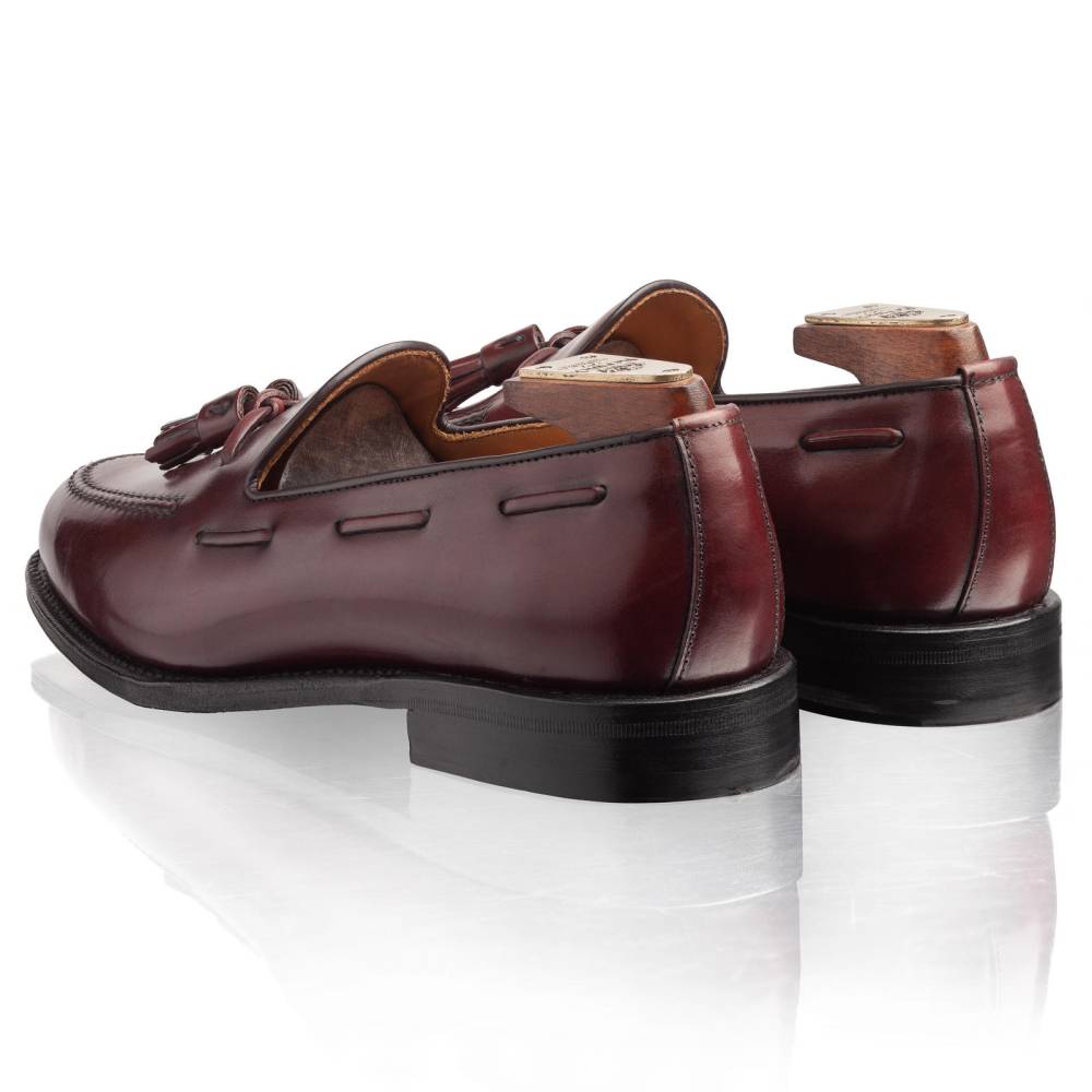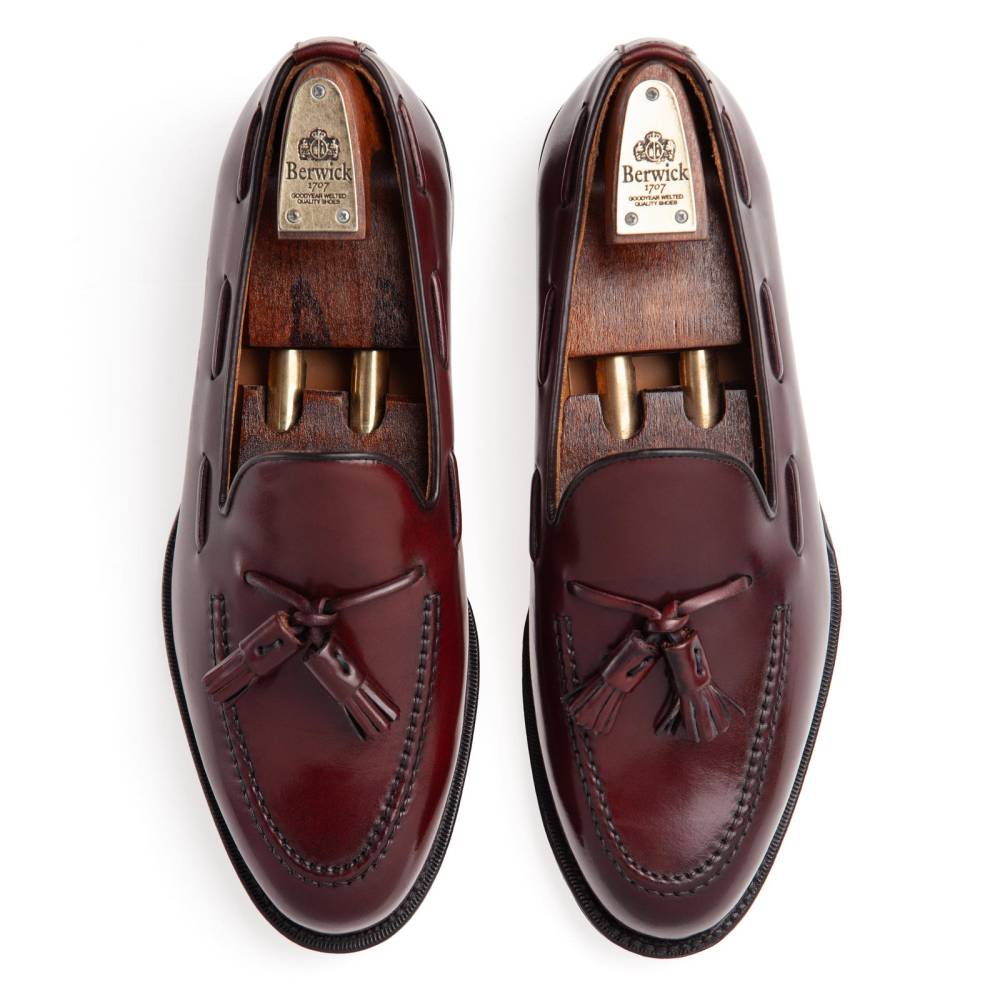 Элегантные мужские лоферы с кисточками испанского бренда Berwick на кожаной подошве с закрытым швом. Верх выполнен из плотной лошадиной кожи (cordovan) коричневого цвета с бордовым оттенком. Такой тип кожи является достаточно редким и изысканным материалом. В процессе дубления кожа впитывает натуральные масла и жиры, которые сохраняются в течение различных фаз производства. Изделия из такой кожи обладают натуральным блеском, гибкостью и прочностью. Стоит обратить внимание, что уход за данным материалом отличается от ухода за телячьей кожей. Подкладка и стелька — из кожи растительного дубления. Конструкция Goodyear Welted.