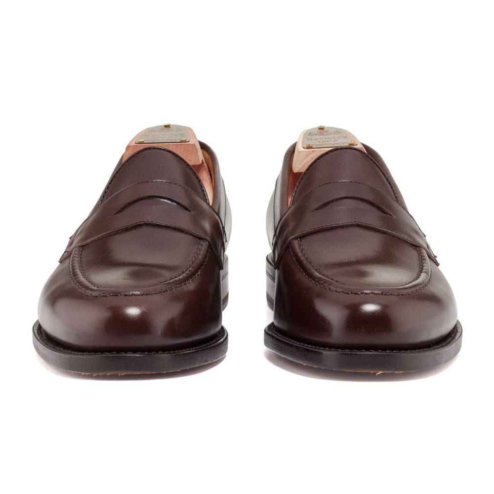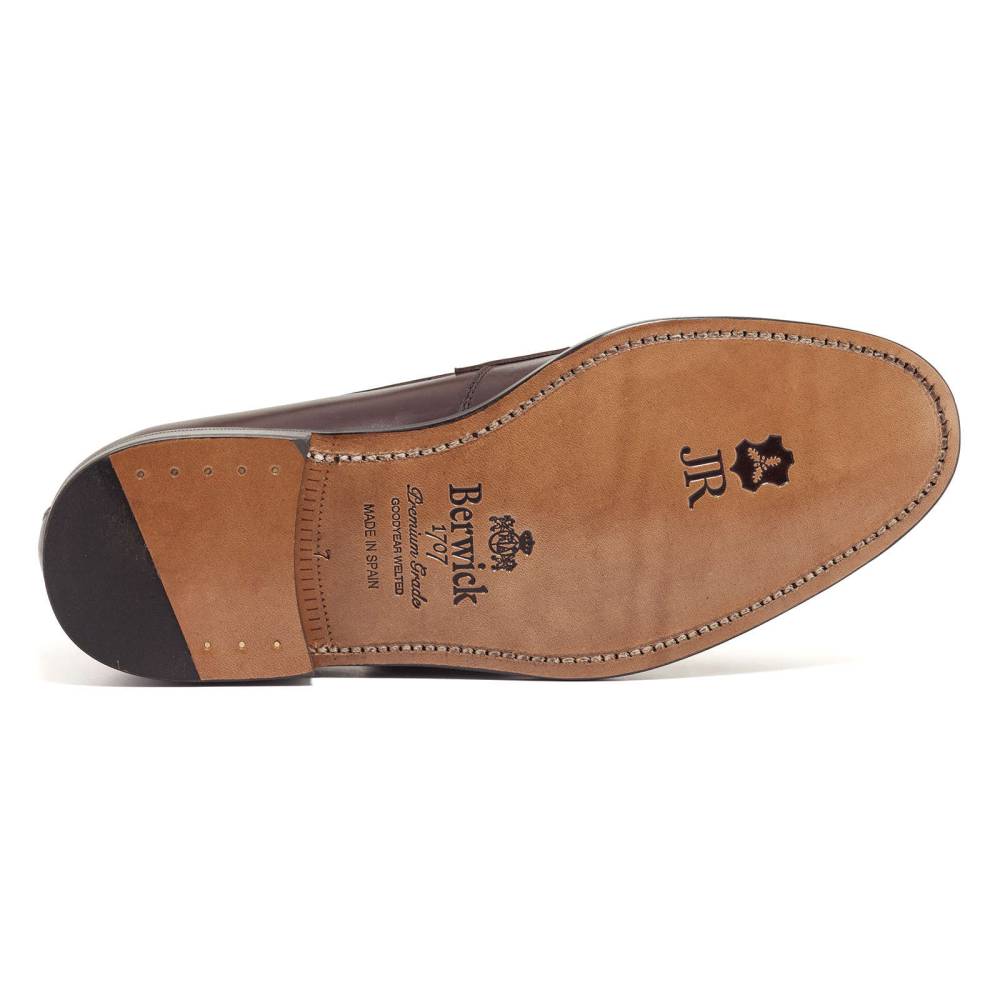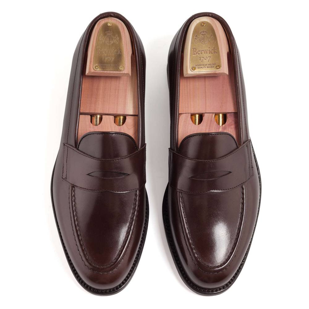 Пенни-лоферы Berwick на кожаной подошве. Верх выполнен из гладкой телячьей кожи традиционного тёмно-коричневого цвета. Внутренняя отделка из тонкой бежевой кожи. Область пятки с внутренней стороны из замши. При создании данной модели использовалась высококачественная подошва знаменитой немецкой кожевенной мастерской Joh. Rendenbach. Конструкция Goodyear Welted.