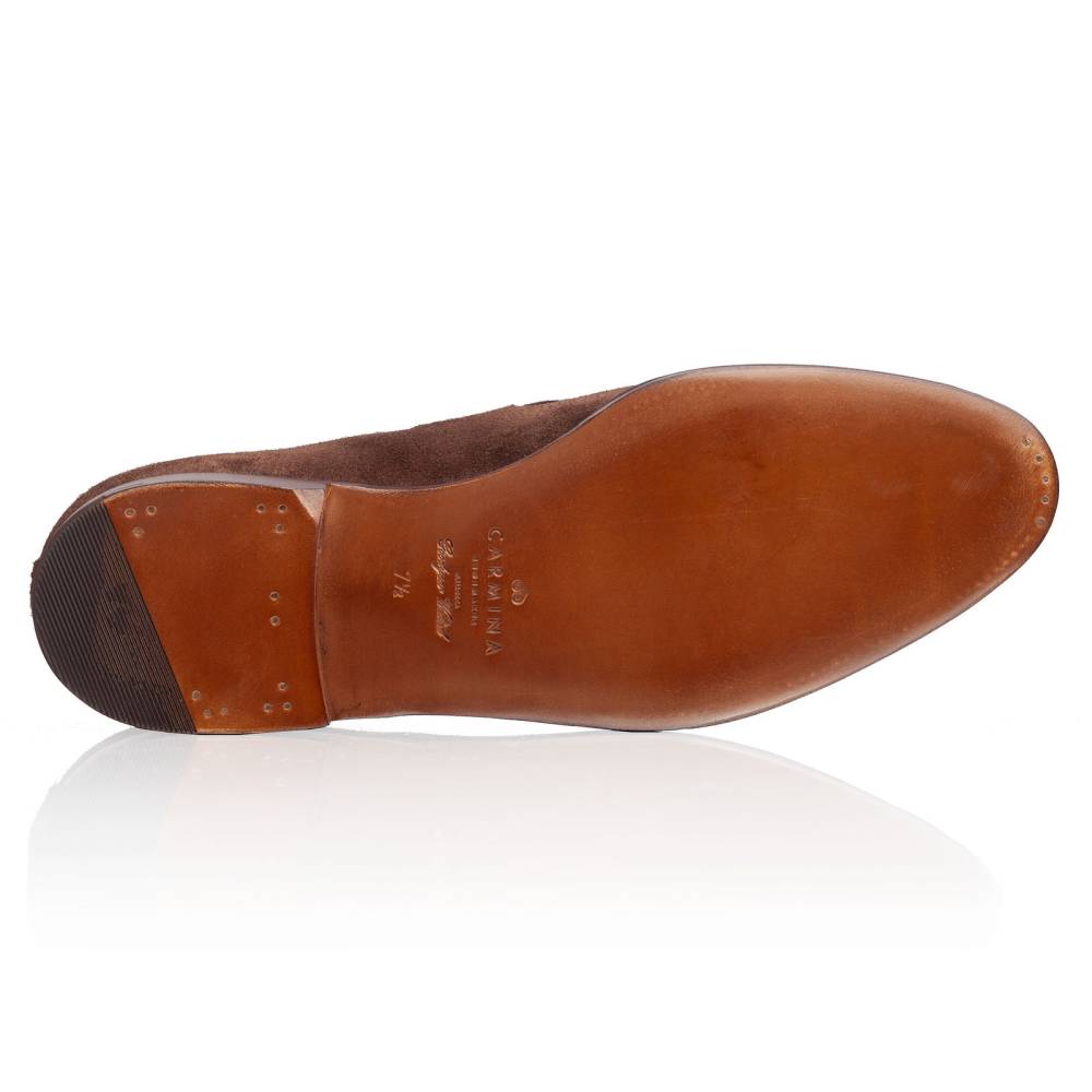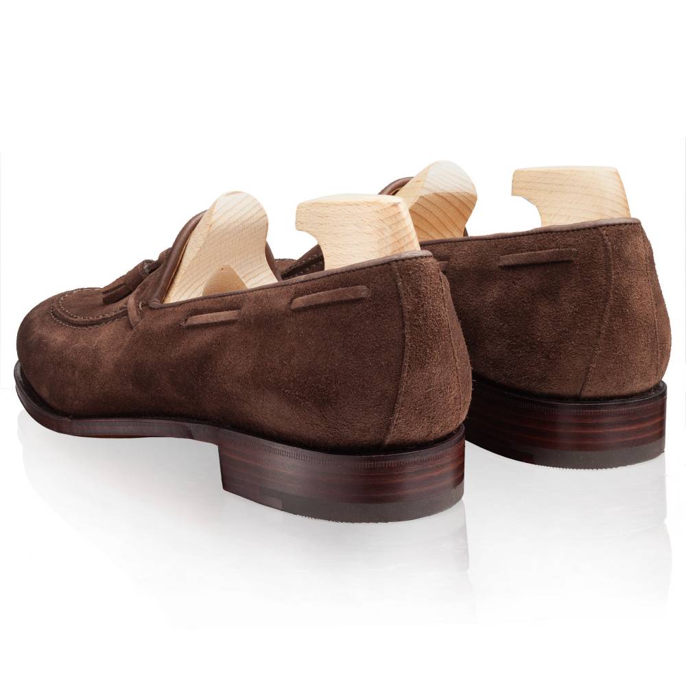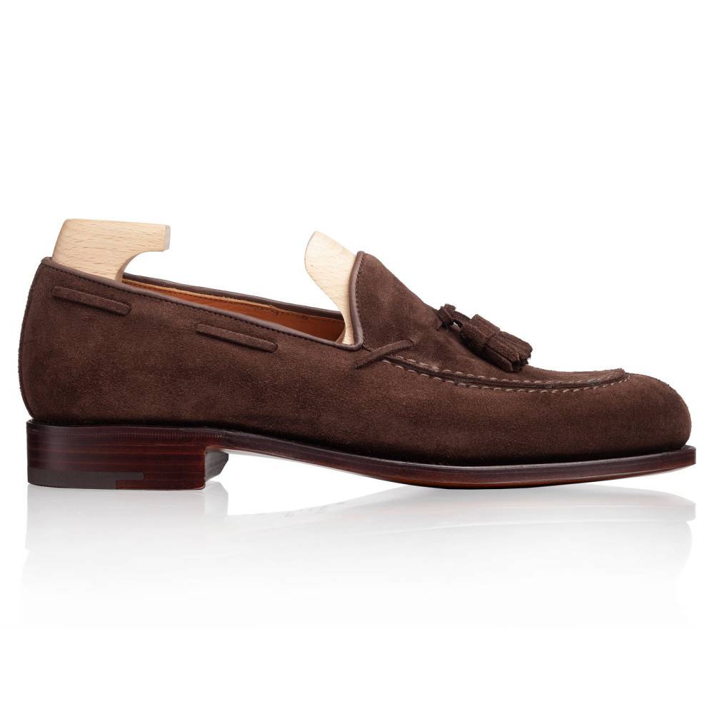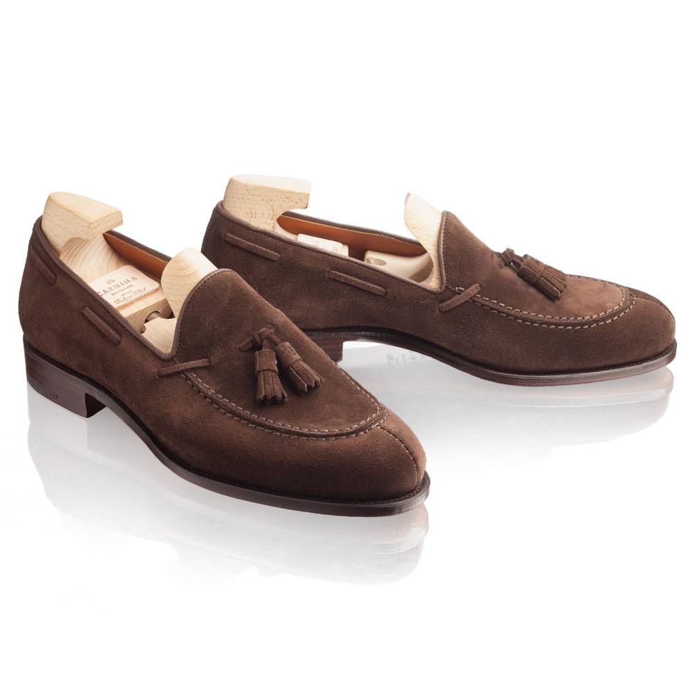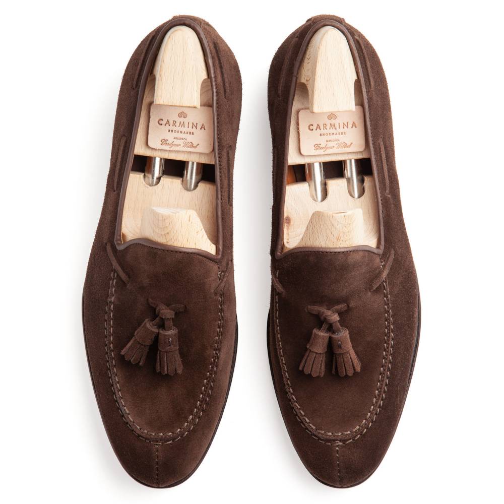 Элегантные лоферы с кисточками бренда Carmina на кожаной подошве. Модель представляет собой лоферы в норвежском стиле с тремя сшитыми элементами в передней части (split toe). Для верха используется мягкая и бархатистая замша тёмно-коричневого цвета, поставляемая знаменитой английской дубильней Charles F. Stead. Внутренняя отделка из тонкой кожи растительного дубления. Шов на подошве закрыт. Это делает её гладкой, а также защищает от проникновения влаги. Конструкция Goodyear Welted.