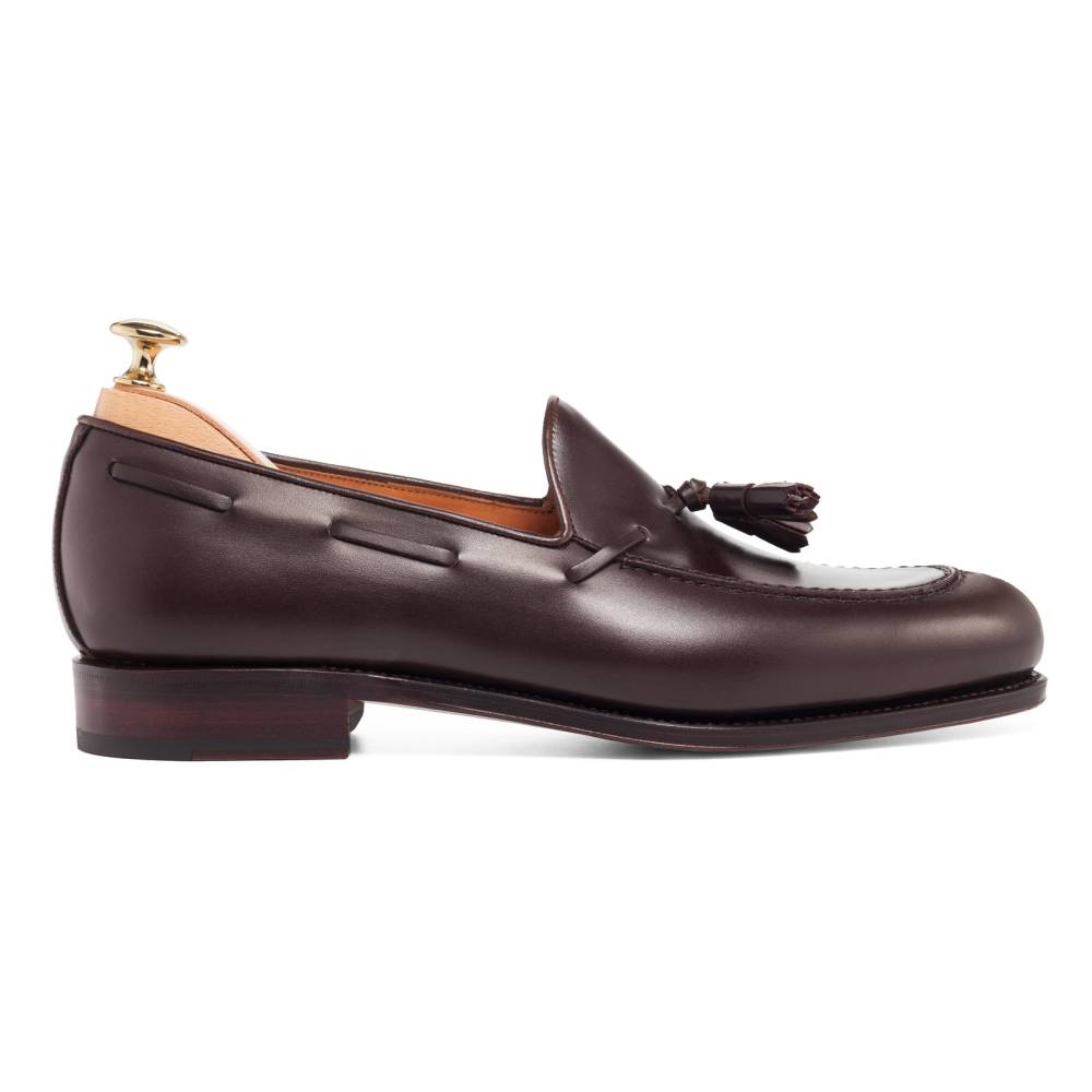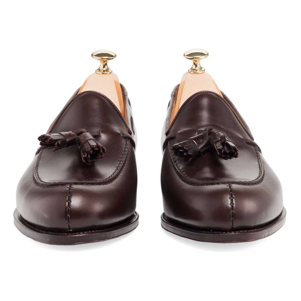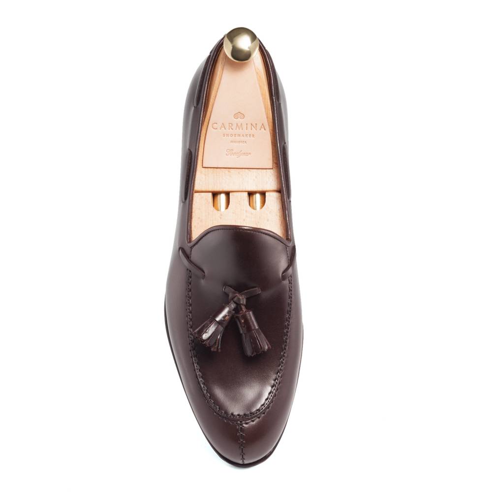 Лоферы с кисточками Carmina на кожаной подошве. Верх выполнен из плотной телячьей кожи тёмно-коричневого цвета. Внутренняя отделка из тонкой гладкой кожи. Конструкция Goodyear.