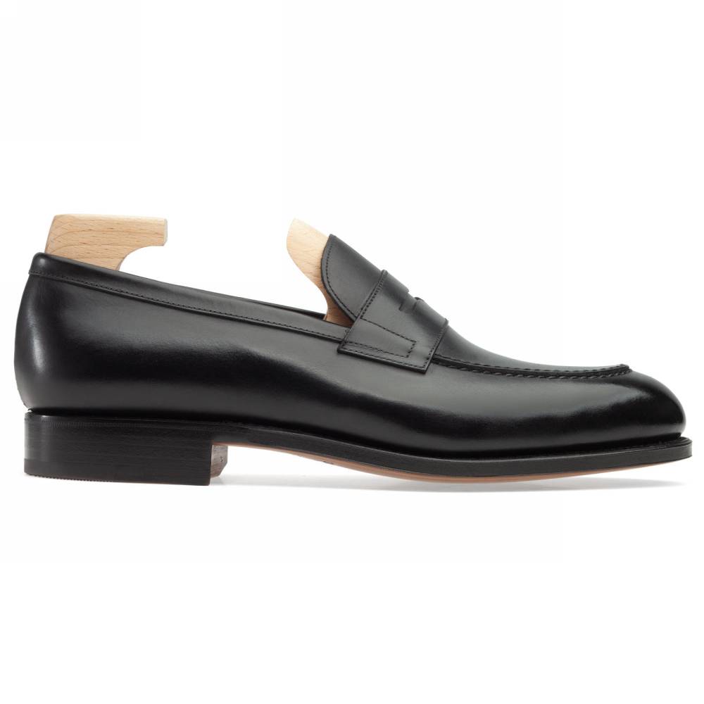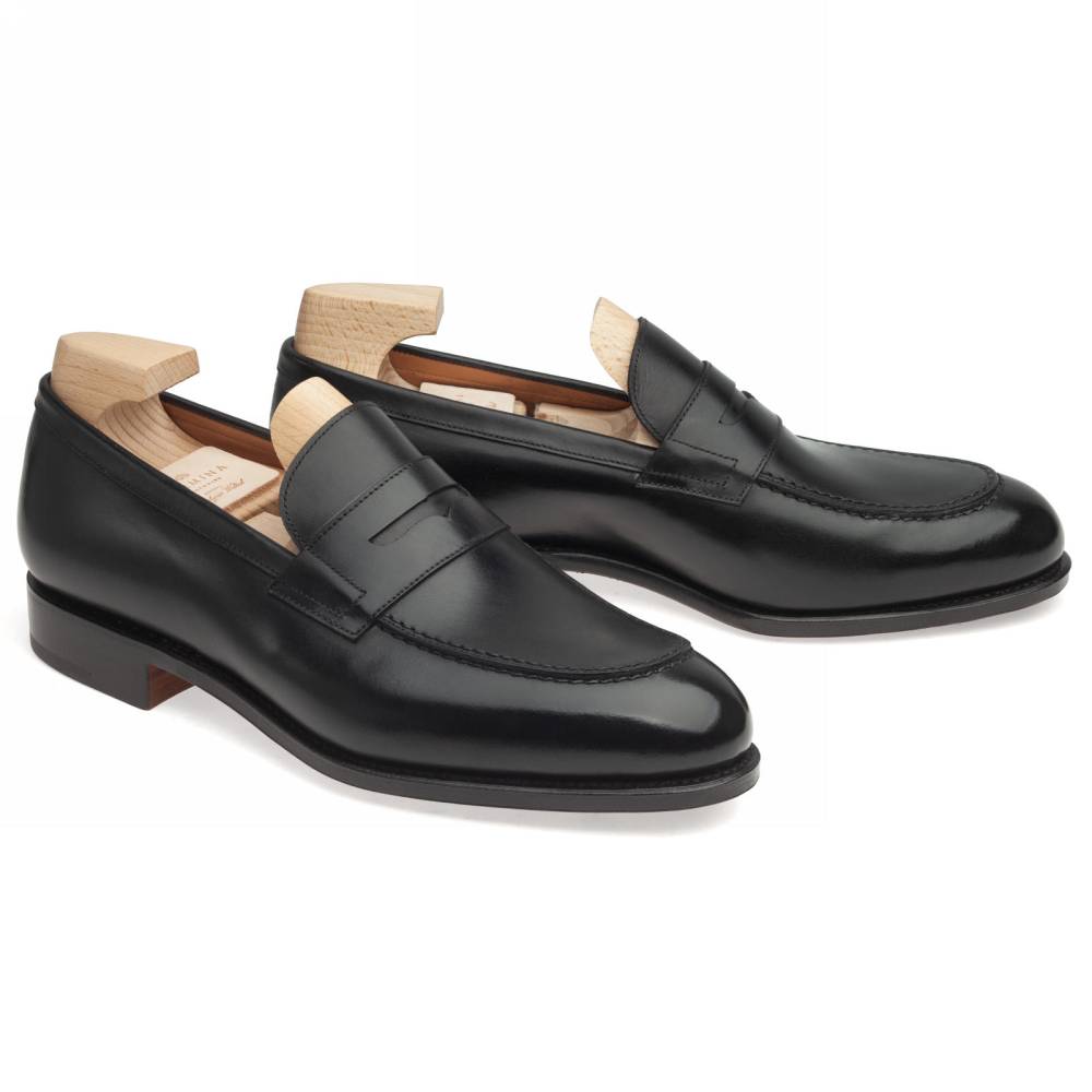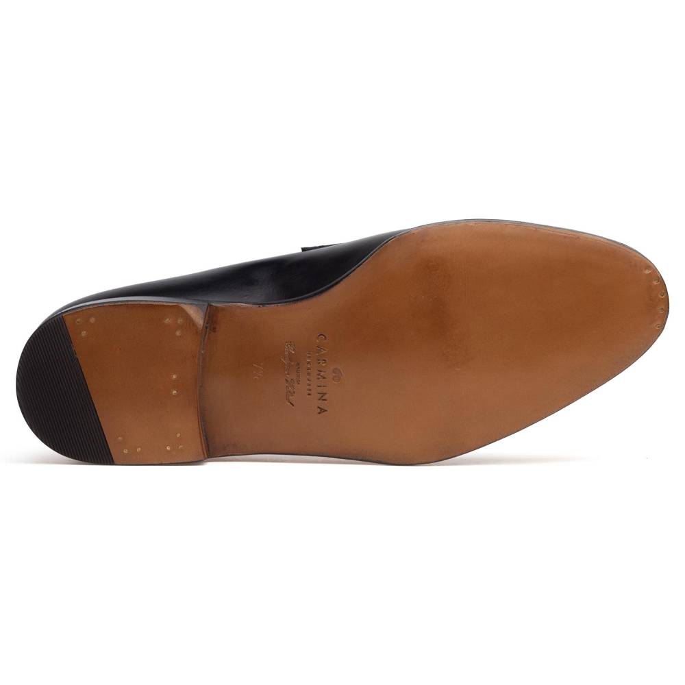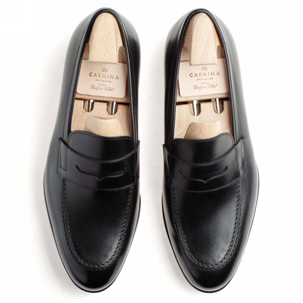 Классические чёрные пенни-лоферы испанского бренда Carmina на кожаной подошве. Верх выполнен из высококачественной телячьей кожи, поставляемой немецкой дубильней Weinheimer. Шов на подошве закрыт. Это делает её гладкой, а также защищает от проникновения влаги. Внутренняя отделка из тонкой бежевой кожи растительного дубления. Конструкция Goodyear Welted.