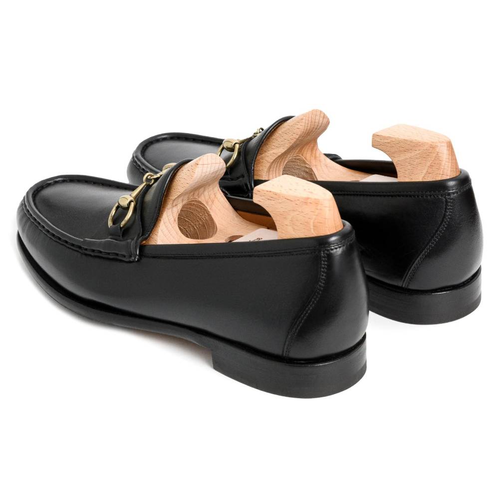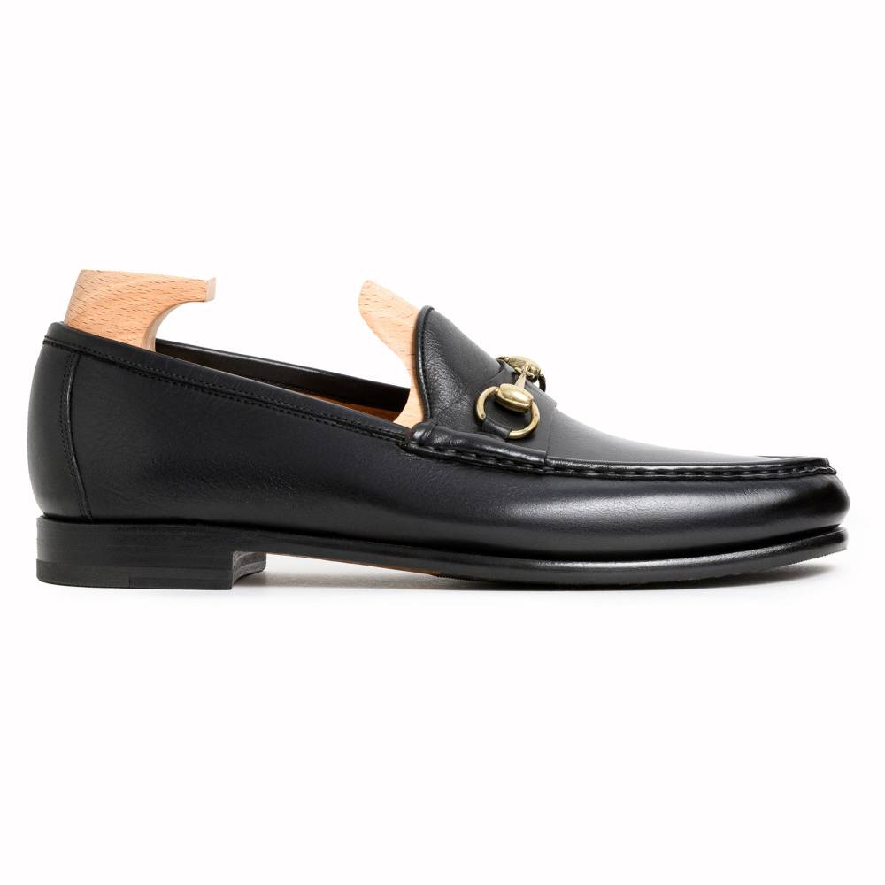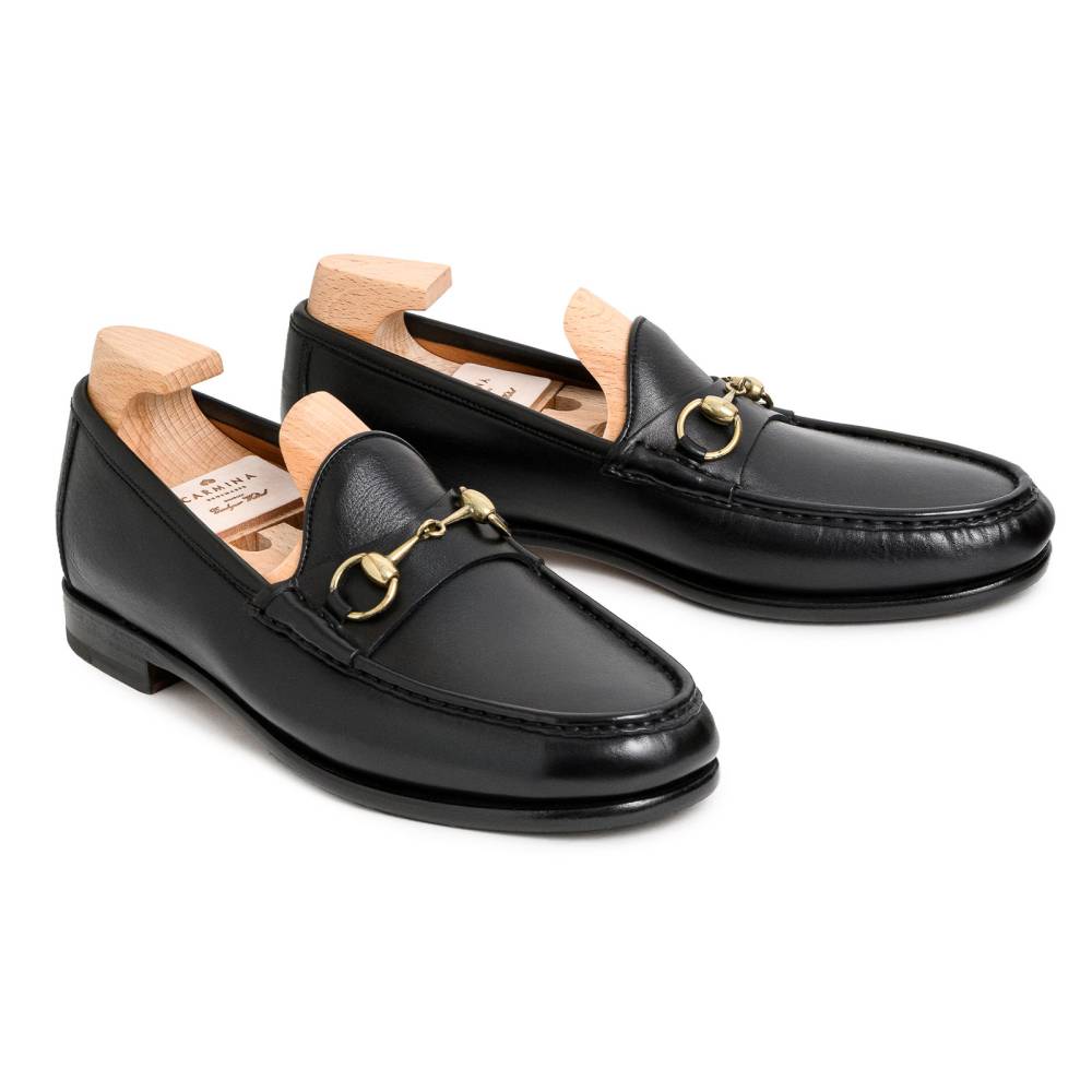 Классические лоферы испанской марки Carmina на кожаной подошве. Верх выполнен из плотной телячьей кожи чёрного цвета; внутренняя отделка — из тонкой телячьей кожи. Модель украшена металлической пряжкой в форме удил. Впервые лоферы такого фасона (horsebit) появились в коллекции итальянского бренда Gucci в 1953 году и скоро стали классическим элементом гардероба. Конструкция Blake.