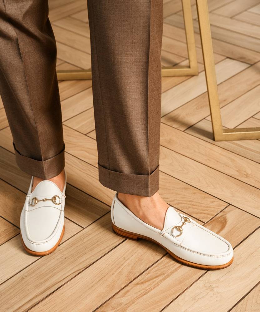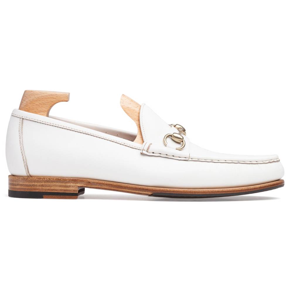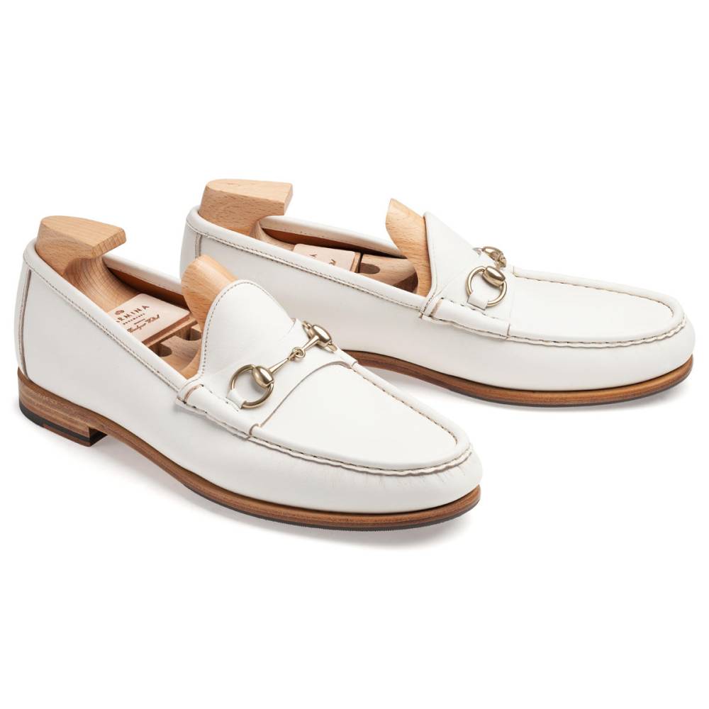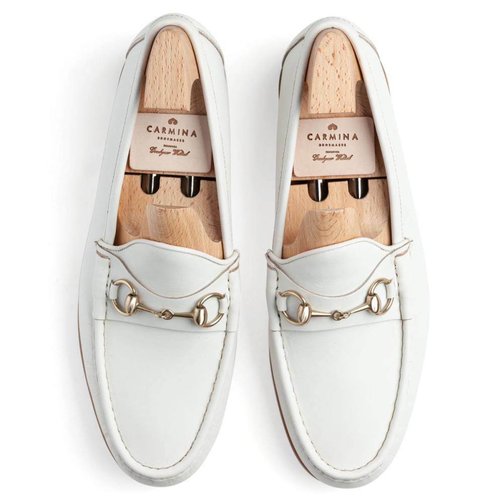 Классические лоферы испанской марки Carmina на кожаной подошве с заводской профилактикой. Верх выполнен из плотной телячьей кожи белого цвета; внутренняя отделка — из тонкой телячьей кожи. Натуральный цвет торцов подошвы и каблуков гармонирует с белым верхом. Модель украшена металлической пряжкой в форме удил. Впервые лоферы такого фасона (horsebit) появились в коллекции итальянского бренда Gucci в 1953 году и скоро стали классическим элементом гардероба. Конструкция Blake.