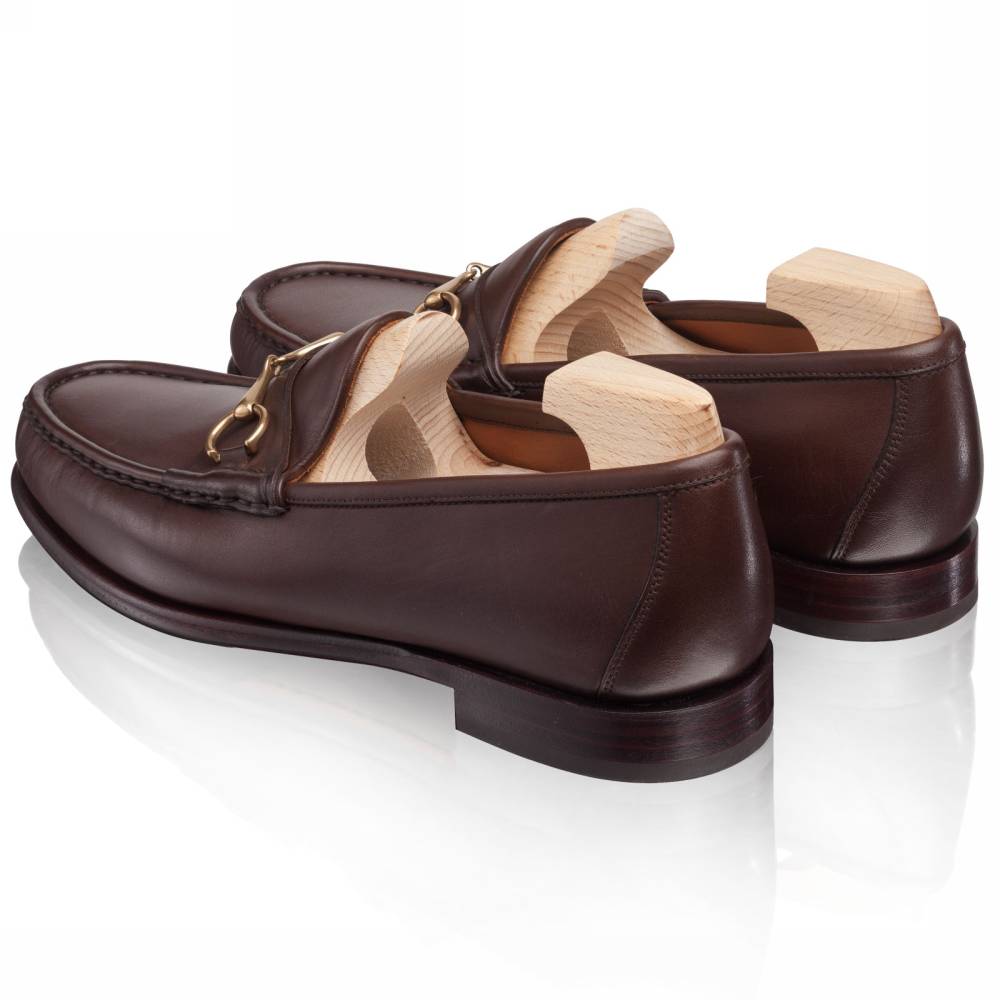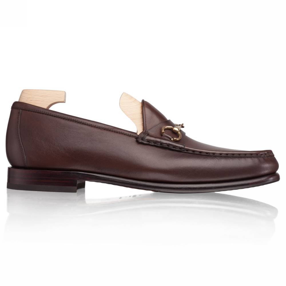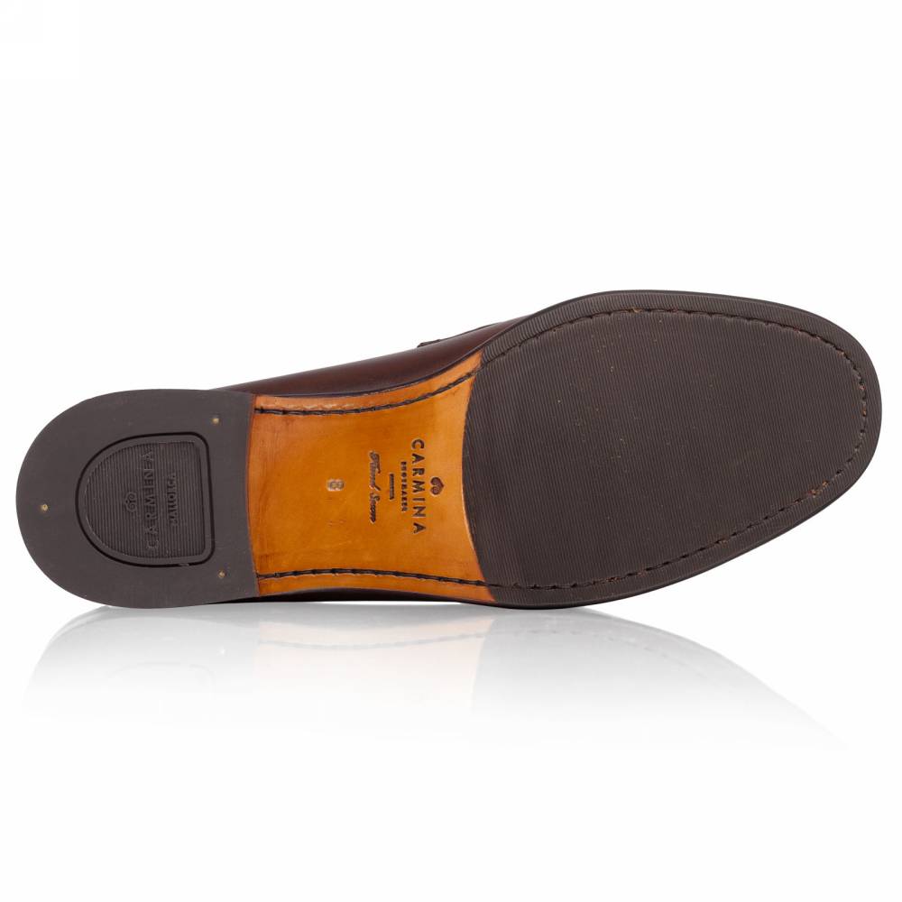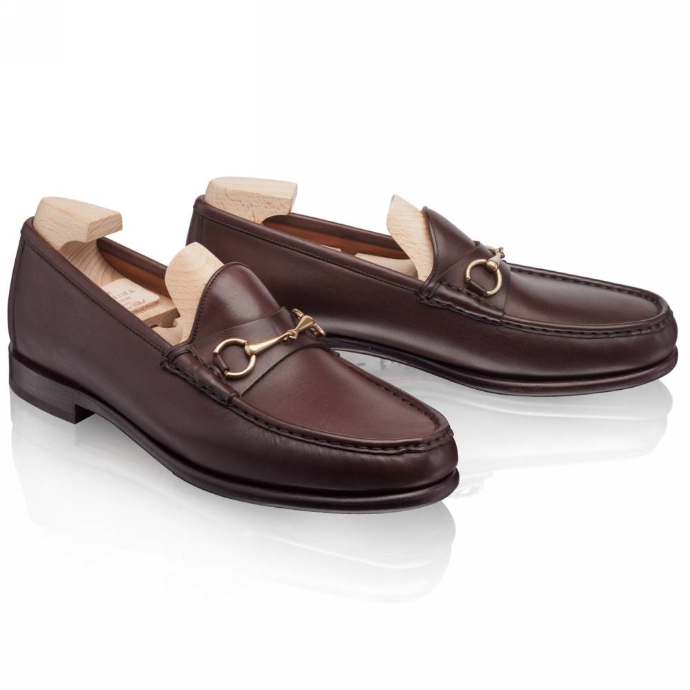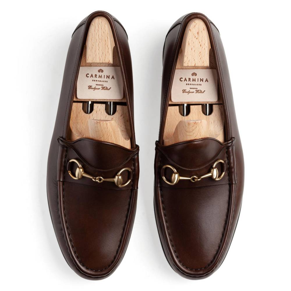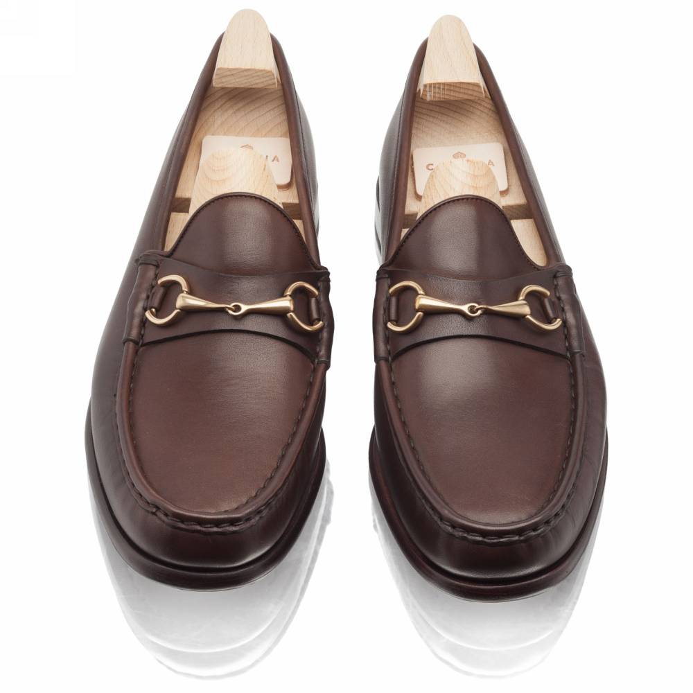 Классические тёмно-коричневые лоферы испанской марки Carmina на кожаной подошве с заводской профилактикой. Верх выполнен из плотной телячьей кожи тёмно-коричневого цвета; внутренняя отделка — из тонкой телячьей кожи. Модель украшена металлической пряжкой в форме удил. Впервые лоферы такого фасона (horsebit) появились в коллекции итальянского бренда Gucci в 1953 году и скоро стали классическим элементом гардероба. Конструкция Blake.