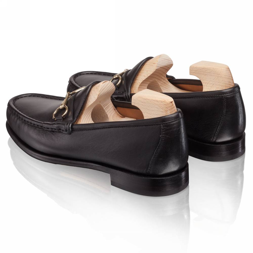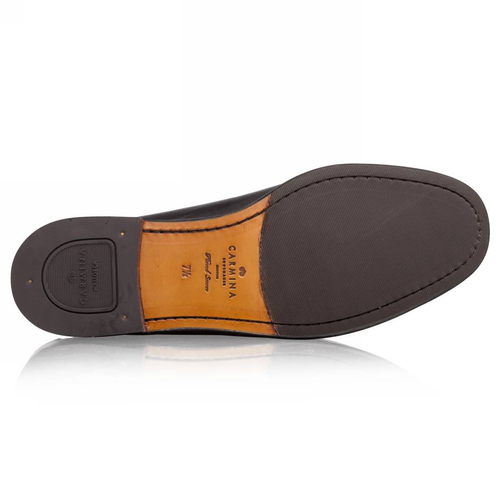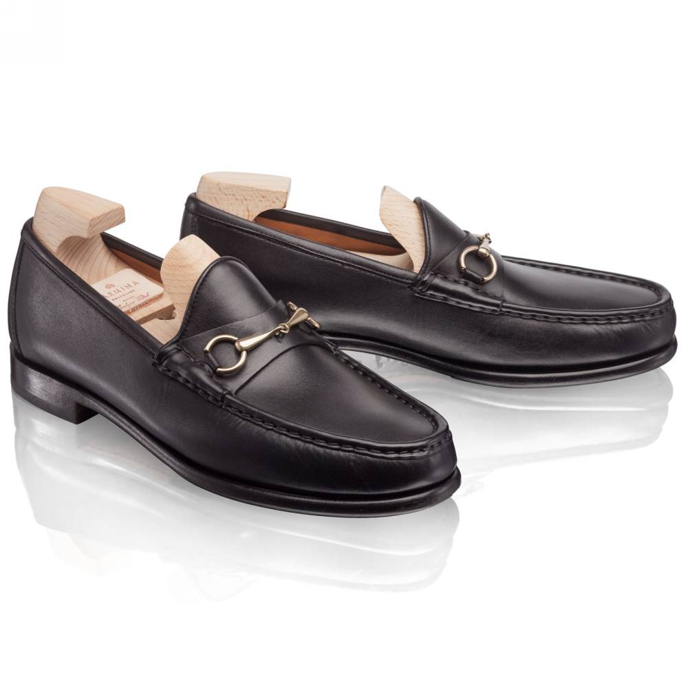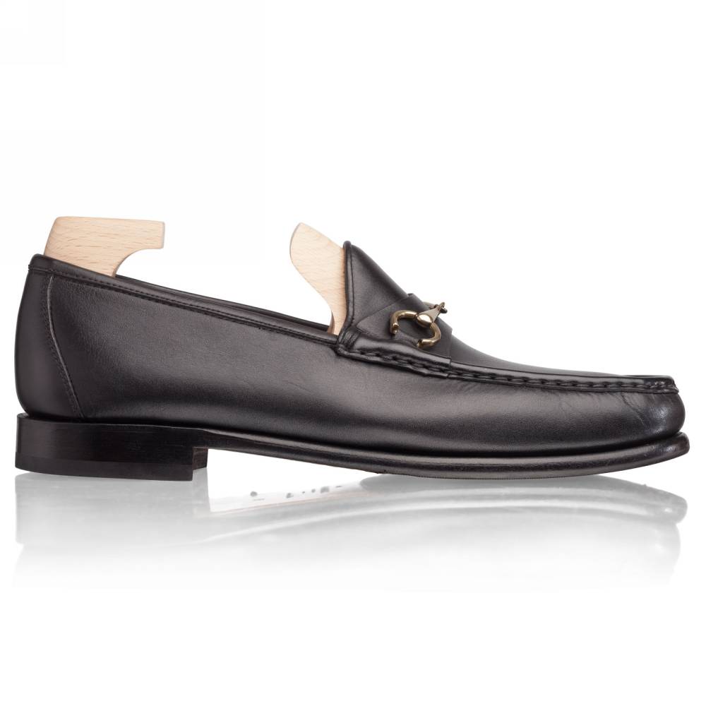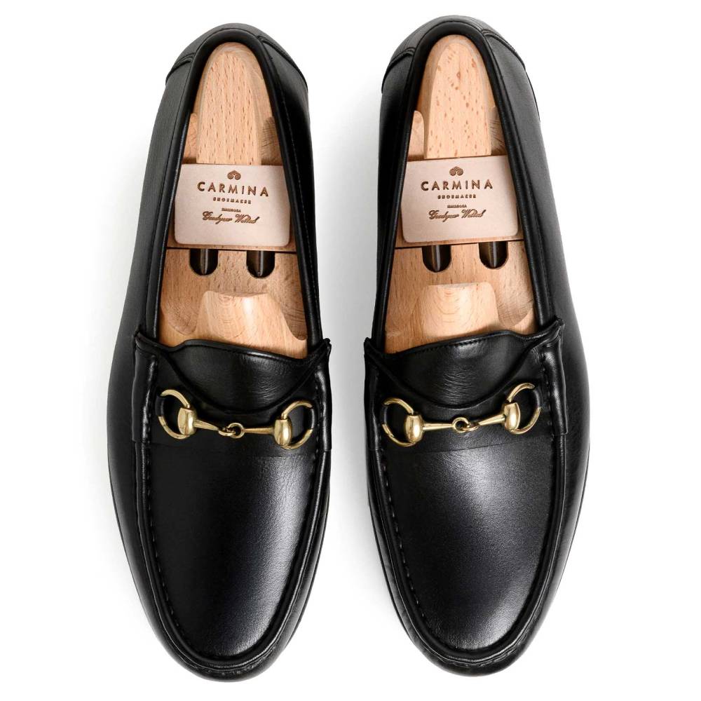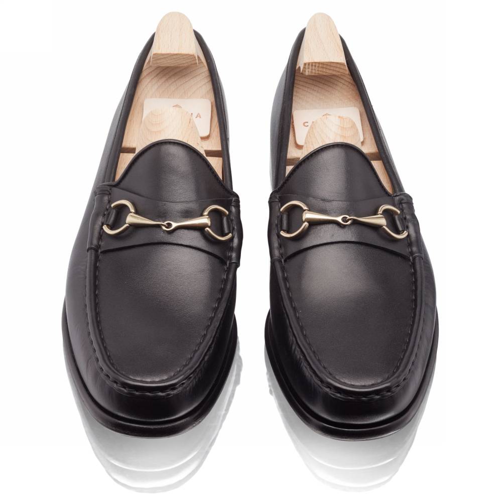 Классические лоферы испанской марки Carmina на кожаной подошве с заводской профилактикой. Верх выполнен из плотной телячьей кожи чёрного цвета; внутренняя отделка — из тонкой телячьей кожи. Модель украшена металлической пряжкой в форме удил. Впервые лоферы такого фасона (horsebit) появились в коллекции итальянского бренда Gucci в 1953 году и скоро стали классическим элементом гардероба. Конструкция Blake.