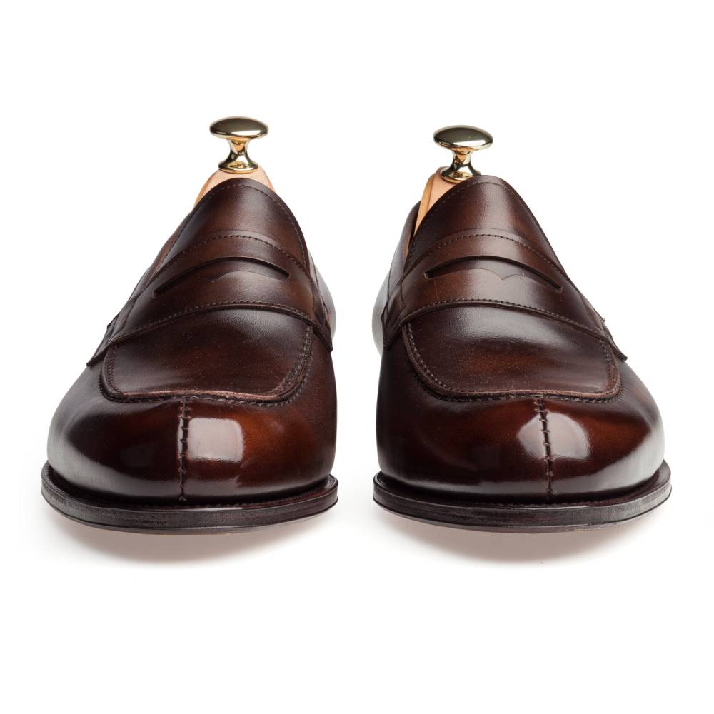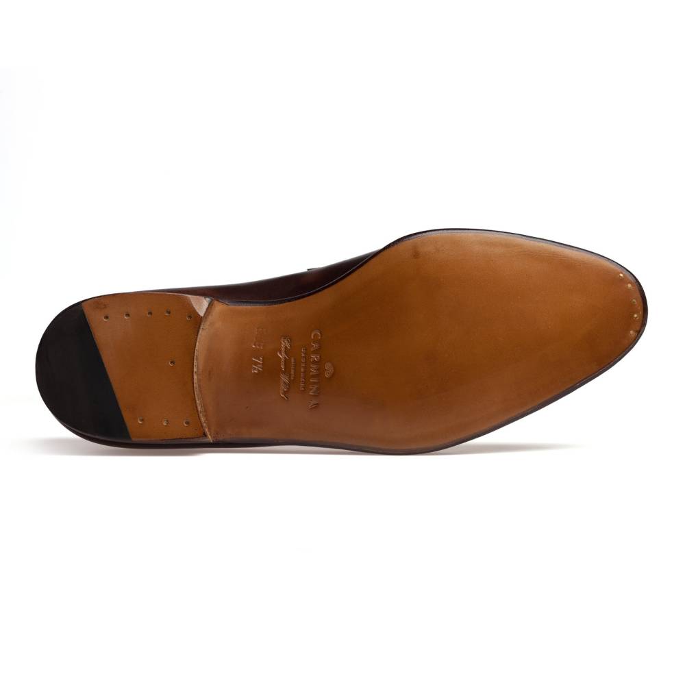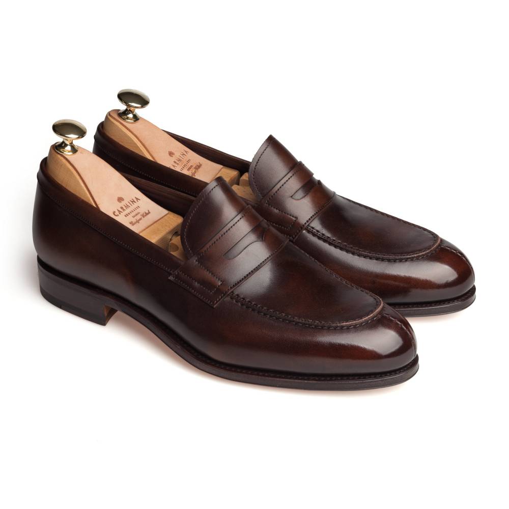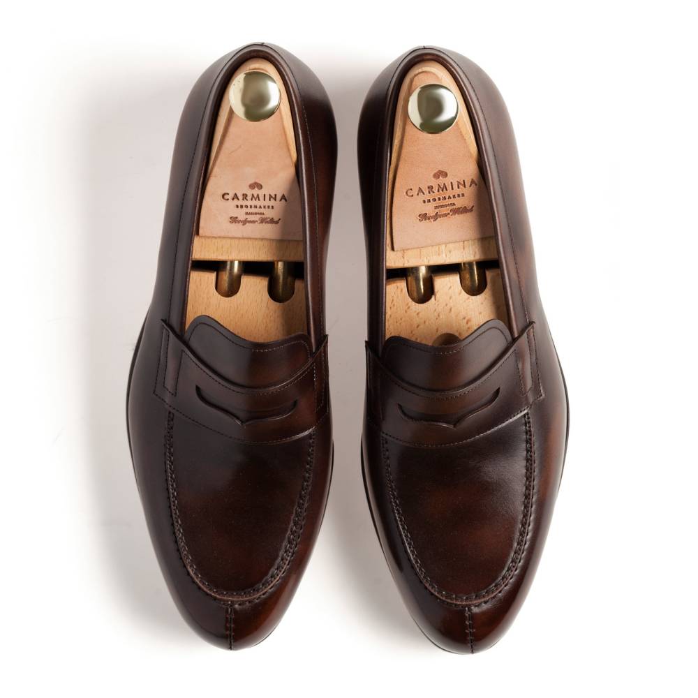 Повседневные деловые пенни-лоферы Carmina Shoemaker на кожаной подошве. Модель представляет собой лоферы в норвежском стиле с тремя сшитыми элементами в передней части (split toe loafers). Для верха использовалась высококачественная гладкая телячья кожа тёмно-коричневого цвета с градиентными переходами. Особенностью модели является яркая подкладка фиолетового цвета. Конструкция Goodyear Welted.