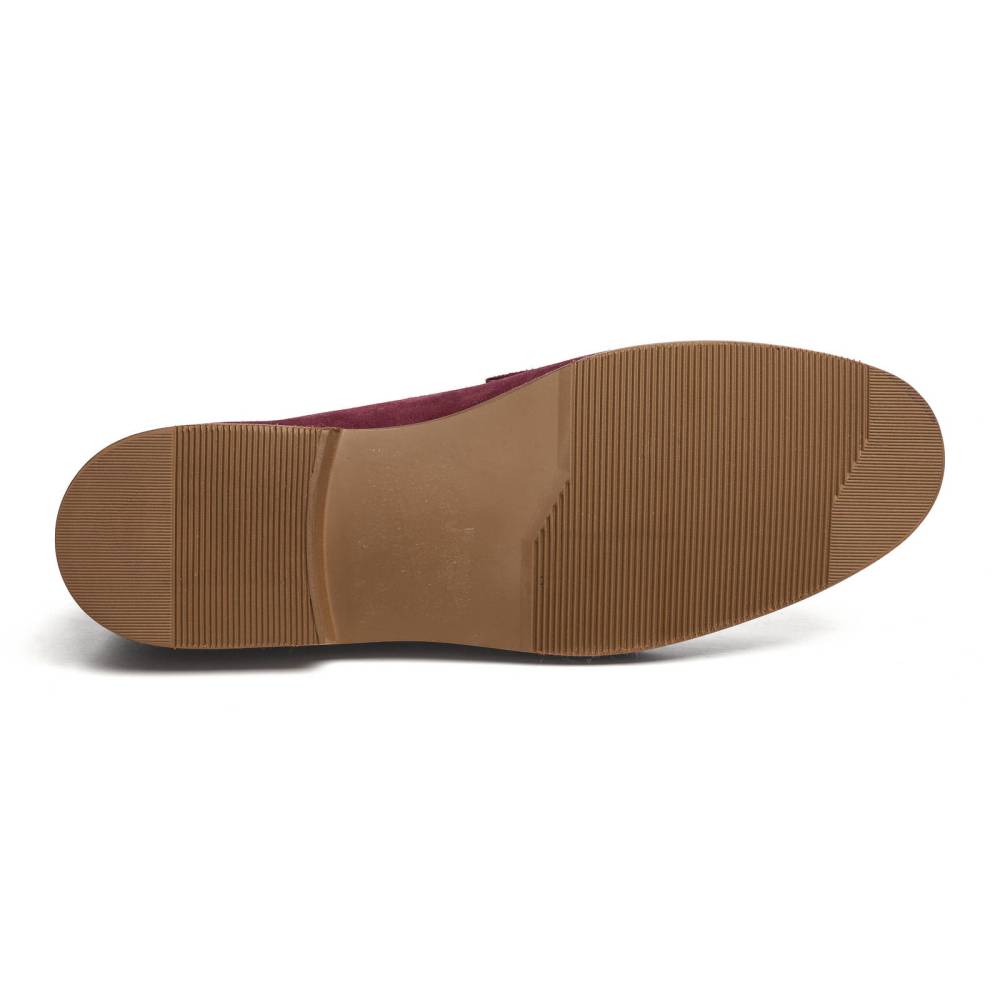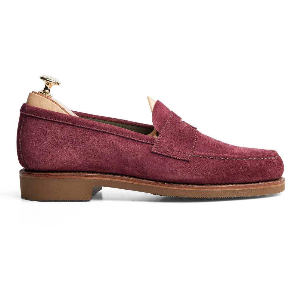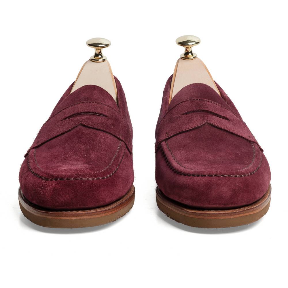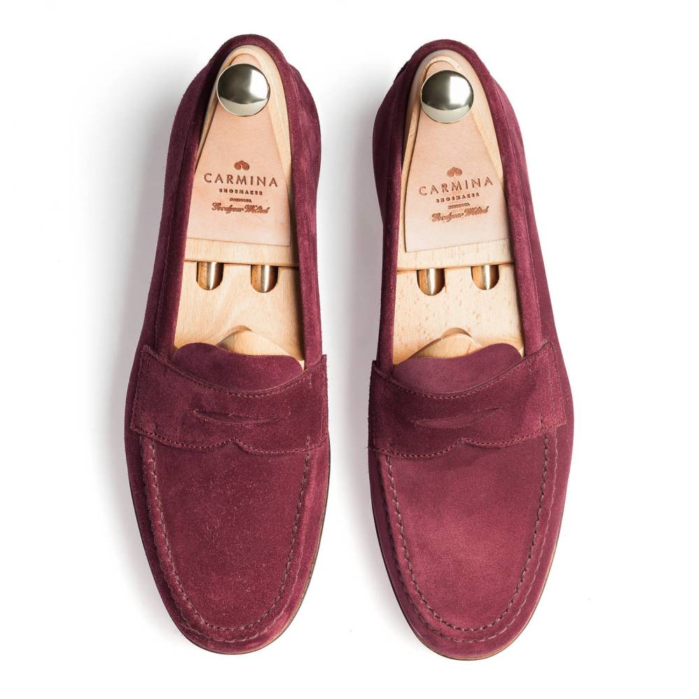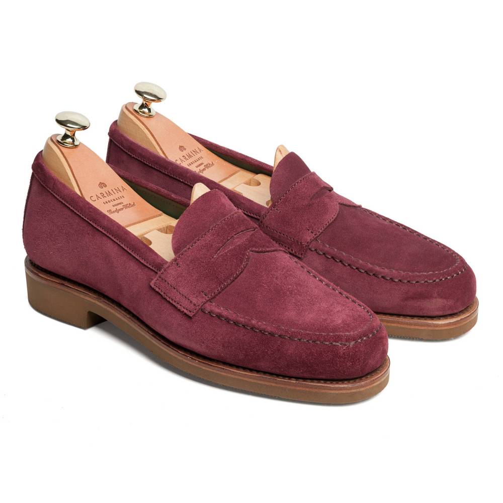 Традиционные пенни-лоферы бордового цвета Carmina на плотной резиновой подошве. Верх выполнен из высококачественной бархатистой замши, внутренняя отделка из тонкой коричневой кожи. Конструкция Goodyear Welted.
