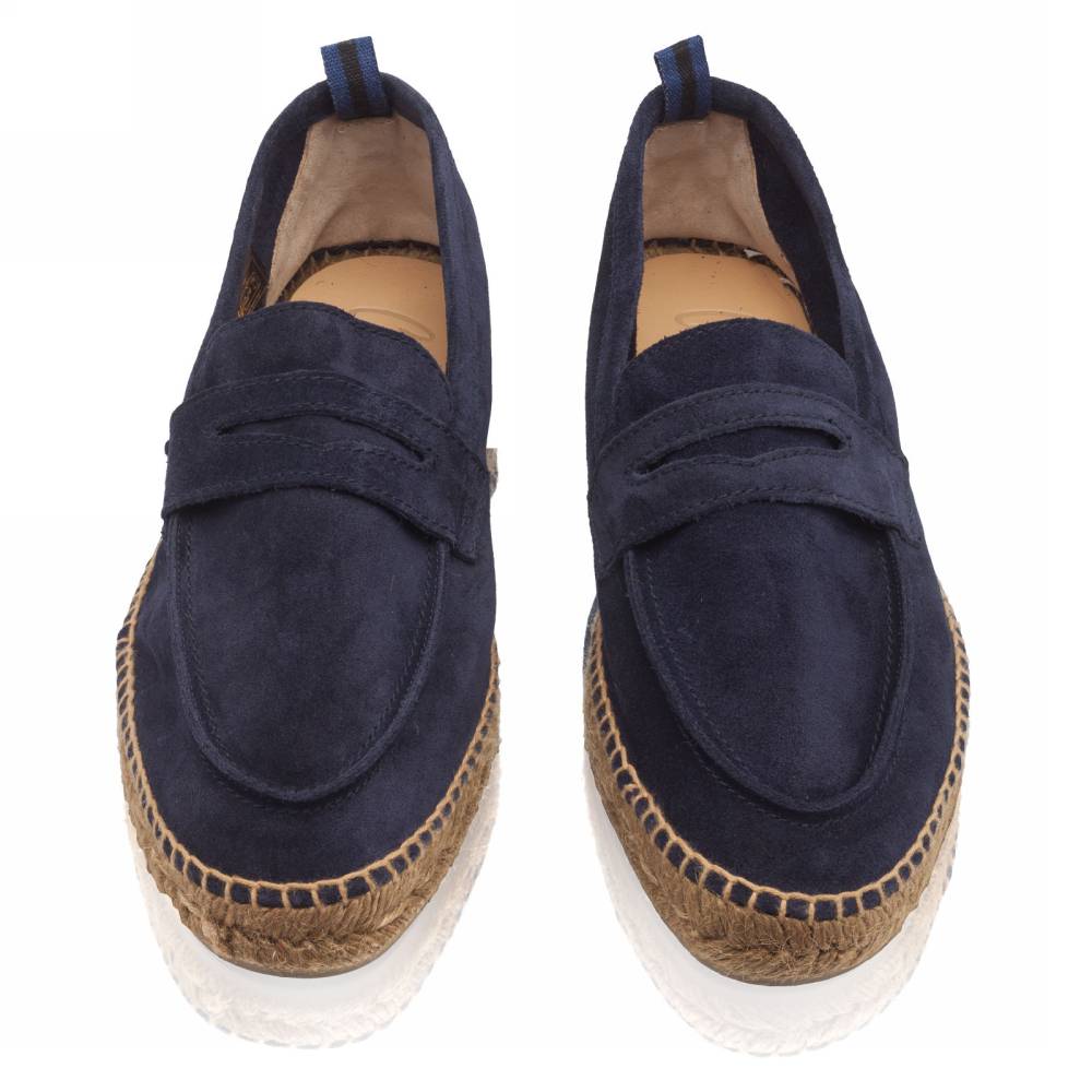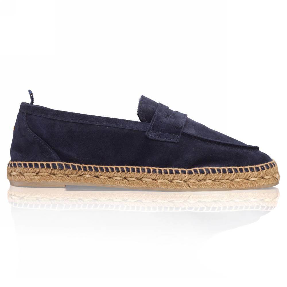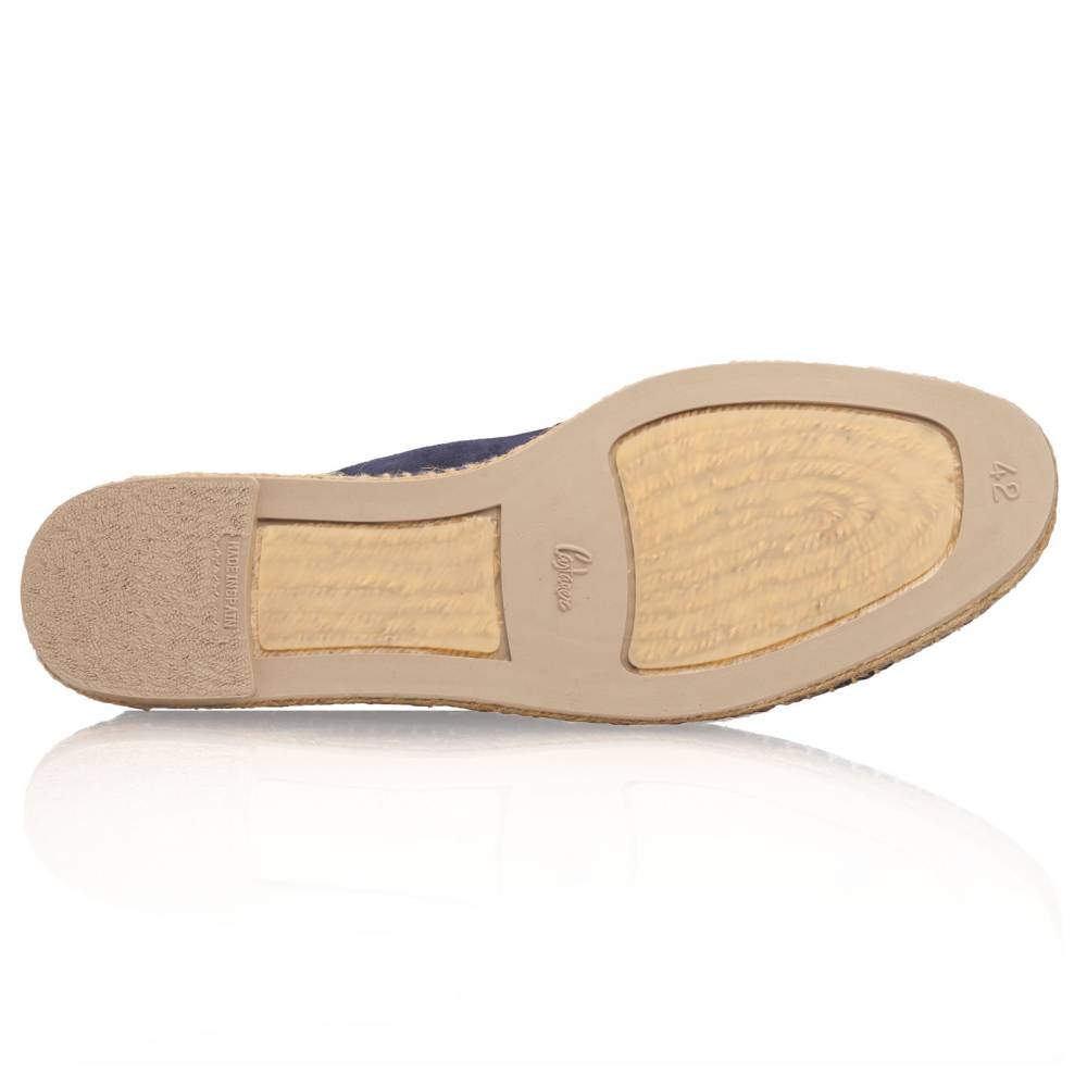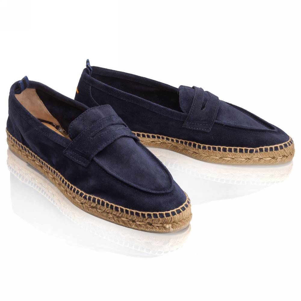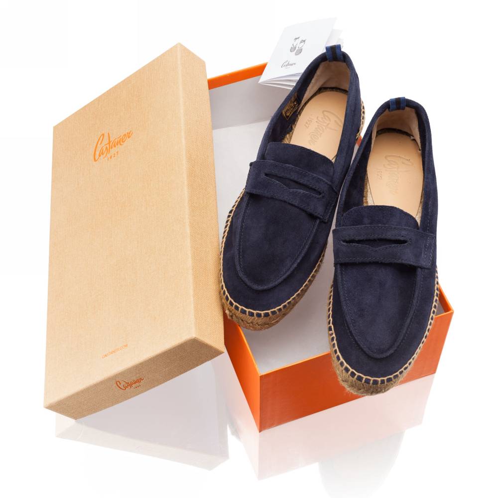 Мужские лоферы Castañer созданы из качественных натуральных материалов подобно эспадрильям. Верх выполнен из мягкой натуральной замши тёмно-синего цвета без подкладки. Подошва состоит из нескольких слоёв джута - натурального волокнистого материала. Благодаря джуту обувь имеет высокую воздухопроницаемость и идеально подходит даже для самой жаркой погоды. От влаги и изнашивания джутовую подошву защищает тонкий слой резины снизу.