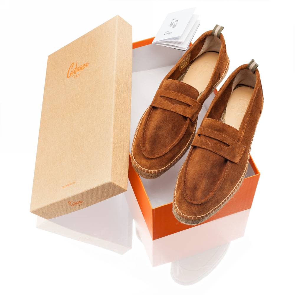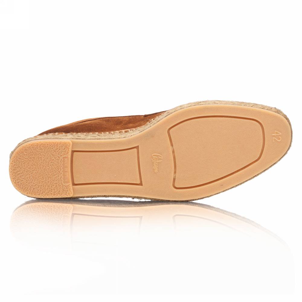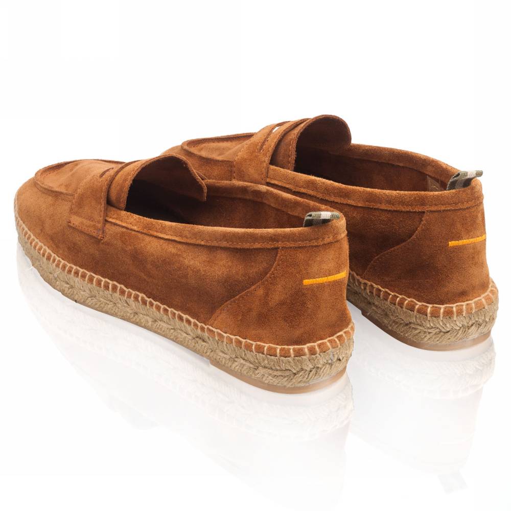 Мужские лоферы Castañer созданы из качественных натуральных материалов подобно эспадрильям. Верх выполнен из мягкой натуральной замши коричневого цвета без подкладки. Подошва состоит из нескольких слоёв джута - натурального волокнистого материала. Благодаря джуту обувь имеет высокую воздухопроницаемость и идеально подходит даже для самой жаркой погоды. От влаги и изнашивания джутовую подошву защищает тонкий слой резины снизу.