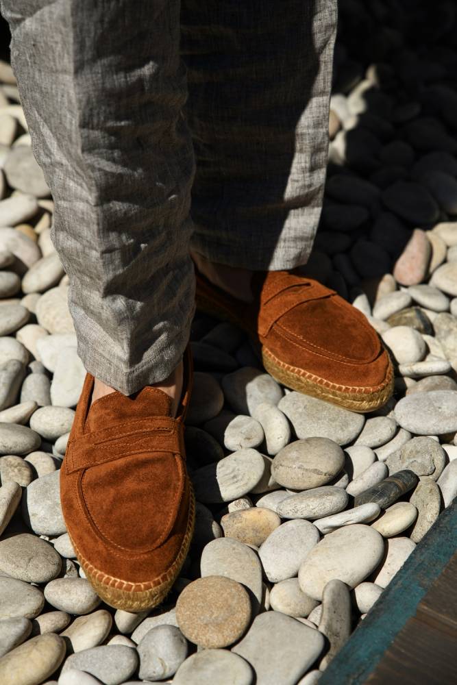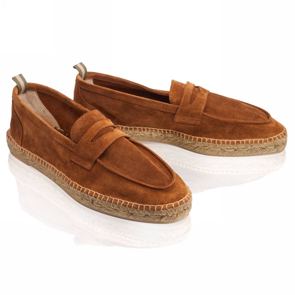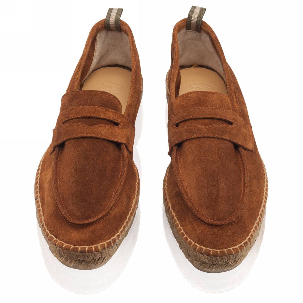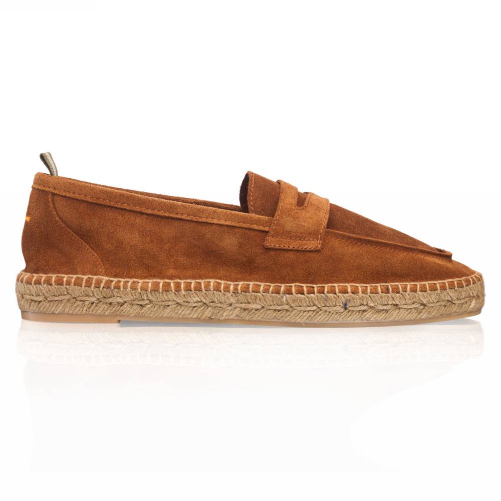 Мужские лоферы Castañer созданы из качественных натуральных материалов подобно эспадрильям. Верх выполнен из мягкой натуральной замши коричневого цвета без подкладки. Подошва состоит из нескольких слоёв джута - натурального волокнистого материала. Благодаря джуту обувь имеет высокую воздухопроницаемость и идеально подходит даже для самой жаркой погоды. От влаги и изнашивания джутовую подошву защищает тонкий слой резины снизу.