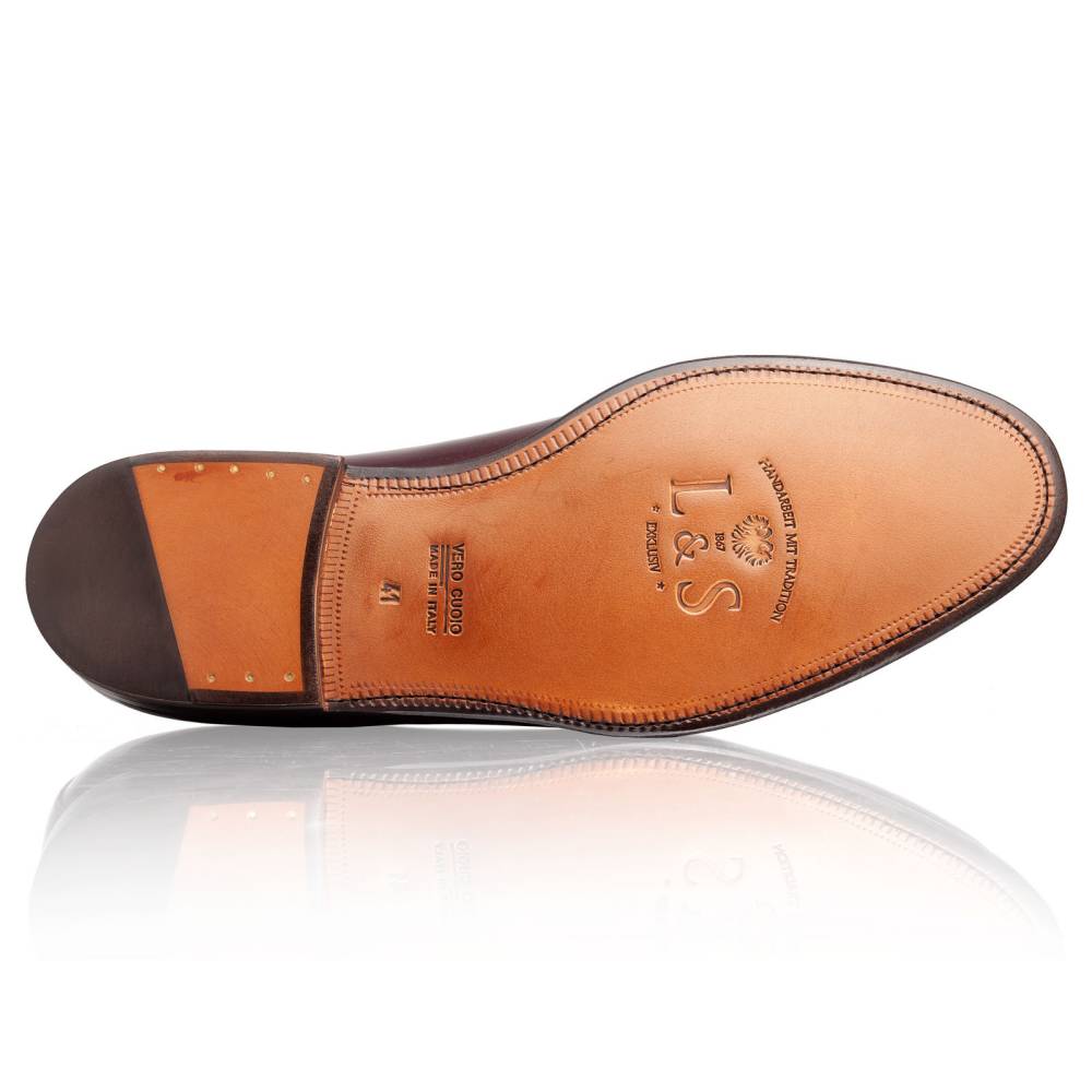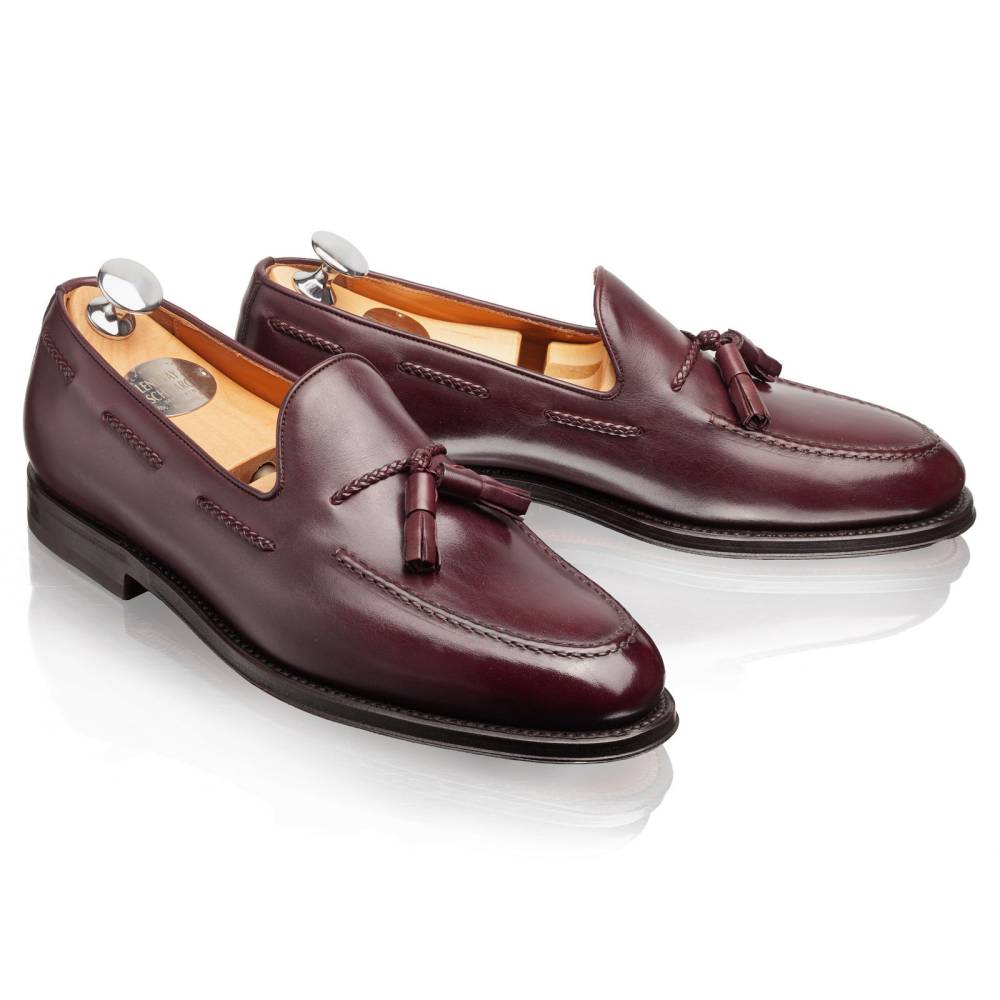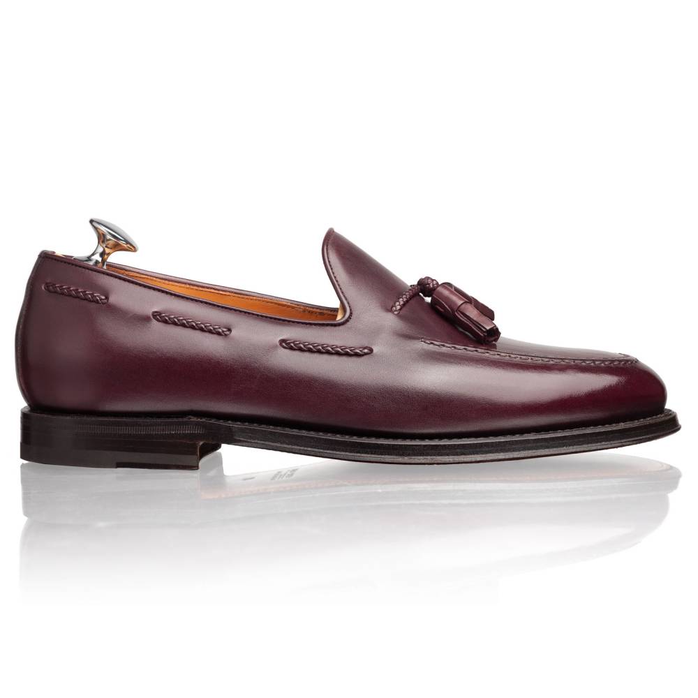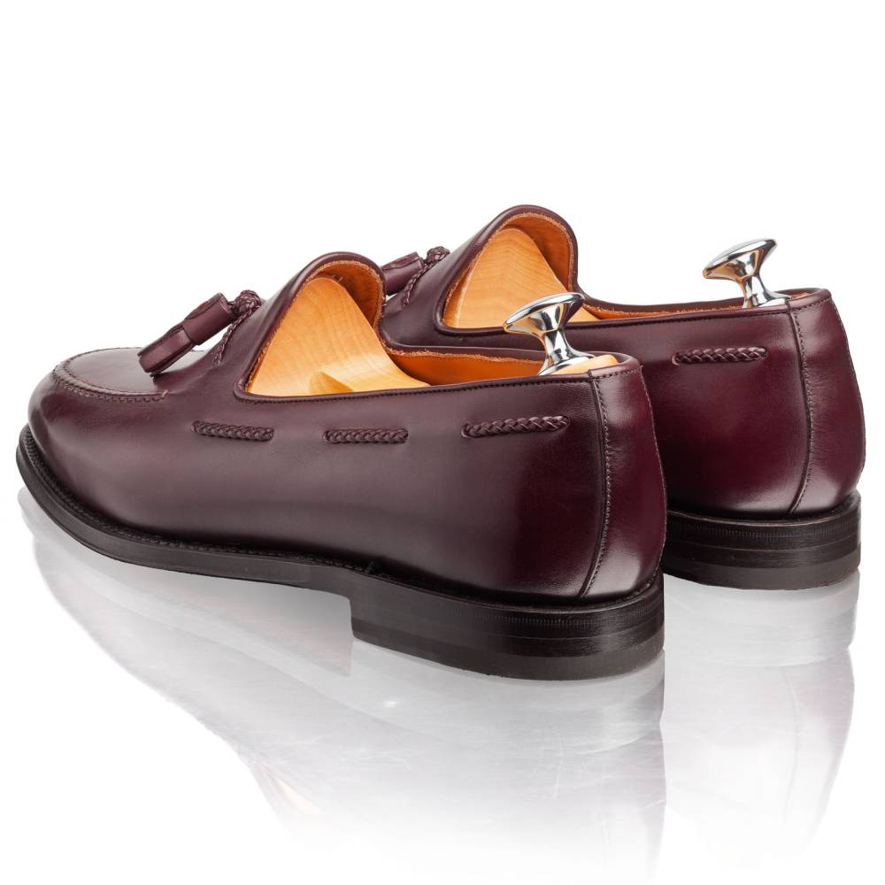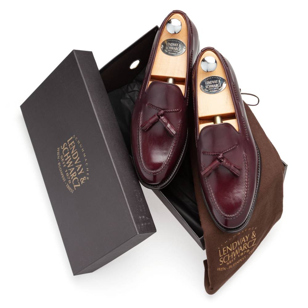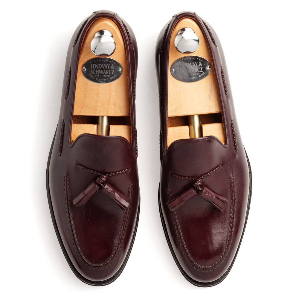 Традиционные лоферы Lendvay & Schwarcz с кисточками бордового цвета на кожаной подошве. Верх выполнен из плотной телячьей кожи итальянского производства. Особенностью данной модели является шнурок оригинального плетения, пропущенный по бокам. Внутренняя отделка из тонкой бежевой кожи. Под сводом стопы имеется мягкий супинатор для поддержки. Область пятки с внутренней стороны с шероховатой поверхностью, чтобы стопа лучше фиксировалась при ходьбе. Гибкая и лёгкая конструкция Blake Rapid.