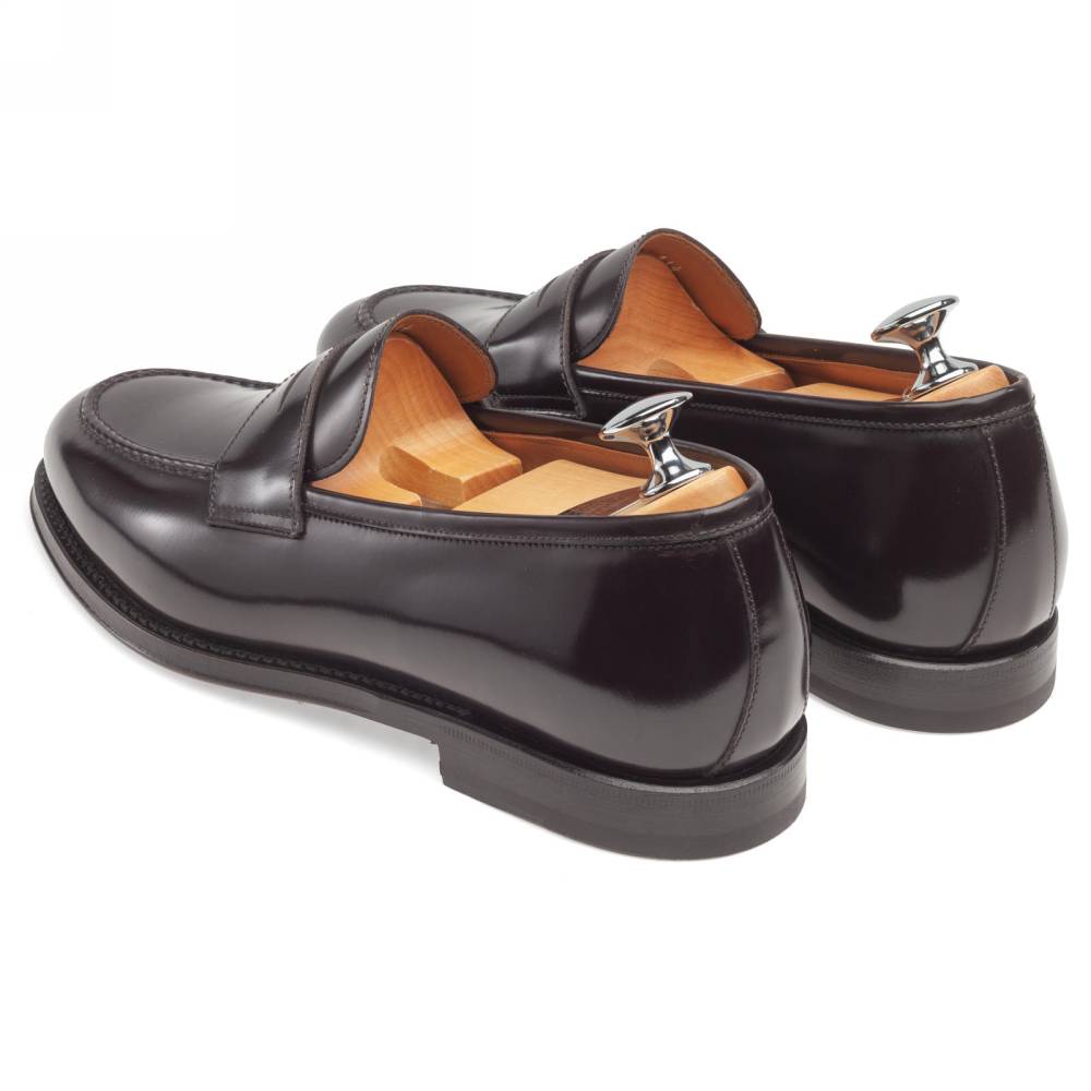 Традиционные пенни-лоферы тёмно-коричневого цвета Lendvay & Schwarcz на кожаной подошве. Верх выполнен из плотной полированной телячьей кожи высокого качества итальянского производства c изысканным блеском, благодаря которому она выглядит подобно конской коже (cordovan leather). Внутренняя отделка из тонкой бежевой кожи. Конструкция Blake Rapid с пробковым слоем.