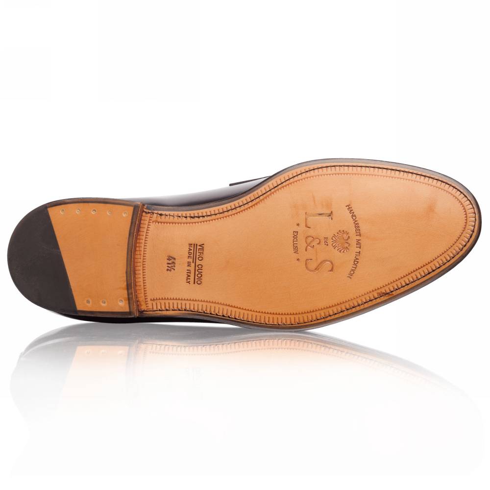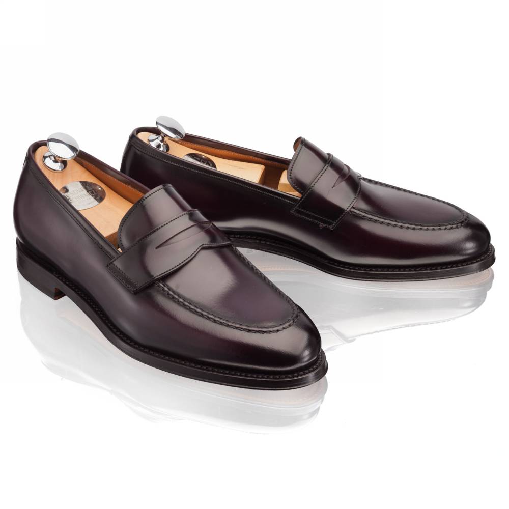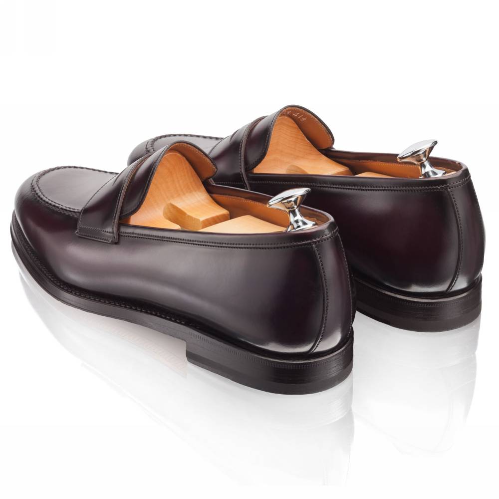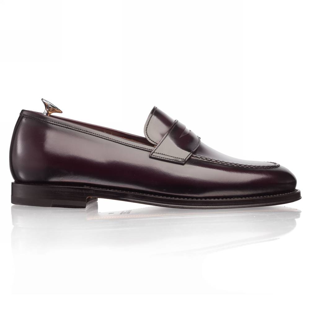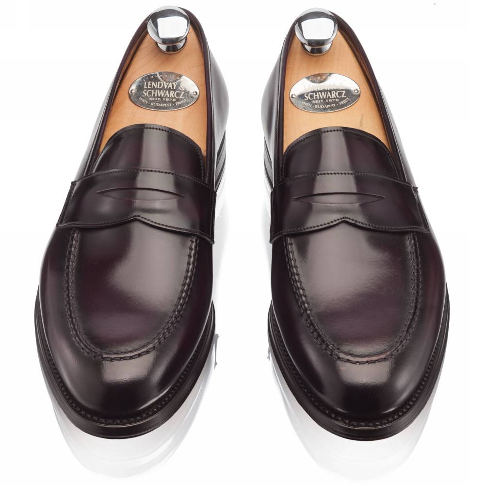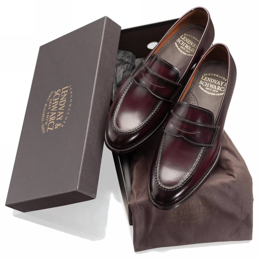 Традиционные пенни-лоферы тёмно-бордового цвета Lendvay & Schwarcz на кожаной подошве. Верх выполнен из плотной полированной телячьей кожи высокого качества итальянского производства c изысканным блеском, благодаря которому она выглядит подобно конской коже (cordovan leather). Внутренняя отделка из тонкой бежевой кожи. Конструкция Blake Rapid с пробковым слоем.