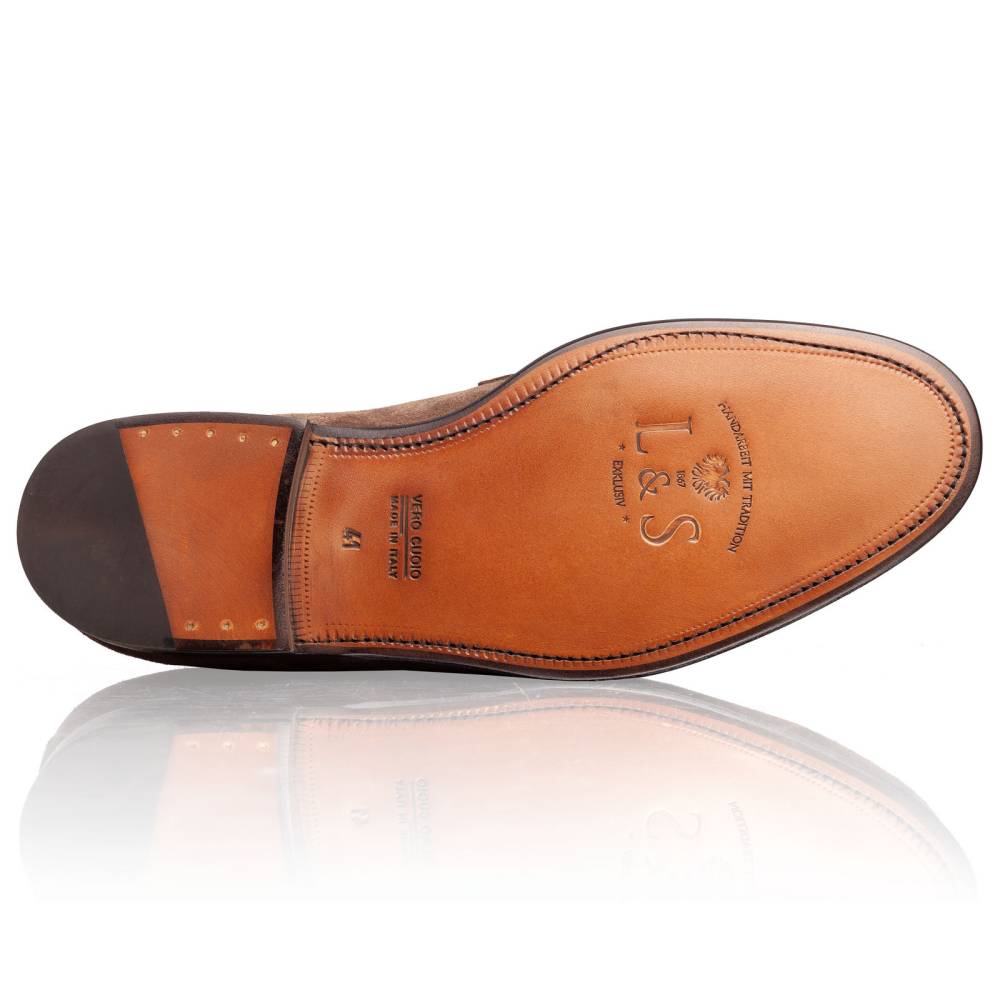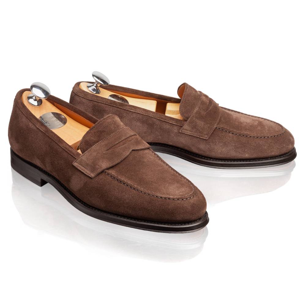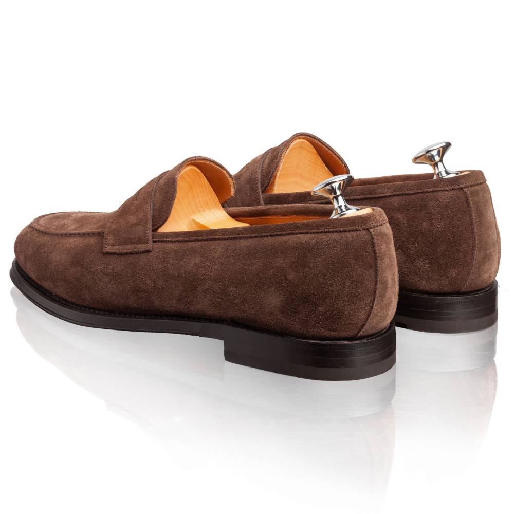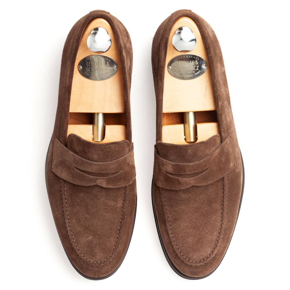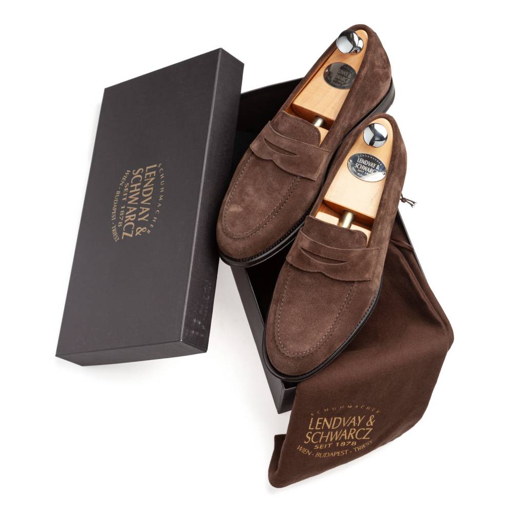 Элегантные замшевые пенни-лоферы Lendvay & Schwarcz на кожаной подошве. Верх выполнен из приятной на ощупь замши коричневого цвета с лёгкой защитой от влаги. Внутренняя отделка из тонкой бежевой кожи. Под сводом стопы имеется мягкий супинатор для поддержки. Область пятки с внутренней стороны с шероховатой поверхностью, чтобы стопа лучше фиксировалась при ходьбе. Гибкая и лёгкая конструкция Blake Rapid.