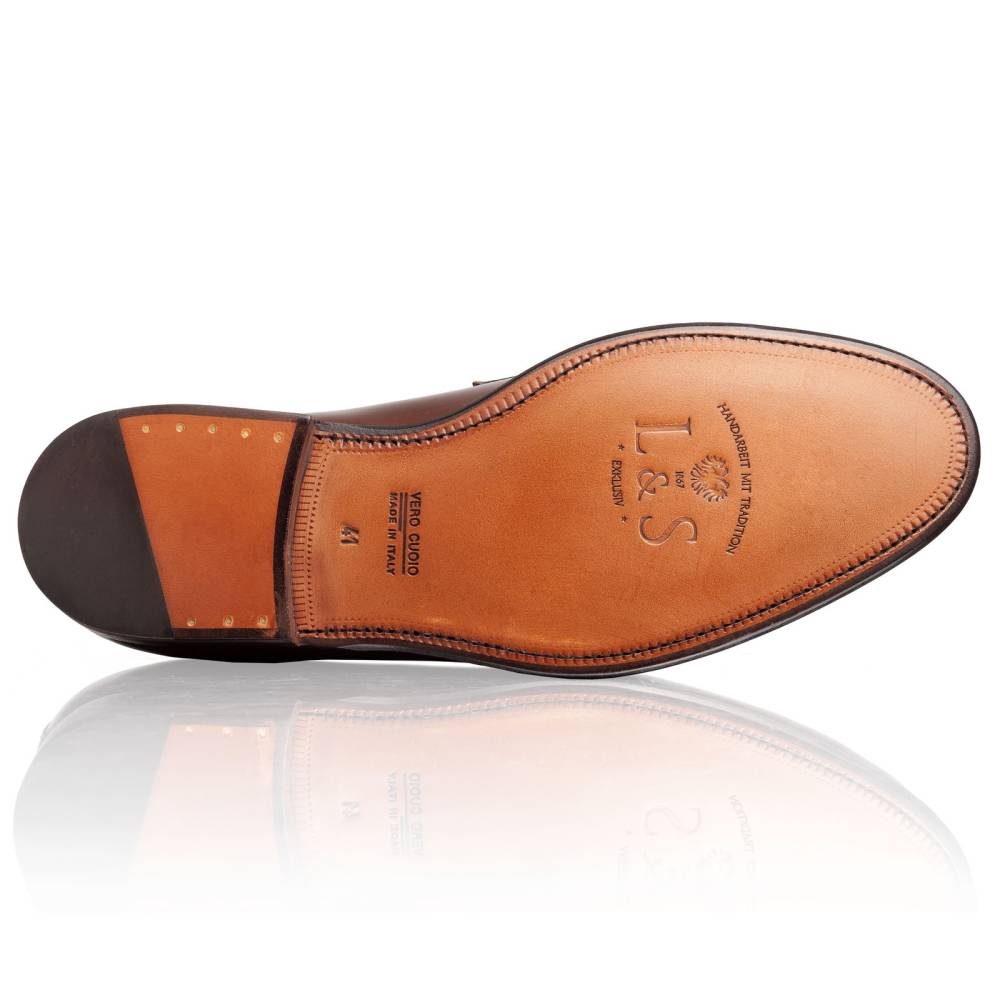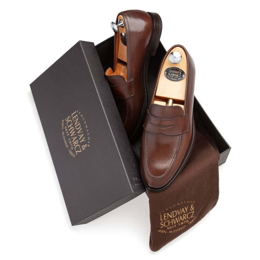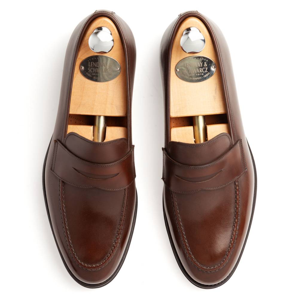 Сдержанные пенни-лоферы Lendvay & Schwarcz на кожаной подошве. Верх выполнен из высококачественной телячьей кожи итальянского производства тёплого коричневого цвета. Внутренняя отделка из тонкой бежевой кожи. Под сводом стопы имеется мягкий супинатор для поддержки. Область пятки с внутренней стороны с шероховатой поверхностью, чтобы стопа лучше фиксировалась при ходьбе. Гибкая и лёгкая конструкция Blake Rapid.