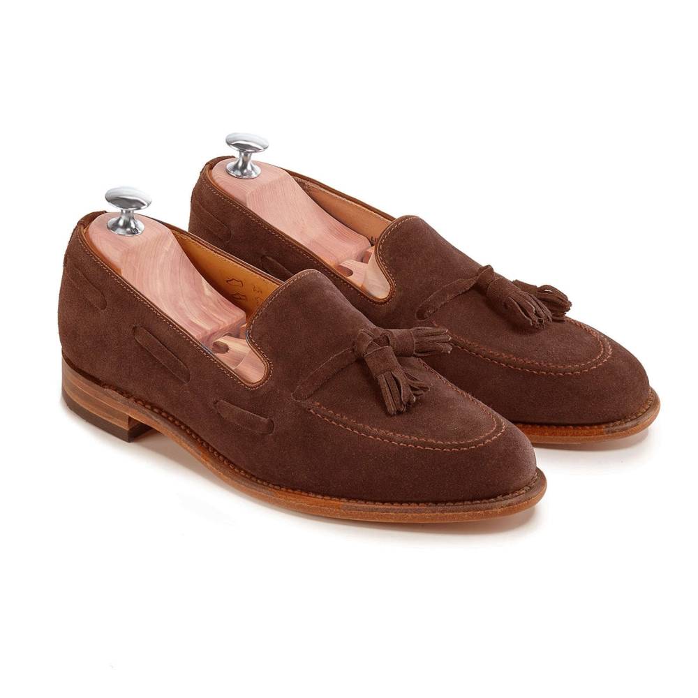Лоферы Loake Lincoln из коллекции Shoemakers на кожаной подошве. Верх выполнен из мягкой бархатистой замши коричневого цвета. По бокам пропущен замшевый шнурок, завершающийся кисточками на подъёме. Внутренняя отделка из тонкой гладкой кожи. Конструкция Goodyear.