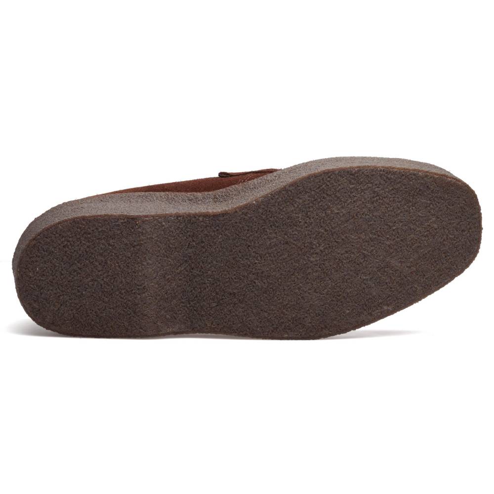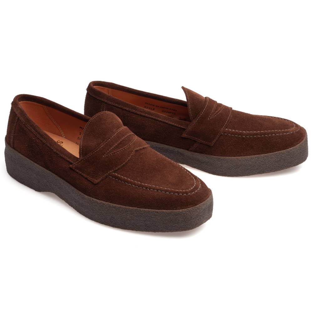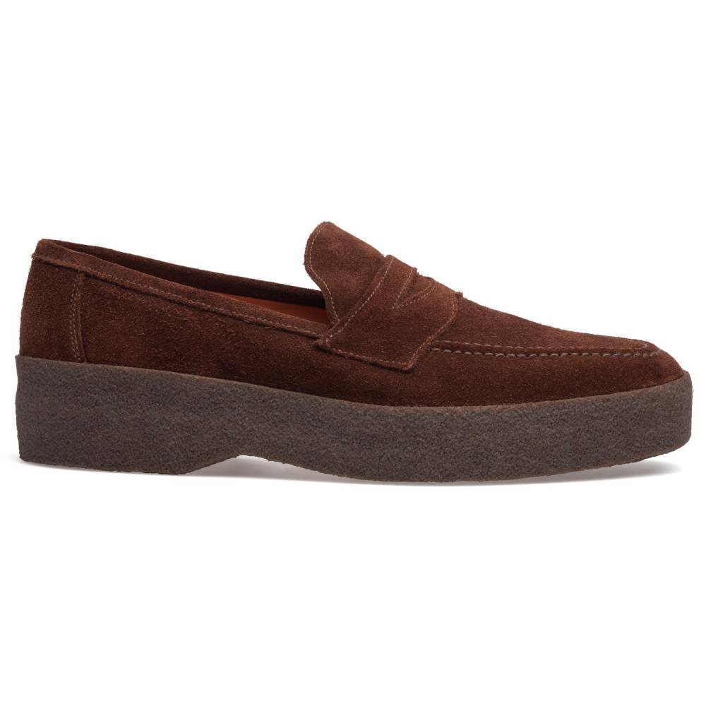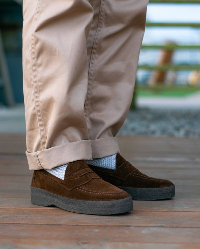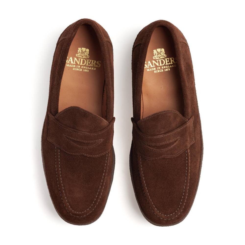 Удобные и мягкие мужские лоферы Sanders на высокой подошве из натурального каучука, вдохновлённые стилистикой культовой модели Hi Top, которую носил актёр Стив МакКуин. Верх выполнен из высококачественной коричневой замши с водоотталкивающей защитой, поставляемой английской дубильней Charles F. Stead & Co. Внутри подкладка из тонкой бежевой кожи и цельная кожаная стелька. Особый комфорт доставляет массивная креповая подошва с отличными амортизирующими свойствами. Несмотря на то, что обувь сшита не в конструкции Goodyear Welted, между подошвой и стелькой также проложен слой из пробки, который со временем промнётся и примет форму стопы. Модель выпущена в ограниченном количестве по специальному заказу (MTO)