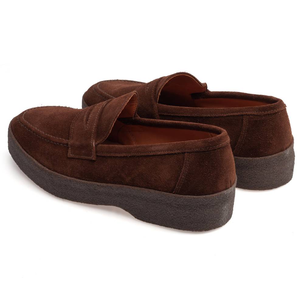 Лоферы выполнены в конструкции Cemented. Все части верха заворачиваются под стельку и приклеиваются к креповой подошве. Затем, на специальном станке, тонкая горячая креповая лента спаивается с замшей и подошвой по всей окружности.