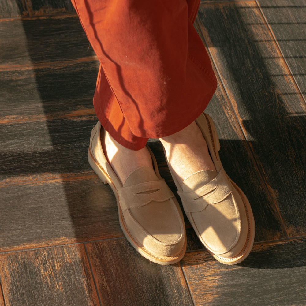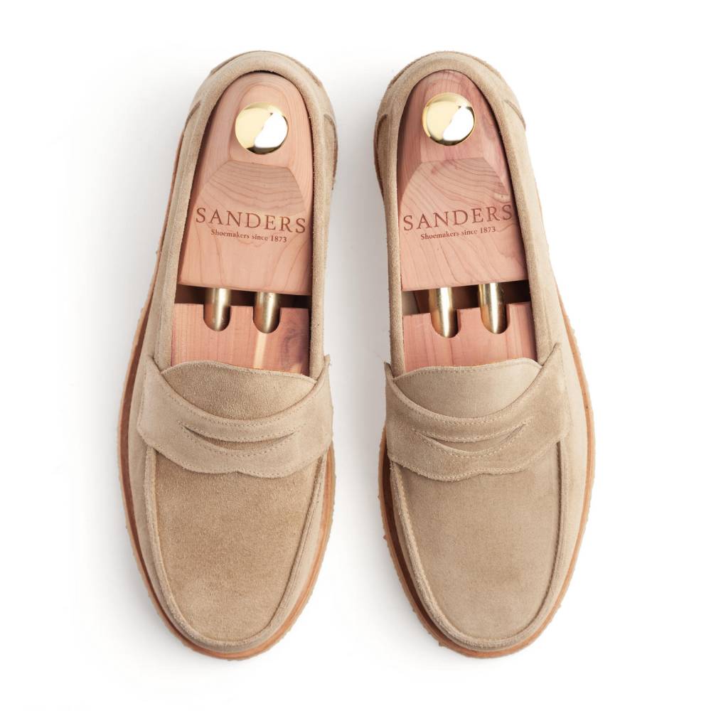 Лёгкие и гибкие замшевые пенни-лоферы без подкладки из коллекции Casual известного английского бренда Sanders. Верх выполнен из высококачественной замши бежевого цвета, поставляемой английской дубильней Charles F. Stead & Co. Креповая подошва выполнена из натурального каучука. Конструкция Goodyear Welted.