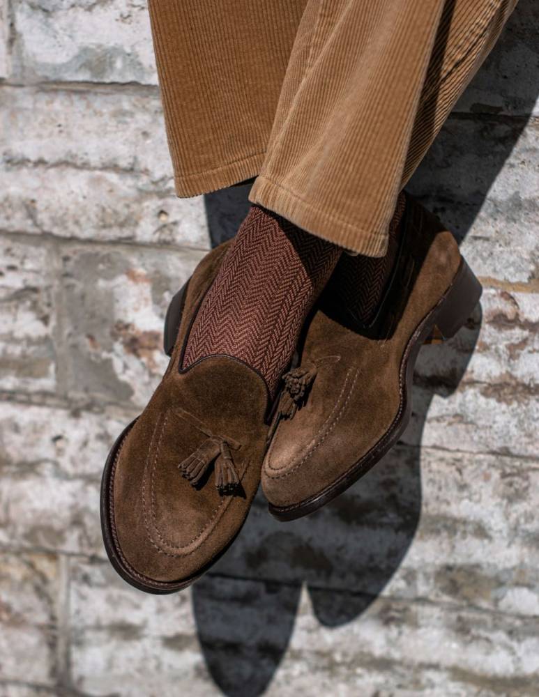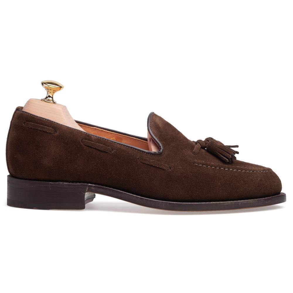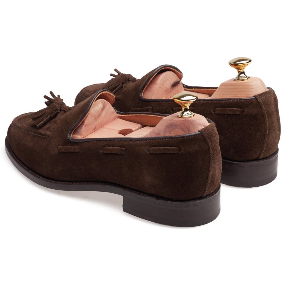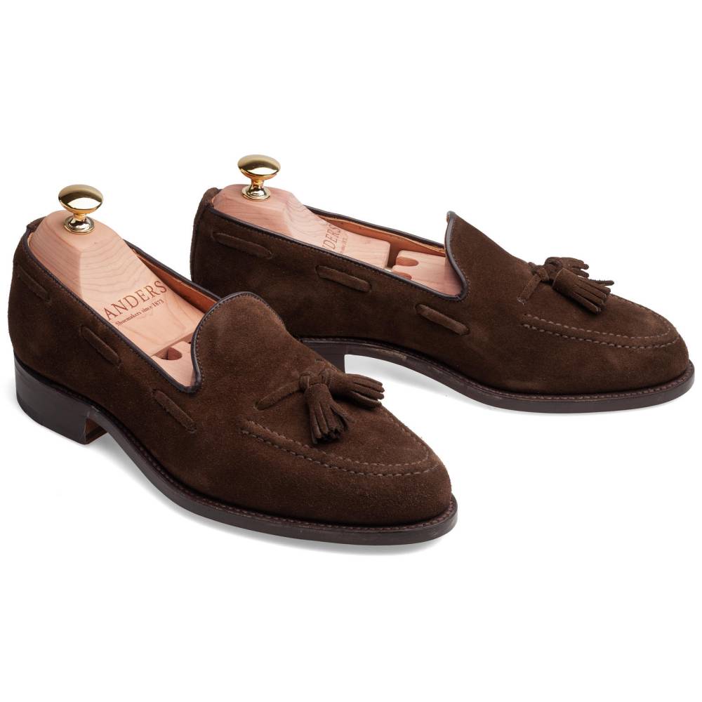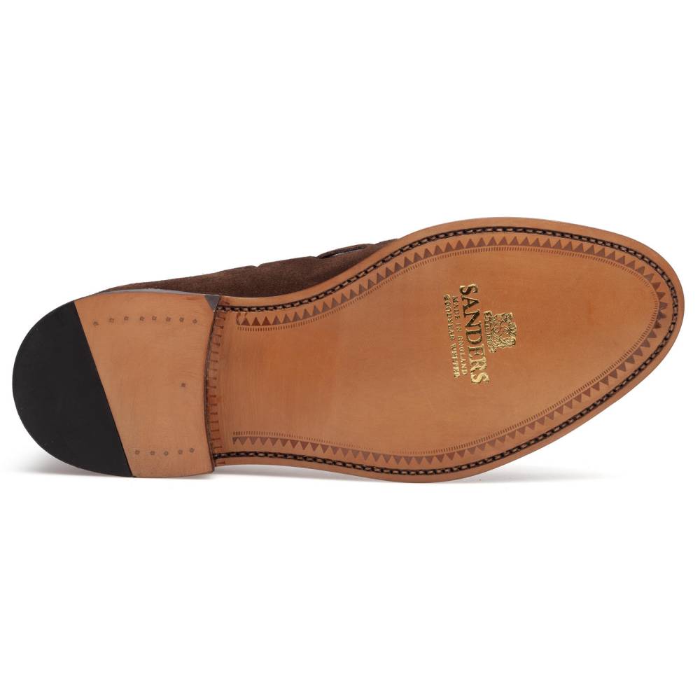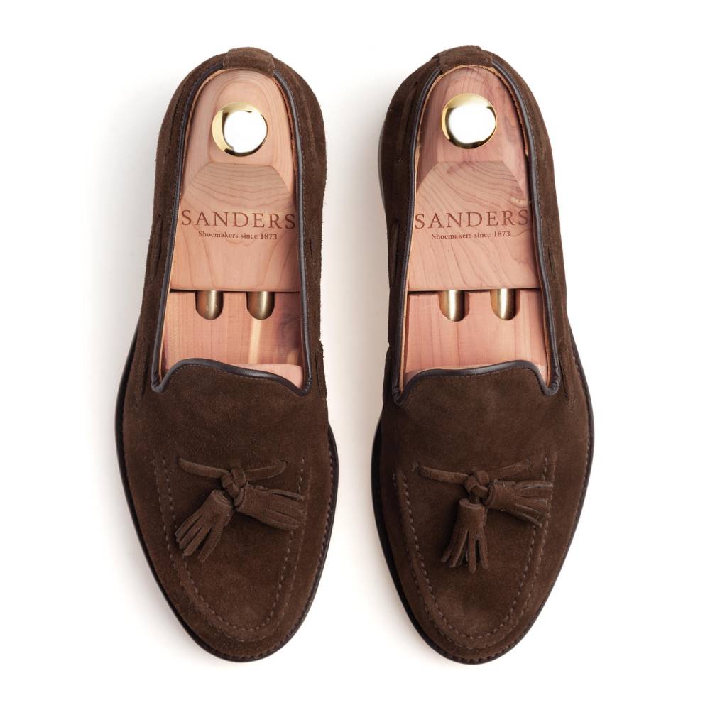 Элегантные мужские тассел-лоферы известной английской марки Sanders. Это классические лоферы с кисточками, сшитые из качественной и приятной на ощупь тёмно-коричневой замши, поставляемой английской дубильней Charles F. Stead & Co с дополнительной водоотталкивающей обработкой. Подкладка выполнена из тонкой бежевой кожи. Область пятки с внутренней стороны из фактурной кожи, что предотвращает скольжение. Конструкция Goodyear Welted.