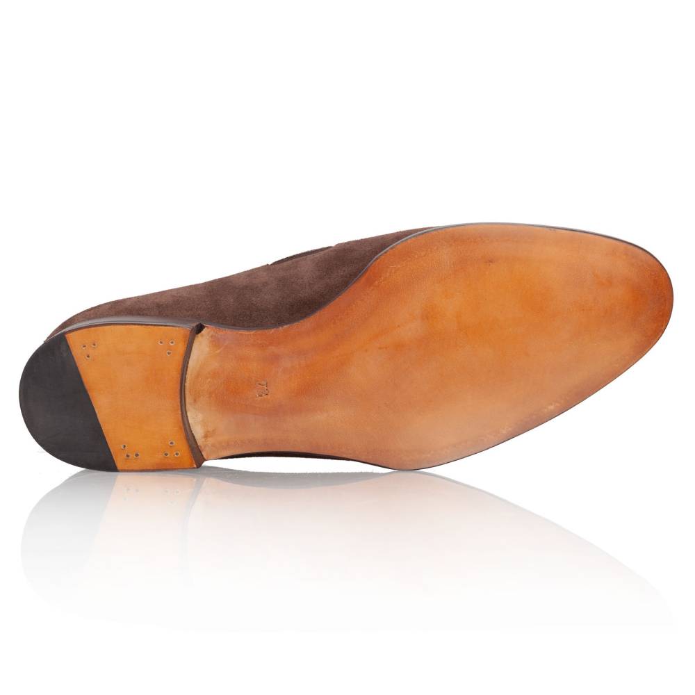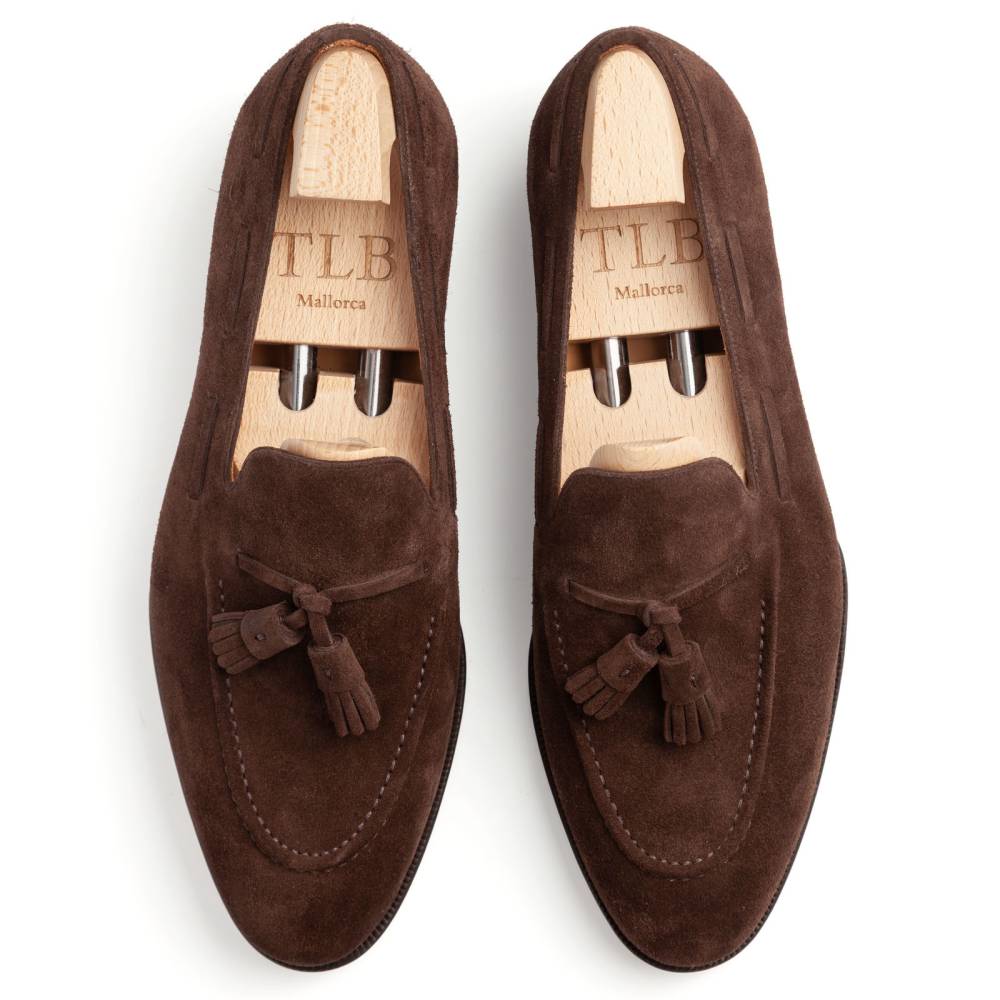 Элегантные лоферы с кисточками (Tassel) из коллекции Artista. Верх выполнен из высококачественной бархатистой замши тёмно-коричневого цвета, поставляемой английской дубильней Charles F. Stead. Подкладка и стелька — из тонкой телячьей кожи растительного дубления. Подошва — кожаная, с закрытым швом, что делает пару более утончённой и целостной. Конструкция Goodyear Welted.